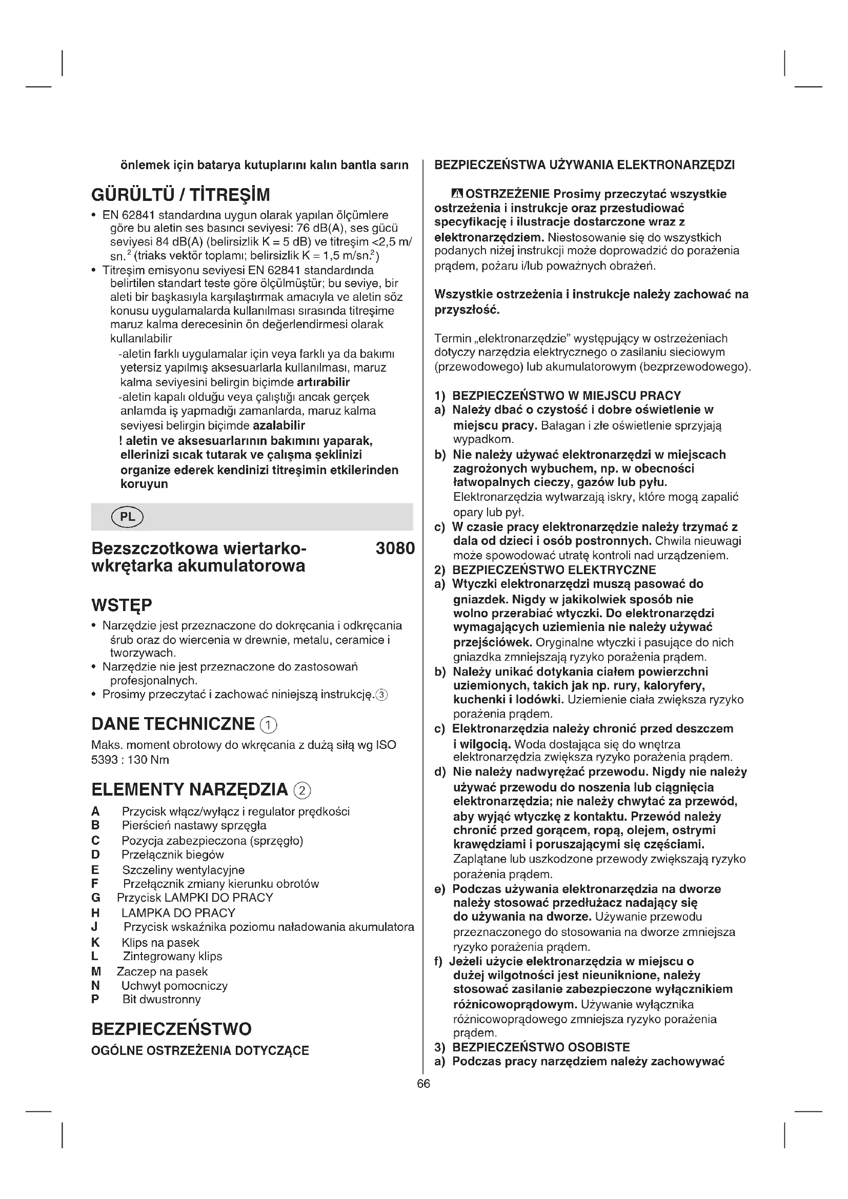 AKUMULATOROWYCH a) Do ładowania należy używać wyłącznie ładowarki wskazanej przez producenta. Użycie ładowarki pochodzącej od jednego akumulatora do ładowania innego akumulatora grozi pożarem. b) Elektronarzędzi należy używać wyłącznie z dedykowanymi do nich akumulatorami. Użycie jakichkolwiek innych akumulatorów grozi obrażeniami i pożarem. c) Jeżeli akumulator nie jest używany, należy go przechowywać z dala od innych przedmiotów metalowych, np. spinaczy, monet, kluczy, gwoździ, śrub i innych drobnych przedmiotów metalowych, które mogłyby spowodować zwarcie wyprowadzeń akumulatora. Zwarcie wyprowadzeń akumulatora może doprowadzić do oparzenia lub pożaru. d) W niesprzyjających warunkach może dojść do wycieku cieczy z akumulatora. Należy wtedy unikać wszelkiego kontaktu z tą cieczą. W razie przypadkowego kontaktu ze skórą, zabrudzone miejsce należy obcie przemyć wodą. Jeżeli płyn dostanie się do oczu, należy dodatkowo zasięgnąć porady lekarza. Płyn wyciekający z akumulatora może powodować podrażnienie lub oparzenia. e) Nie należy używać akumulatora lub narzędzia, które są uszkodzone lub zostały poddane przeróbkom. Uszkodzone lub zmodykowane akumulatory mogą zachowywać się w sposób nieprzewidywalny, co może doprowadzić do pożaru lub wybuchu lub stwarzać ryzyko urazów. f) Nie należy narażać akumulatora lub narzędzia na czujność, patrzeć, co się robi i kierować się zdrowym rozsądkiem. Nie należy używać elektronarzędzia, gdy użytkownik jest zmęczony, albo pod wpływem narkotyków, alkoholu lub leków. Chwila nieuwagi w czasie posługiwania się elektronarzędziami może spowodować poważne obrażenia. b) Należy używać środków ochrony osobistej. Należy zawsze nosić okulary ochronne. Stosowanie w odpowiednich warunkach sprzętu ochronnego takiego jak np. maska przeciwpyłowa, obuwie ochronne z podeszwami antypoślizgowymi, kask lub ochronniki słuchu zmniejszy ewentualne obrażenia. c) Nie należy dopuszczać do przypadkowego włączenia. Należy pilnować, aby przed podłączeniem narzędzia do zasilania i/lub baterii akumulatorowej oraz przed podniesieniem i przenoszeniem przełącznik był ustawiony w pozycji „wyłączone”. Przenoszenie elektronarzędzia z palcem na wyłączniku lub podłączanie do prądu elektronarzędzia z włączonym przełącznikiem może prowadzić do wypadków. d) Przed włączeniem elektronarzędzia należy usunąć wszystkie klucze regulacyjne i inne narzędzia. Klucz zaczepiony o obracającą się część elektronarzędzia może spowodować obrażenia. e) Nie należy sięgać za daleko. Należy zawsze dbać o utrzymanie równowagi i pewne podparcie nóg. W nieprzewidzianych sytuacjach zapewnia to lepszą kontrolę nad elektronarzędziem. f) Należy nosić odpowiednią odzież. Nie powinno się nosić luźnych ubrań ani biżuterii. Włosy i odzież należy trzymać w bezpiecznej odległości od poruszających się części. Luźne ubrania, biżuteria lub długie włosy mogą zaczepić się o poruszające się części. g) Jeżeli urządzenie jest przystosowane do podłączania do odsysacza pyłu i urządzenia zbierającego, należy dopilnować, aby systemy te były podłączone i właściwie stosowane. Używanie systemów służących do pochłaniania pyłu może zmniejszyć zagrożenia związane z pyłem. h) Nie wolno dopuścić do tego, aby poczucie znajomości narzędzia wynikające z jego częstego używania doprowadziło do lekceważenia i ignorowania zasad bezpieczeństwa. Jedno lekkomyślne działanie może w ułamku sekundy doprowadzić do ciężkich urazów.