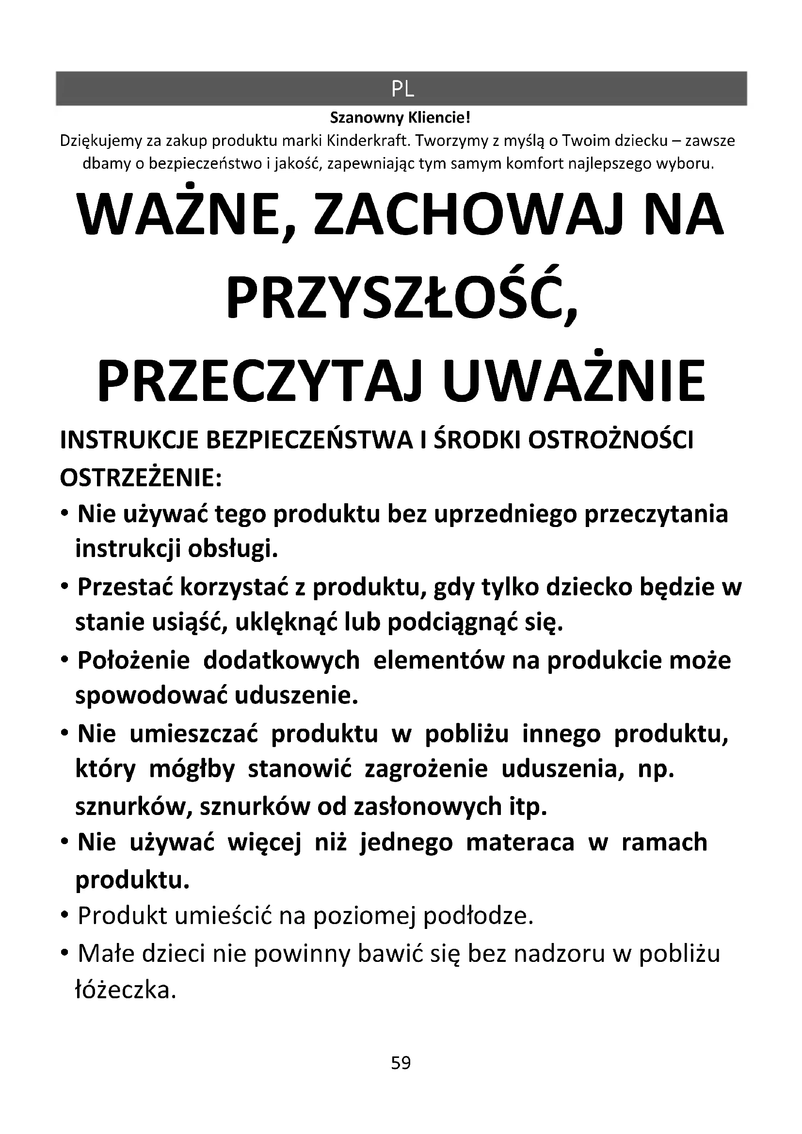 - Używać tylko materaca sprzedawanego wraz z tym łóżeczkiem, nie kłaść drugiego materaca na oryginalnym materacu, grozi to niebezpieczeństwem uduszenia.