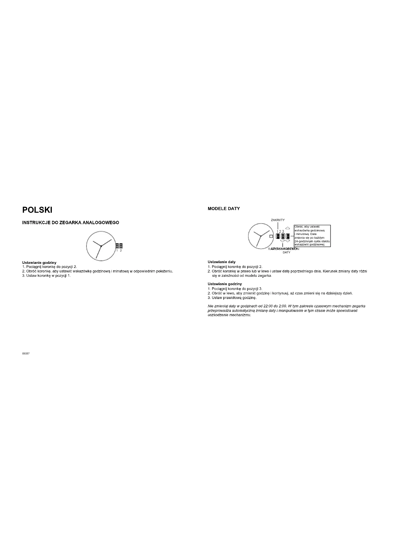 POLSKI POLISH MODELE DATY Ustawianie daty 1.Pociągnijkoronkędopozycji2. 2.Obróćkoronkęwprawolubwlewoiustawdatępoprzedniegodnia.Kierunekzmianydatyróżni sięwzależnościodmodeluzegarka. Ustawianie godziny 1.Pociągnijkoronkędopozycji3. 2.Obróćwlewo,abyzmienićgodzinęikontynuuj,ażczaszmienisięnadzisiejszydzień. 3.Ustawprawidłowągodzinę. Nie zmieniaj daty w godzinach od 22:00 do 2:00. W tym zakresie czasowym mechanizm zegarka przeprowadza automatyczną zmianę daty i manipulowanie w tym czasie może spowodować uszkodzenie mechanizmu.