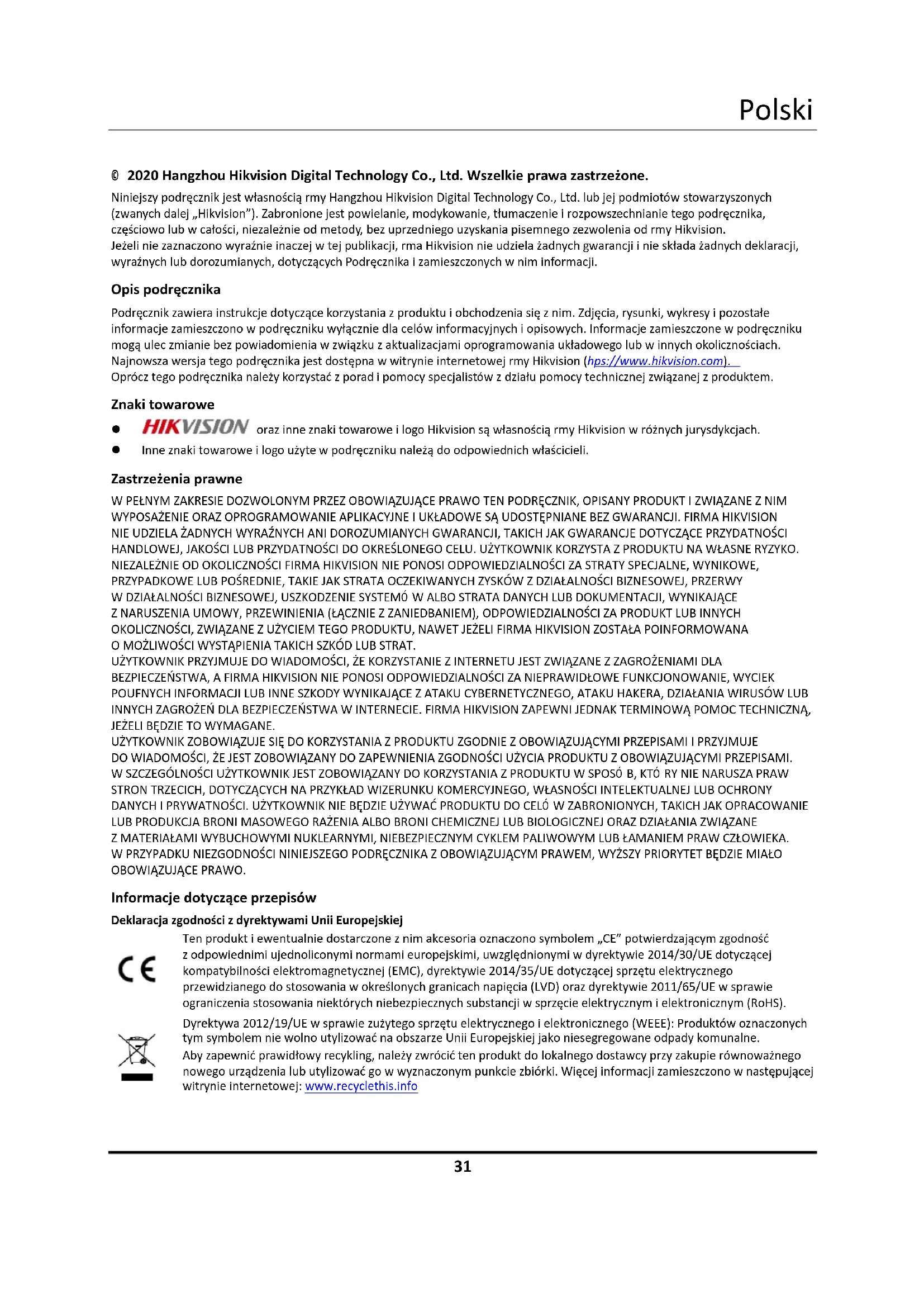 © 2020 Hangzhou Hikvision Digital Technology Co., Ltd. Wszelkie prawa zastrzeżone. Niniejszy podręcznik jest własnością firmy Hangzhou Hikvision Digital Technology Co., Ltd. lub jej podmiotów stowarzyszonych (zwanych dalej „Hikvision”). Zabronione jest powielanie, modyfikowanie, tłumaczenie i rozpowszechnianie tego podręcznika, częściowo lub w całości, niezależnie od metody, bez uprzedniego uzyskania pisemnego zezwolenia od firmy Hikvision. Jeżeli nie zaznaczono wyraźnie inaczej w tej publikacji, firma Hikvision nie udziela żadnych gwarancji i nie składa żadnych deklaracji, wyraźnych lub dorozumianych, dotyczących Podręcznika i zamieszczonych w nim informacji. Opis podręcznika Podręcznik zawiera instrukcje dotyczące korzystania z produktu i obchodzenia się z nim. Zdjęcia, rysunki, wykresy i pozostałe informacje zamieszczono w podręczniku wyłącznie dla celów informacyjnych i opisowych. Informacje zamieszczone w podręczniku mogą ulec zmianie bez powiadomienia w związku z aktualizacjami oprogramowania układowego lub w innych okolicznościach. Najnowsza wersja tego podręcznika jest dostępna w witrynie internetowej firmy Hikvision (https://www.hikvision.com). Oprócz tego podręcznika należy korzystać z porad i pomocy specjalistów z działu pomocy technicznej związanej z produktem. Znaki towarowe oraz inne znaki towarowe i logo Hikvision są własnością firmy Hikvision w różnych jurysdykcjach. Inne znaki towarowe i logo użyte w podręczniku należą do odpowiednich właścicieli. Zastrzeżenia prawne W PEŁNYM ZAKRESIE DOZWOLONYM PRZEZ OBOWIĄZUJĄCE PRAWO TEN PODRĘCZNIK, OPISANY PRODUKT I ZWIĄZANE Z NIM WYPOSAŻENIE ORAZ OPROGRAMOWANIE APLIKACYJNE I UKŁADOWE SĄ UDOSTĘPNIANE BEZ GWARANCJI. FIRMA HIKVISION NIE UDZIELA ŻADNYCH WYRAŹNYCH ANI DOROZUMIANYCH GWARANCJI, TAKICH JAK GWARANCJE DOTYCZĄCE PRZYDATNOŚCI HANDLOWEJ, JAKOŚCI LUB PRZYDATNOŚCI DO OKREŚLONEGO CELU. UŻYTKOWNIK KORZYSTA Z PRODUKTU NA WŁASNE RYZYKO. NIEZALEŻNIE OD OKOLICZNOŚCI FIRMA HIKVISION NIE PONOSI ODPOWIEDZIALNOŚCI ZA STRATY SPECJALNE, WYNIKOWE, PRZYPADKOWE LUB POŚREDNIE, TAKIE JAK STRATA OCZEKIWANYCH ZYSKÓW Z DZIAŁALNOŚCI BIZNESOWEJ, PRZERWY W DZIAŁALNOŚCI BIZNESOWEJ, USZKODZENIE SYSTEMÓ W ALBO STRATA DANYCH LUB DOKUMENTACJI, WYNIKAJĄCE Z NARUSZENIA UMOWY, PRZEWINIENIA (ŁĄCZNIE Z ZANIEDBANIEM), ODPOWIEDZIALNOŚCI ZA PRODUKT LUB INNYCH OKOLICZNOŚCI, ZWIĄZANE Z UŻYCIEM TEGO PRODUKTU, NAWET JEŻELI FIRMA HIKVISION ZOSTAŁA POINFORMOWANA O MOŻLIWOŚCI WYSTĄPIENIA TAKICH SZKÓD LUB STRAT. UŻYTKOWNIK PRZYJMUJE DO WIADOMOŚCI, ŻE KORZYSTANIE Z INTERNETU JEST ZWIĄZANE Z ZAGROŻENIAMI DLA BEZPIECZEŃSTWA, A FIRMA HIKVISION NIE PONOSI ODPOWIEDZIALNOŚCI ZA NIEPRAWIDŁOWE FUNKCJONOWANIE, WYCIEK POUFNYCH INFORMACJI LUB INNE SZKODY WYNIKAJĄCE Z ATAKU CYBERNETYCZNEGO, ATAKU HAKERA, DZIAŁANIA WIRUSÓW LUB INNYCH ZAGROŻEŃ DLA BEZPIECZEŃSTWA W INTERNECIE. FIRMA HIKVISION ZAPEWNI JEDNAK TERMINOWĄ POMOC TECHNICZNĄ, JEŻELI BĘDZIE TO WYMAGANE. UŻYTKOWNIK ZOBOWIĄZUJE SIĘ DO KORZYSTANIA Z PRODUKTU ZGODNIE Z OBOWIĄZUJĄCYMI PRZEPISAMI I PRZYJMUJE DO WIADOMOŚCI, ŻE JEST ZOBOWIĄZANY DO ZAPEWNIENIA ZGODNOŚCI UŻYCIA PRODUKTU Z OBOWIĄZUJĄCYMI PRZEPISAMI. W SZCZEGÓLNOŚCI UŻYTKOWNIK JEST ZOBOWIĄZANY DO KORZYSTANIA Z PRODUKTU W SPOSÓ B, KTÓ RY NIE NARUSZA PRAW STRON TRZECICH, DOTYCZĄCYCH NA PRZYKŁAD WIZERUNKU KOMERCYJNEGO, WŁASNOŚCI INTELEKTUALNEJ LUB OCHRONY DANYCH I PRYWATNOŚCI. UŻYTKOWNIK NIE BĘDZIE UŻYWAĆ PRODUKTU DO CELÓ W ZABRONIONYCH, TAKICH JAK OPRACOWANIE LUB PRODUKCJA BRONI MASOWEGO RAŻENIA ALBO BRONI CHEMICZNEJ LUB BIOLOGICZNEJ ORAZ DZIAŁANIA ZWIĄZANE Z MATERIAŁAMI WYBUCHOWYMI NUKLEARNYMI, NIEBEZPIECZNYM CYKLEM PALIWOWYM LUB ŁAMANIEM PRAW CZŁOWIEKA. W PRZYPADKU NIEZGODNOŚCI NINIEJSZEGO PODRĘCZNIKA Z OBOWIĄZUJĄCYM PRAWEM, WYŻSZY PRIORYTET BĘDZIE MIAŁO OBOWIĄZUJĄCE PRAWO. Informacje dotyczące przepisów Deklaracja zgodności z dyrektywami Unii Europejskiej