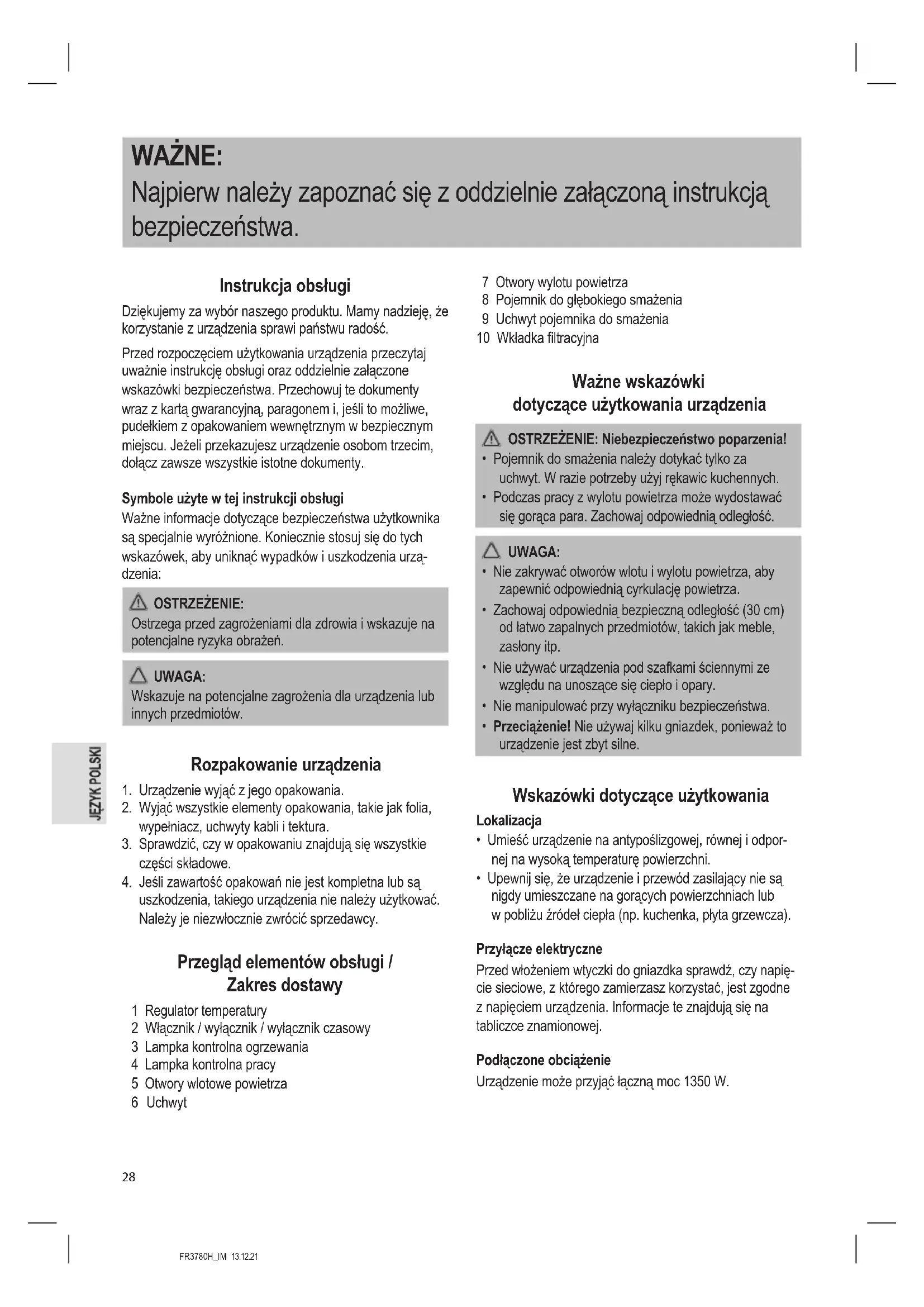 uszkodzenia, takiego urządzenia nie należy użytkować. Należy je niezwłocznie zwrócić sprzedawcy. Przegląd elementów obsługi / Zakres dostawy 1 Regulator temperatury 2 Włącznik / wyłącznik / wyłącznik czasowy 3 Lampka kontrolna ogrzewania 4 Lampka kontrolna pracy 5 Otwory wlotowe powietrza 6 Uchwyt 7 Otwory wylotu powietrza 8 Pojemnik do głębokiego smażenia 9 Uchwyt pojemnika do smażenia 10 Wkładka ltracyjna Ważne wskazówki dotyczące użytkowania urządzenia OSTRZEŻENIE: Niebezpieczeństwo poparzenia!