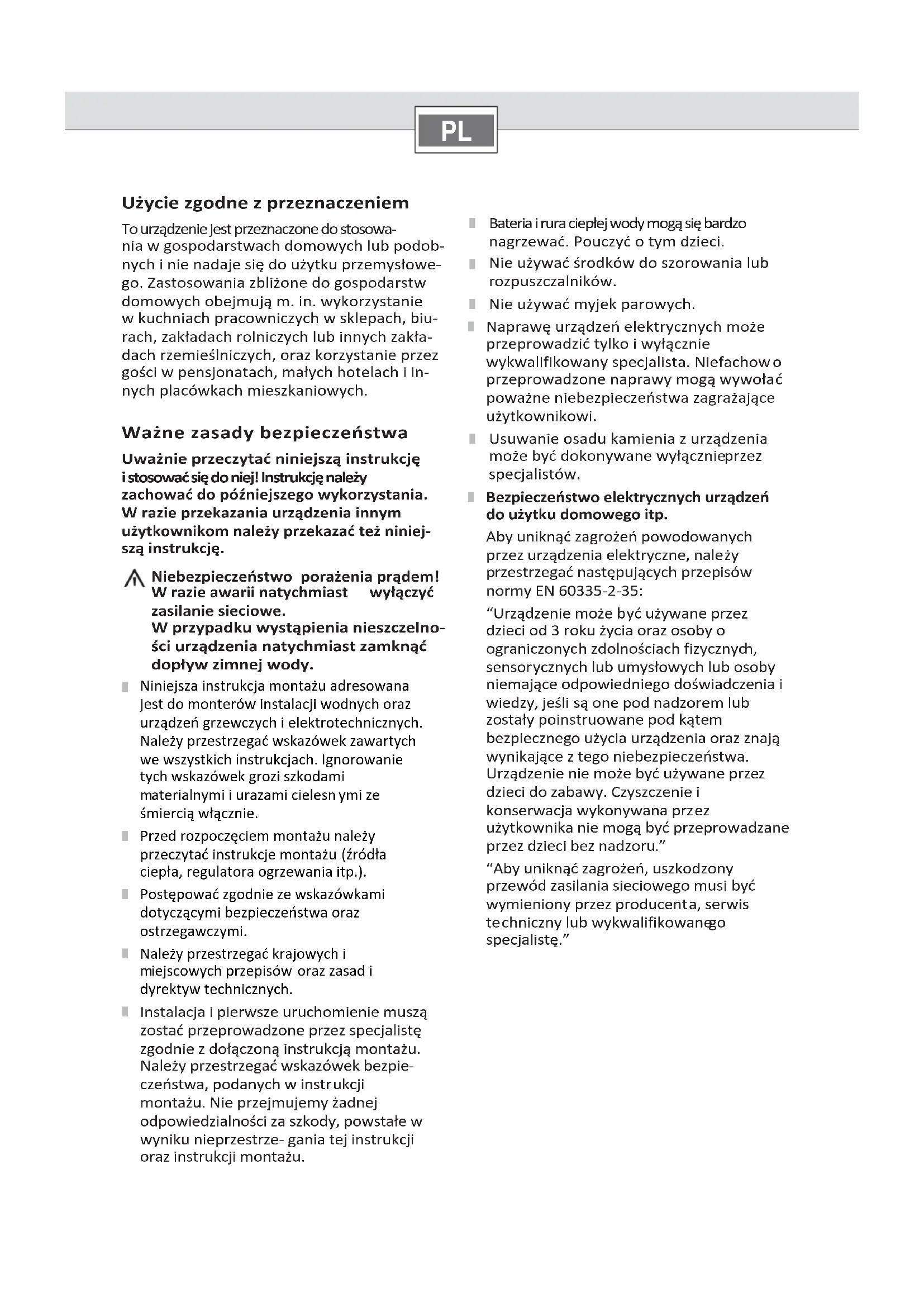 Ledstatusindicatorknippert rood. Foutinhetapparaat Deklantenservicebellen. Neemcontactopmetdeklantenservicealsdestoringnietkonwordenverholpen. Despecialistvandeklantenserviceverhelptde storing Storing Oorzaak Oplossing Onvoldoendewaterdoorstro‐ mingondanksreinigingvan hetzeefjeindewaterkraanof douchekop Eenzeefinhetapparaatisverstopt. Hetapparaatdooreenvakmanlatenreinigen. Destoringwordtautomatischverholpen Storing Oorzaak Oplossing Erstroomtgedurendekorte tijdkoudwater. Deluchtherkenninginhetapparaather‐ kentluchtinhetwaterenschakelthetver‐ warmingsvermogenvoorkortetijduit. Dedoorstroomgeiserga atnaenkeleseconden automatischweerinbedrijf. Garantie Voorditapparaatgeldendeinhetkooplanfuitgegeven garantievoorwaarden.DetailsdeeltUUwdealer,waarUhet apparaatheeftgekocht,opaanvragaltijdmee.Degebruik‐ makingvangarantievergoedingenvereisthetoverleggen vanhetkoopbewijsendenakomingvandegarantietermijn.PL Użyciezgodnezprzeznaczeniem Tourządzeniejestprzeznaczonedostosowa‐ niawgospodarstwachdomowychlubpodob‐ nychinienadajesiędoużytkuprzemysłowe‐ go.Zastosowaniazbliżonedogospodarstw domowychobejmująm.in.wykorzystanie wkuchniachpracowniczychwsklepach,biu‐ rach,zakładachrolniczychlubinnychzakła‐ dachrzemieślniczych,orazkorzystanieprzez gościwpensjonatach,małychhotelachiin‐ nychplacówkachmieszkaniowych. Ważnezasadybezpieczeństwa Uważnieprzeczytaćniniejsząinstrukcję istosowaćsiędoniej!Instrukcjęnależy zachowaćdopóźniejszegowykorzystania. Wrazieprzekazaniaurządzeniainnym użytkownikomnależyprzekazaćteżniniej‐ sząinstrukcję. Niebezpieczeństwoporażeniaprądem! Wrazieawariinatychmiast wyłączyć zasilaniesieciowe. Wprzypadkuwystąpienianieszczelno‐ ściurządzenianatychmiastzamknąć dopływzimnejwody.