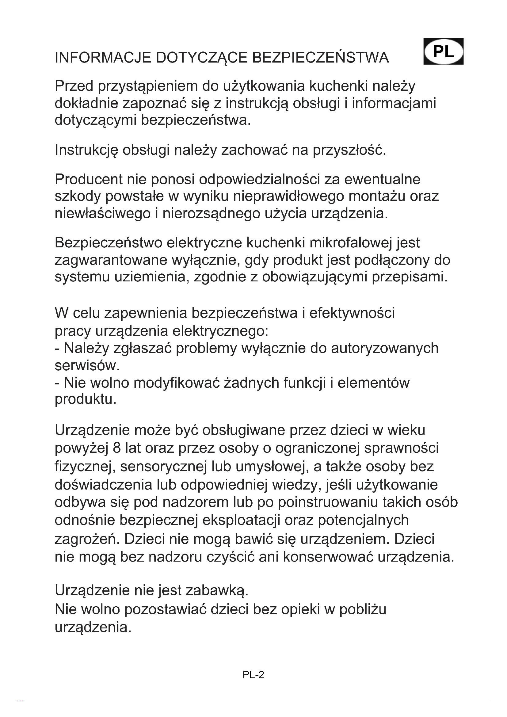 W celu zapewnienia bezpieczeństwa i efektywności pracy urządzenia elektrycznego: - Należy zgłaszać problemy wyłącznie do autoryzowanych serwisów. - Nie wolno modyfikować żadnych funkcji i elementów produktu. Urządzenie może być obsługiwane przez dzieci w wieku powyżej 8 lat oraz przez osoby o ograniczonej sprawności fizycznej, sensorycznej lub umysłowej, a także osoby bez doświadczenia lub odpowiedniej wiedzy, jeśli użytkowanie odbywa się pod nadzorem lub po poinstruowaniu takich osób odnośnie bezpiecznej eksploatacji oraz potencjalnych zagrożeń. Dzieci nie mogą bawić się urządzeniem. Dzieci nie mogą bez nadzoru czyścić ani konserwować urządzenia.