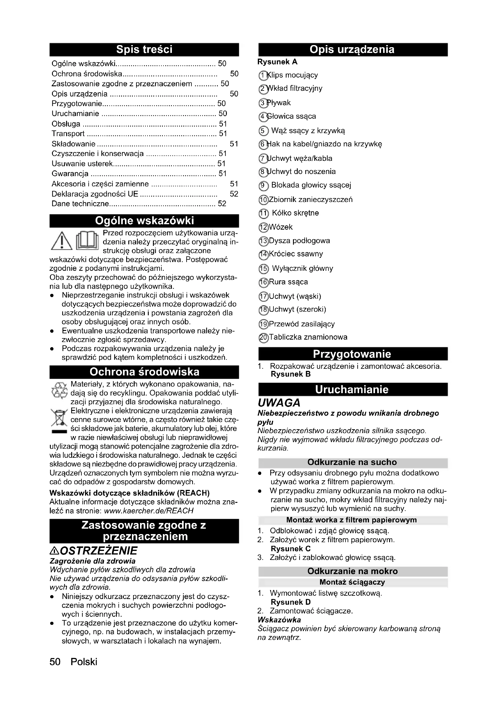 H05VV-F 2x1,0 H05VV-F 2x1,0 H05VV-F 2x1,0 Dalies numeris (EU) 9.770-820.0 9.770-820.0 9.770-820.0 Kabelio ilgis m 6,5 6,5 6,550 Polski Spis treści Ogólne wskazówki Przed rozpoczęciem użytkowania urzą- dzenia należy przeczytać oryginalną in- strukcję obsługi oraz załączone wskazówki dotyczące bezpieczeństwa. Postępować zgodnie z podanymi instrukcjami. Oba zeszyty przechować do późniejszego wykorzysta- nia lub dla następnego użytkownika. ● Nieprzestrzeganie instrukcji obsługi i wskazówek dotyczących bezpieczeństwa może doprowadzić do uszkodzenia urządzenia i powstania zagrożeń dla osoby obsługującej oraz innych osób. ● Ewentualne uszkodzenia transportowe należy nie- zwłocznie zgłosić sprzedawcy. ● Podczas rozpakowywania urządzenia należy je sprawdzić pod kątem kompletności i uszkodzeń. Ochrona środowiska Materiały, z których wykonano opakowania, na- dają się do recyklingu. Opakowania poddać utyli- zacji przyjaznej dla środowiska naturalnego. Elektryczne i elektroniczne urządzenia zawierają cenne surowce wtórne, a często również takie czę- ści składowe jak baterie, akumulatory lub olej, które w razie niewłaściwej obsługi lub nieprawidłowej utylizacji mogą stanowić potencjalne zagrożenie dla zdro- wia ludzkiego i środowiska naturalnego. Jednak te części składowe są niezbędne do prawidłowej pracy urządzenia. Urządzeń oznaczonych tym symbolem nie można wyrzu- cać do odpadów z gospodarstw domowych. Wskazówki dotyczące składników (REACH) Aktualne informacje dotyczące składników można zna- leźć na stronie: www.kaercher.de/REACH Zastosowanie zgodne z przeznaczeniem 몇 OSTRZEŻENIE Zagrożenie dla zdrowia Wdychanie pyłów szkodliwych dla zdrowia Nie używać urządzenia do odsysania pyłów szkodli- wych dla zdrowia. ● Niniejszy odkurzacz przeznaczony jest do czysz- czenia mokrych i suchych powierzchni podłogo- wych i ściennych. ● To urządzenie jest przeznaczone do użytku komer- cyjnego, np. na budowach, w instalacjach przemy- słowych, w warsztatach i lokalach na wynajem. Opis urządzenia Rysunek A 1 Klips mocujący 2 Wkład filtracyjny 3 Pływak 4 Głowica ssąca 5 Wąż ssący z krzywką 6 Hak na kabel/gniazdo na krzywkę 7 Uchwyt węża/kabla 8 Uchwyt do noszenia 9 Blokada głowicy ssącej 10 Zbiornik zanieczyszczeń 11 Kółko skrętne 12 Wózek 13 Dysza podłogowa 14 Króciec ssawny 15 Wyłącznik główny 16 Rura ssąca 17 Uchwyt (wąski) 18 Uchwyt (szeroki) 19 Przewód zasilający 20 Tabliczka znamionowa Przygotowanie