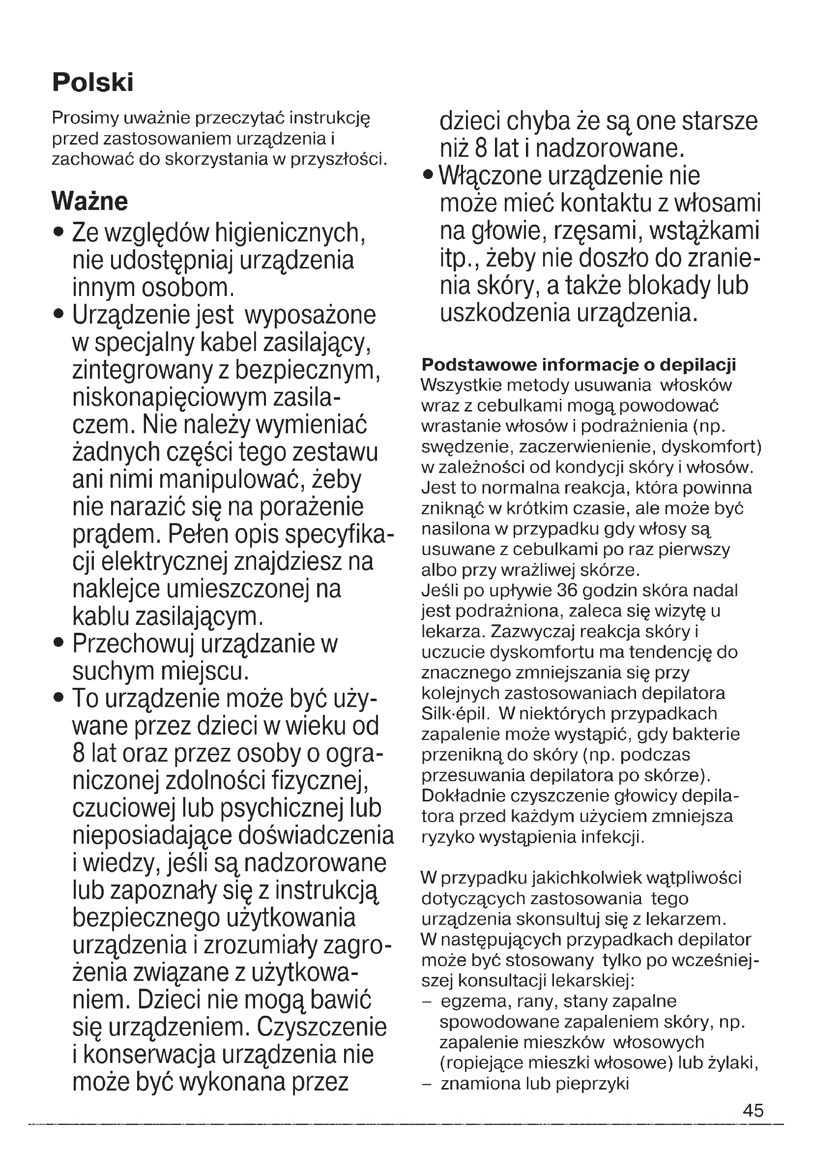 Włączone urządzenie nie może mieć kontaktu z włosami na głowie, rzęsami, wstążkami itp., żeby nie doszło do zranie- nia skóry, a także blokady lub uszkodzenia urządzenia. Podstawowe informacje o depilacji Wszystkie metody usuwania włosków wraz z cebulkami mogą powodować wrastanie włosów i podrażnienia (np. swędzenie, zaczerwienienie, dyskomfort) w zależności od kondycji skóry i włosów. Jest to normalna reakcja, która powinna zniknąć w krótkim czasie, ale może być nasilona w przypadku gdy włosy są usuwane z cebulkami po raz pierwszy albo przy wrażliwej skórze. Jeśli po upływie 36 godzin skóra nadal jest podrażniona, zaleca się wizytę u lekarza. Zazwyczaj reakcja skóry i uczucie dyskomfortu ma tendencję do znacznego zmniejszania się przy kolejnych zastosowaniach depilatora Silk·épil. W niektórych przypadkach zapalenie może wystąpić, gdy bakterie przenikną do skóry (np. podczas przesuwania depilatora po skórze). Dokładnie czyszczenie głowicy depila- tora przed każdym użyciem zmniejsza ryzyko wystąpienia infekcji. W przypadku jakichkolwiek wątpliwości dotyczących zastosowania tego urządzenia skonsultuj się z lekarzem. W następujących przypadkach depilator może być stosowany tylko po wcześniej- szej konsultacji lekarskiej: – egzema, rany, stany zapalne spowodowane zapaleniem skóry, np. zapalenie mieszków włosowych (ropiejące mieszki włosowe) lub żylaki, – znamiona lub pieprzyki Polski 91618385_SE_3273_3274_GROCERY_S6-60.indd 4591618385_SE_3273_3274_GROCERY_S6-60.indd 45 22.08.17 08:3022.08.17 08:30 CSS APPROVED Effective Date 25Aug2017 GMT - Printed 22Nov2017 Page 45 of 6046 – zmniejszona odporność skóry np. przy cukrzycy lub w czasie ciąży, choroba Raynauda – hemofilia lub brak odporności Depilacja jest łatwiejsza i bardziej komfortowa, gdy włosy mają optymalną długość: 2-5 mm. Jeśli są dłuższe, zaleca się, aby najpierw je zgolić (zobacz sekcja B), a po tygodniu usunąć odrasta- jące włoski depilatorem. Odrastające delikatne włoski czasami nie mogą się przedostać na powierzchnię skóry. Regularne masowanie gąbką (np. po wzięciu prysznica) lub stosowanie złuszczającego peelingu pomaga zapobiec wrastaniu włosów, ponieważ łagodny masaż usuwa naskórek, a wtedy delikatne włoski mogą wyrosnąć na powierzchnię. Opis 1 Wałki masujące z nasadkami 2 Głowica depilująca z pęsetami 3 Przycisk zwalniający głowicę 4 Włącznik/wyłącznik z wbudowaną lampką 5 Gniazdko 6 Specjalny kabel zasilający 7 Głowica goląca z nasadką i trymerem A Jak depilować