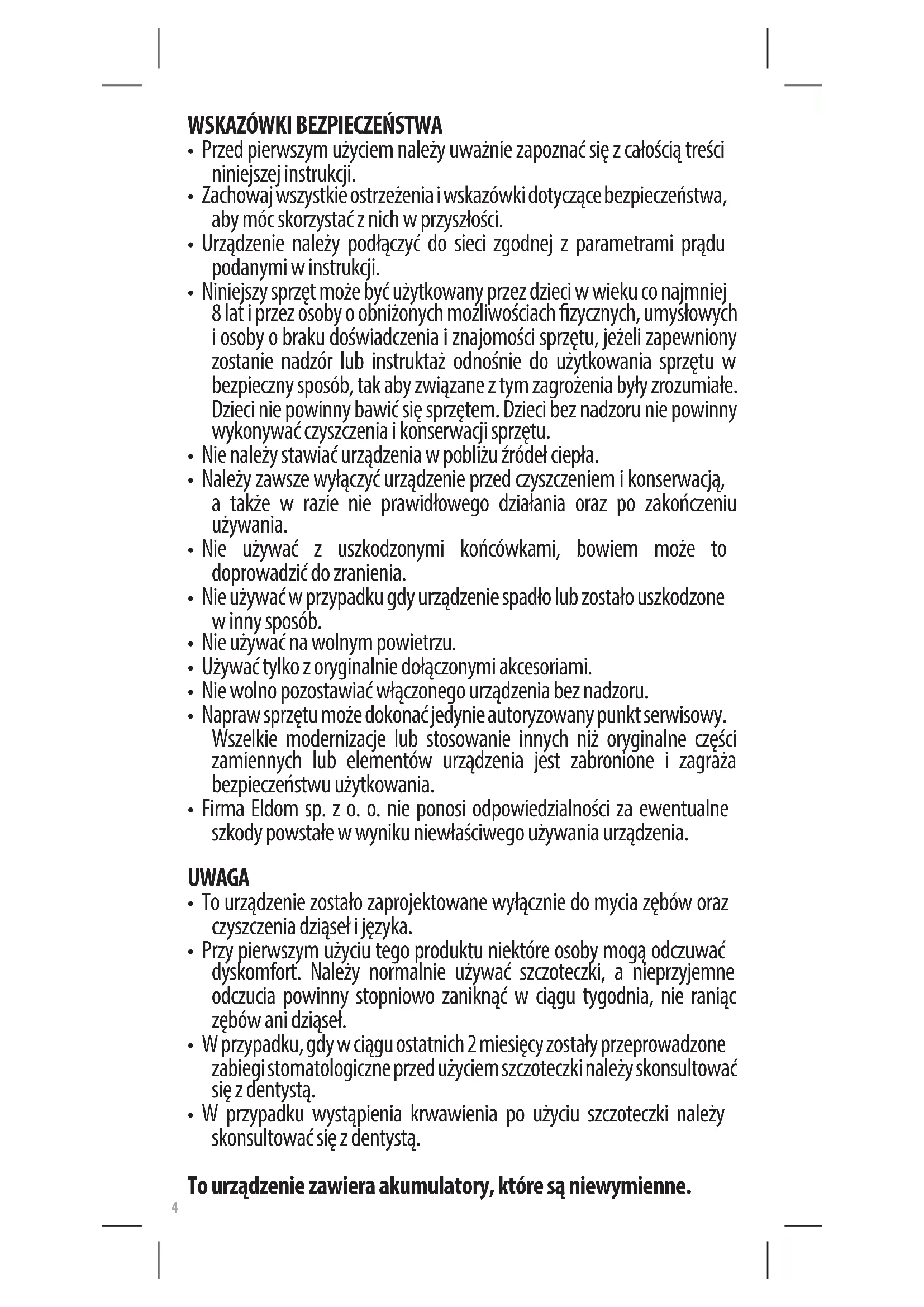 - W przypadku wystąpienia krwawienia po użyciu szczoteczki należy skonsultować się z dentystą. To urządzenie zawiera akumulatory, które są niewymienne.5 GWARANCJA Producent zapewnia dobrą jakość i dobre działanie sprzętu, którego dotyczy niniejsza gwarancja w okresie 24 miesięcy od daty sprzedaży zapisanej w dowodzie zakupu. Wady lub uszkodzenia sprzętu ujawnione w okresie gwarancji, będą naprawiane bezpłatnie na terenie RP w terminie 14 dni roboczych od daty dostarczenia niesprawnego urządzenia do punktu serwisowego wraz z dowodem zakupu. Reklamujący powinien dostarczyć uszkodzony sprzęt wraz z dowodem zakupu do centralnego punktu serwisowego na adres: Eldom Sp. z o.o. 40-238 Katowice, ul. Pawła Chromika 5A. Przesyłka powinna być należycie zabezpieczona (zaleca się użycie oryginalnego opakowania). Urządzenie można wysłać na koszt gwaranta – sposób wysyłki przedstawiony na stronie: https://www.eldom.eu/wsparcie/pomoc/jak-nalezy-wysylac- uszkodzony-sprzet-do-centrali-serwisowej Informacje o wysyłce można także uzyskać pod nr telefonu 32 253 04 13 lub mailowo: serwis@edom.eu Pojęcie “naprawa” nie obejmuje czynności wymienionych w instrukcji obsługi (np. czyszczenie lub konserwacja), do wykonania których zobowiązany jest użytkownik we własnym zakresie. Termin naprawy, w przypadku dostarczenia do centralnego punktu serwisowego wysyłką pocztową lub za innym pośrednictwem ulegnie przedłużeniu o czas niezbędny do dostarczenia i odbioru sprzętu. Gwarancją nie są objęte uszkodzenia powstałe w wyniku niewłaściwego lub niezgodnego z instrukcją jego użytkowania, przechowywania, konserwacji, samowolnego zrywania plomb, wszelkich uszkodzeń mechanicznych oraz na skutek naturalnego, częściowego lub całkowitego zużycia zgodnie z właściwościami lub przeznaczeniem towaru. Gwarancja nie obejmuje żarówek, baterii i akumulatorów. Gwarancja nie wyłącza, nie ogranicza ani nie zawiesza uprawnień kupującego wynikających z przepisów Ustawy z dnia 30.05.2014r. o prawach konsumenta oraz innych powszechnie obowiązujących przepisów prawa regulujących sprzedaż i odpowiedzialność producenta/ sprzedawcy za towar. Sprzęt przeznaczony jest wyłącznie dla konsumenta do prywatnego użytku w gospodarstwie domowym, w przypadku innego użytkowania traci gwarancję.6