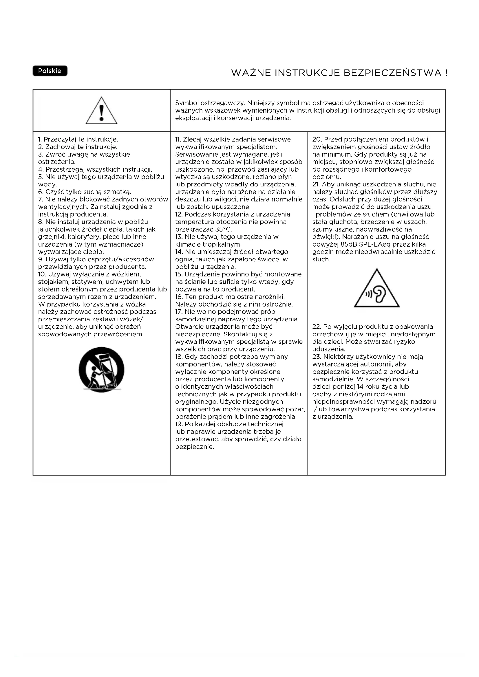 stojakiem, statywem, uchwytem lub stołem określonym przez producenta lub sprzedawanym razem z urządzeniem. W przypadku korzystania z wózka należy zachować ostrożność podczas przemieszczania zestawu wózek/ urządzenie, aby uniknąć obrażeń spowodowanych przewróceniem.