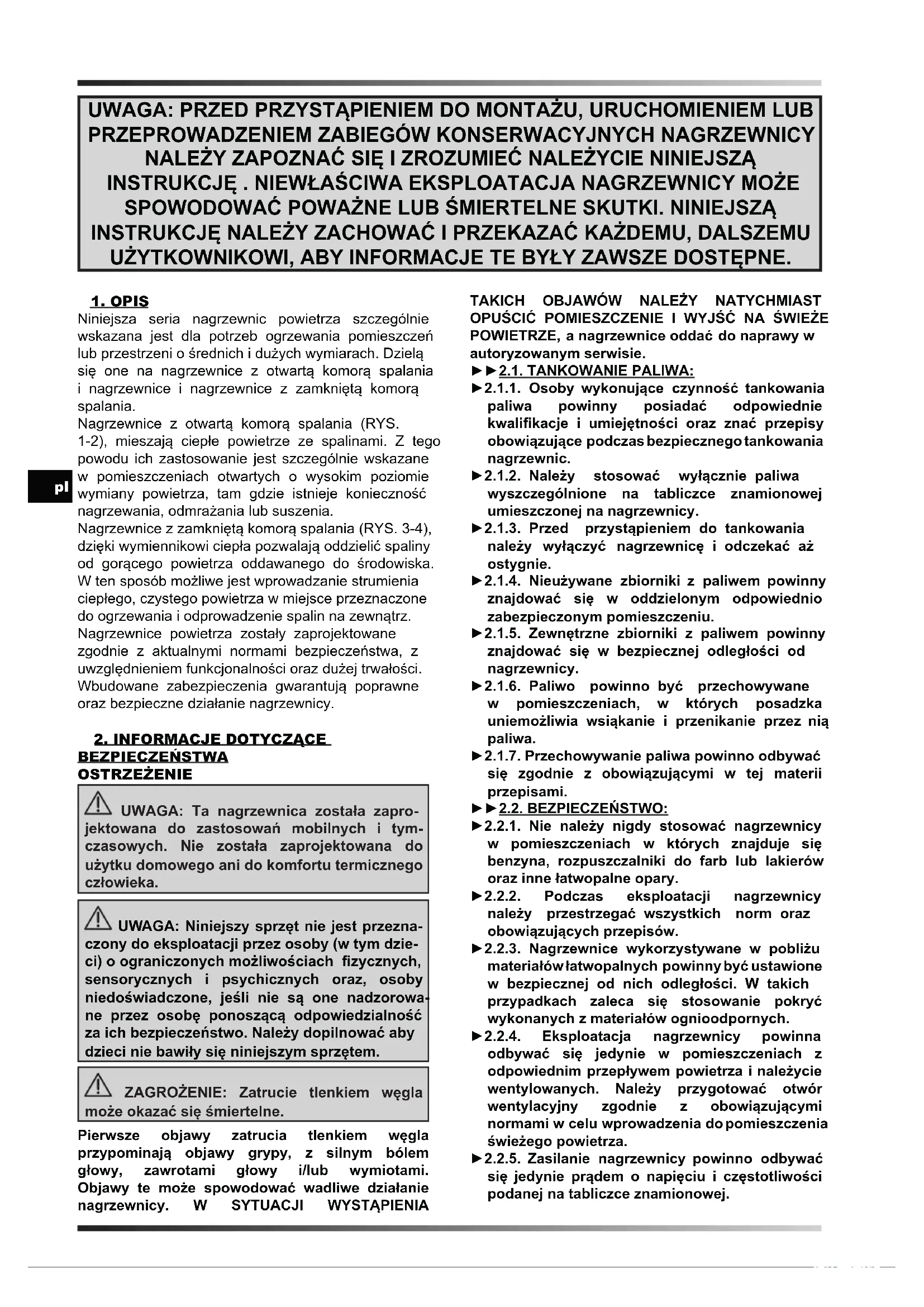 Niniejsza seria nagrzewnic powietrza szczególnie wskazana jest dla potrzeb ogrzewania pomieszczeń lub przestrzeni o średnich i dużych wymiarach. Dzielą się one na nagrzewnice z otwartą komorą spalania i nagrzewnice i nagrzewnice z zamkniętą komorą spalania. Nagrzewnice z otwartą komorą spalania (RYS. 1-2), mieszają ciepłe powietrze ze spalinami. Z tego powodu ich zastosowanie jest szczególnie wskazane w pomieszczeniach otwartych o wysokim poziomie wymiany powietrza, tam gdzie istnieje konieczność nagrzewania, odmrażania lub suszenia. Nagrzewnice z zamkniętą komorą spalania (RYS. 3-4), dzięki wymiennikowi ciepła pozwalają oddzielić spaliny od gorącego powietrza oddawanego do środowiska. W ten sposób możliwe jest wprowadzanie strumienia ciepłego, czystego powietrza w miejsce przeznaczone do ogrzewania i odprowadzenie spalin na zewnątrz. Nagrzewnice powietrza zostały zaprojektowane zgodnie z aktualnymi normami bezpieczeństwa, z uwzględnieniem funkcjonalności oraz dużej trwałości. Wbudowane zabezpieczenia gwarantują poprawne oraz bezpieczne działanie nagrzewnicy.