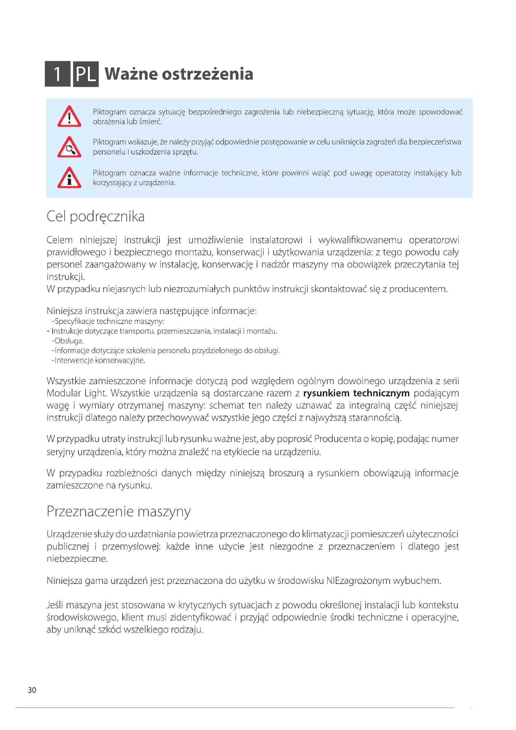 Normy bezpieczeństwa Umiejętności wymagane do obsługi i konserwacji maszyny Operator ogólny: UPOWAŻNIONY do obsługi maszyny za pomocą przycisków znajdujących się na klawiaturze elektrycznej rozdzielnicy sterowniczej. Wykonuje tylko operacje sterowania maszyną, włączanie/wyłączanie. Konserwator mechaniczny (wykwalifikowany): UPOWAŻNIONY do wykonywania interwencji konserwacyjnych, regulacji, wymiany i naprawy komponentów mechanicznych. Musi być osobą kompetentną w dziedzinie systemów mechanicznych, tj. być w stanie przeprowadzać konserwację mechaniczną w odpowiedni i bezpieczny sposób, musi posiadać wyszkolenie teoretyczne i doświadczenie praktyczne. NIE JEST UPOWAŻNIONY do interwencji na instalacjach elektrycznych. Technik producenta (wykwalifikowany): UPOWAŻNIONY do wykonywania operacji o złożonej naturze w każdej sytuacji. Wykonuje czynności w porozumieniu z użytkownikiem. Konserwator elektryczny (wykwalifikowany): UPOWAŻNIONY do wykonywania interwencji natury elektrycznej, regulacji, konserwacji i napraw elektrycznych. UPOWAŻNIONY do wykonywania czynności w obecności napięcia wewnątrz szaf i skrzynek przyłączeniowych. Musi być osobą kompetentną w dziedzinie elektroniki i elektrotechniki, tj. być w stanie przeprowadzać interwencje na systemach elektrycznych w odpowiedni i bezpieczny sposób, musi posiadać wyszkolenie teoretyczne i potwierdzone doświadczenie. NIE JEST UPOWAŻNIONY do interwencji na instalacjach mechanicznych. Umiejętności wymagane do zainstalowania maszyny Instalatorzy muszą wykonywać operacje w oparciu o swoje kwalifikacje zawodowe: wszelkie czynności wyłączone z ich kompetencji (np. wykonywanie połączeń elektrycznych) muszą być wykonywane przez określonych i wykwalifikowanych operatorów, aby nie zagrażać ich własnemu bezpieczeństwu i bezpieczeństwu innych operatorów, którzy wchodzą w interakcję ze sprzętem. Operator odpowiedzialny za transport i przemieszczanie maszyny: upoważniona osoba, posiadająca potwierdzone kompetencje w zakresie korzystania ze środków transportu i podnoszenia. Instalator techniczny: ekspert techniczny, wysłany lub upoważniony przez producenta lub jego upoważnionego przedstawiciela, posiadający odpowiednie umiejętności techniczne i przeszkolenie w zakresie instalacji maszyny. Asystent: technik obowiązany do należytej staranności podczas wykonywania podnoszenia i montażu maszyny. Musi być odpowiednio przeszkolony i poinformowany o planowanych operacjach oraz planach bezpieczeństwa na placu budowy/w miejscu instalacji. W niniejszej instrukcji, dla każdej operacji określony jest technik odpowiedzialny za jej wykonanie. Instalatorzy, użytkownicy i konserwatorzy NIE mogą wykonywać prac na maszynie, jeżeli: - charakteryzuje ich brak doświadczenia, odpowiedzialności lub są nieletni; - charakteryzuje ich upośledzenie fizyczne lub nie są w doskonałym stanie psychiczno-fizycznym; - nie są obeznajmieni z cyklem roboczym maszyny; - nie uczestniczyli w teoretycznym/praktycznym kursie szkoleniowym przy udziale doświadczonego operatora maszyny lub przy wsparciu technika producenta. W niniejszej instrukcji, dla każdej operacji określony jest technik odpowiedzialny za jej wykonanie.32 Przed instalacją, użytkowaniem i konserwacją urządzenia należy uważnie przeczytać niniejszą instrukcję i zachować ją na wypadek konieczności odniesienia się do niej w przyszłości przez innych operatorów. Nie usuwać, nie wyrywać ani nie edytować części niniejszej instrukcji bez podania przyczyny. Wszystkie czynności związane z instalacją, montażem, podłączeniem do sieci i zwyczajną/ nadzwyczajną konserwacją mogą być wykonywane wyłącznie przez techników, którzy spełniają wymogi prawne, po uprzednim wyłączeniu elektrycznym urządzenia i przy użyciu środków ochrony osobistej (np. rękawic, okularów ochronnych itp.), zgodnie z przepisami obowiązującymi w kraju użytkowania i z uwzględnieniem przepisów dotyczących systemów i bezpieczeństwa w miejscu pracy. Instalacja, użytkowanie lub konserwacja inne niż wskazano w instrukcji mogą powodować szkody, obrażenia ciała lub wypadki śmiertelne, powodują unieważnienie gwarancji i zwalniają producenta z wszelkiej odpowiedzialności. Podczas przenoszenia lub instalacji urządzenia należy używać odzieży ochronnej i sprzętu odpowiedniego do tego celu, aby nie dopuścić do wypadków i zagwarantować bezpieczeństwo własne i innych osób. Podczas montażu lub konserwacji maszyny NIE jest dozwolone poruszanie się lub przebywanie osób niewyznaczonych do instalacji w pobliżu miejsca wykonywania prac. Przed przystąpieniem do jakichkolwiek prac instalacyjnych lub konserwacyjnych należy odłączyć urządzenie od źródła zasilania elektrycznego. Przed instalacją urządzenia należy upewnić się, że instalacje są zgodne z przepisami obowiązującymi w kraju użytkowania i z danymi wskazanymi na tabliczce znamionowej. Obowiązkiem użytkownika / instalatora jest zapewnienie stabilności statycznej i dynamicznej instalacji oraz przygotowanie pomieszczeń w taki sposób, aby osoby niekompetentne ani nieupoważnione NIE miały dostępu do maszyny ani do jej przycisków. Obowiązkiem użytkownika/instalatora jest zapewnienie, że warunki pogodowe nie zagrażają bezpieczeństwu ludzi i mienia podczas etapów instalacji, obsługi i konserwacji. Upewnić się, że zasysanie powietrza nie odbywa się w pobliżu wylotów, spalin lub innych czynników zanieczyszczających. NIE instalować urządzeń w miejscach narażonych na silny wiatr, zasolenie, wolny ogień i temperatury przekraczające 40°C (104°F). Po zakończeniu instalacji poinformować użytkownika na temat prawidłowej obsługi urządzenia. Jeśli urządzenie nie działa lub zauważone zostaną jakiekolwiek zmiany funkcjonalne lub konstrukcyjne, należy odłączyć je od źródła zasilania i skontaktować się z centrum se