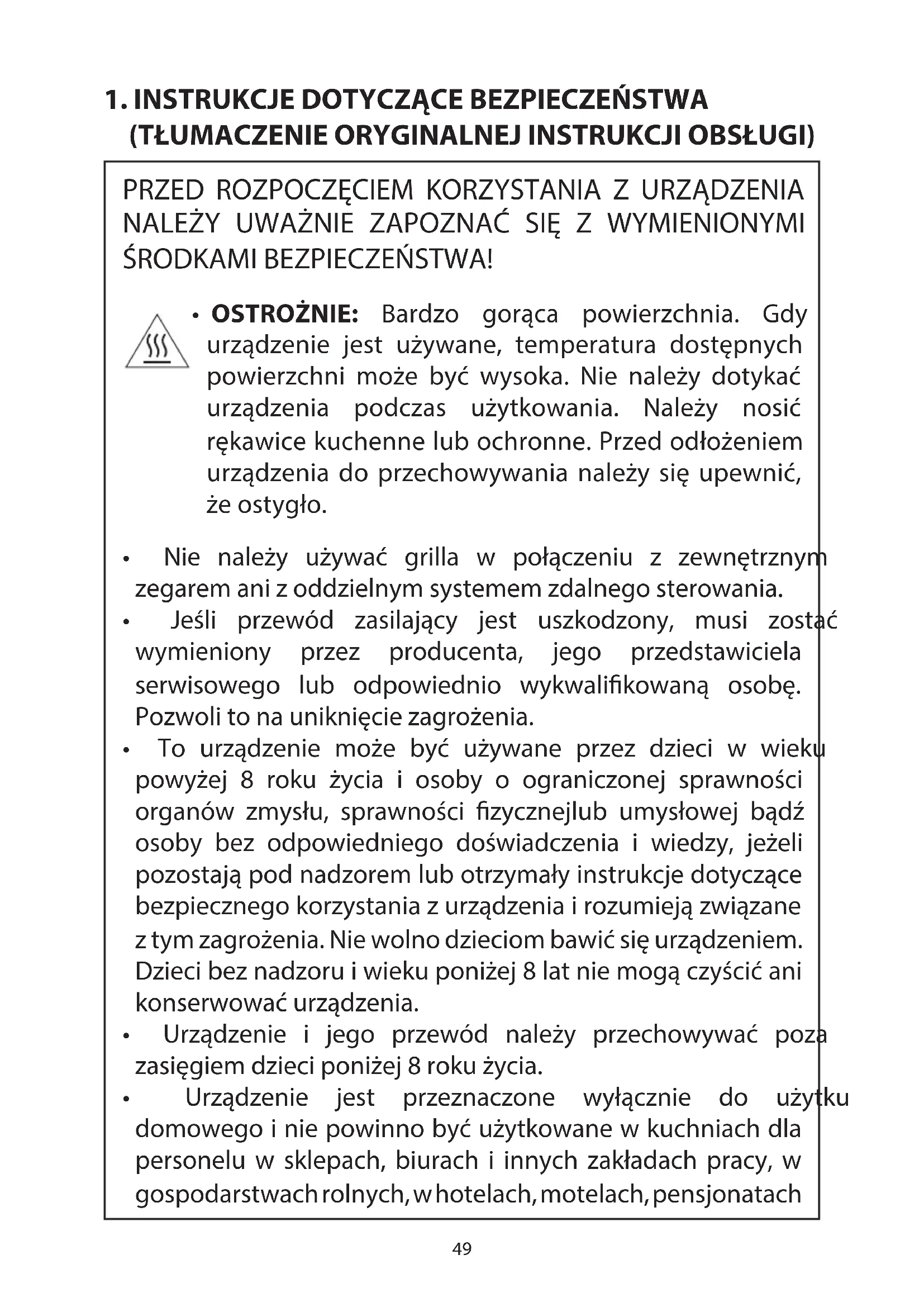 - To urządzenie może być używane przez dzieci w wieku powyżej 8 roku życia i osoby o ograniczonej sprawności organów zmysłu, sprawności zycznejlub umysłowej bądź osoby bez odpowiedniego doświadczenia i wiedzy, jeżeli pozostają pod nadzorem lub otrzymały instrukcje dotyczące bezpiecznego korzystania z urządzenia i rozumieją związane z tym zagrożenia. Nie wolno dzieciom bawić się urządzeniem. Dzieci bez nadzoru i wieku poniżej 8 lat nie mogą czyścić ani konserwować urządzenia.