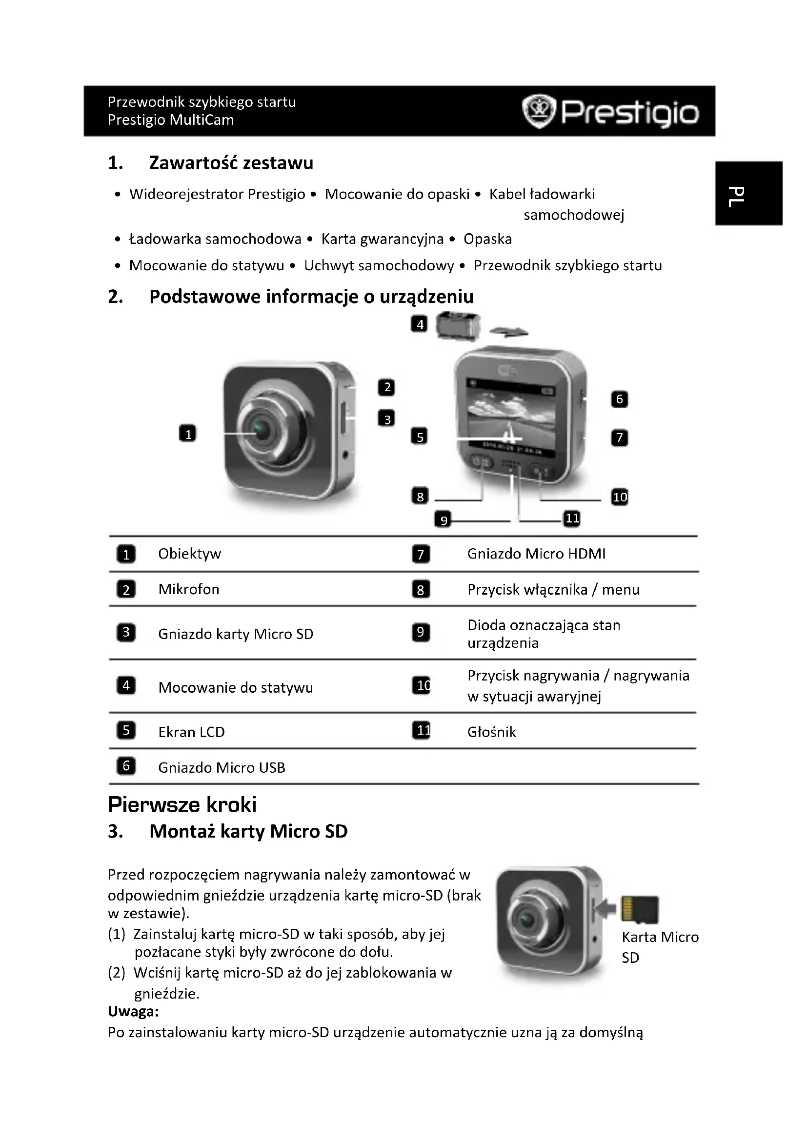 Przed rozpoczęciem nagrywania należy zamontować w odpowiednim gnieździe urządzenia kartę micro-SD (brak w zestawie). (1) Zainstaluj kartę micro-SD w taki sposób, aby jej pozłacane styki były zwrócone do dołu. (2) Wciśnij kartę micro-SD aż do jej zablokowania w gnieździe. Uwaga: Po zainstalowaniu karty micro-SD urządzenie automatycznie uzna ją za domyślnąPrzewodnik szybkiego startu Prestigio MultiCam