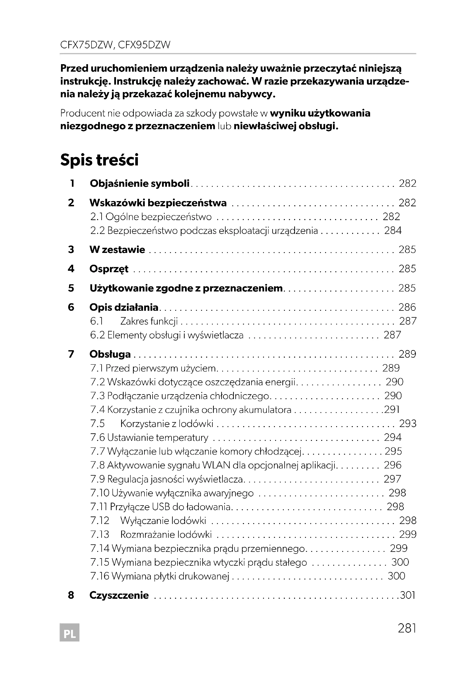- Uruchamianie urządzenia jest zabronione, gdy ma ono widoczne uszkodzenia. NIEBEZPIECZEŃSTWO! Wskazówka dot. bezpieczeństwa: Nieprzestrzeganie powoduje śmierć lub ciężkie obrażenia ciała. OSTRZEŻENIE! Wskazówka dot. bezpieczeństwa: Nieprzestrzeganie może prowadzić do śmierci lub ciężkich obrażeń ciała. OSTROŻNIE! Wskazówka dot. bezpieczeństwa: Nieprzestrzeganie może prowadzić do obrażeń ciała. UWAGA! Nieprzestrzeganie może prowadzić do powstania szkód materialnych i zakłóceń w działaniu produktu. WSKAZÓWKA Informacje uzupełniające dot. obsługi produktu. CFX75_95DZW--O-16s.book Seite 282 Montag, 14. August 2017 4:29 16PL CFX75DZW, CFX95DZW Wskazówki bezpieczeństwa