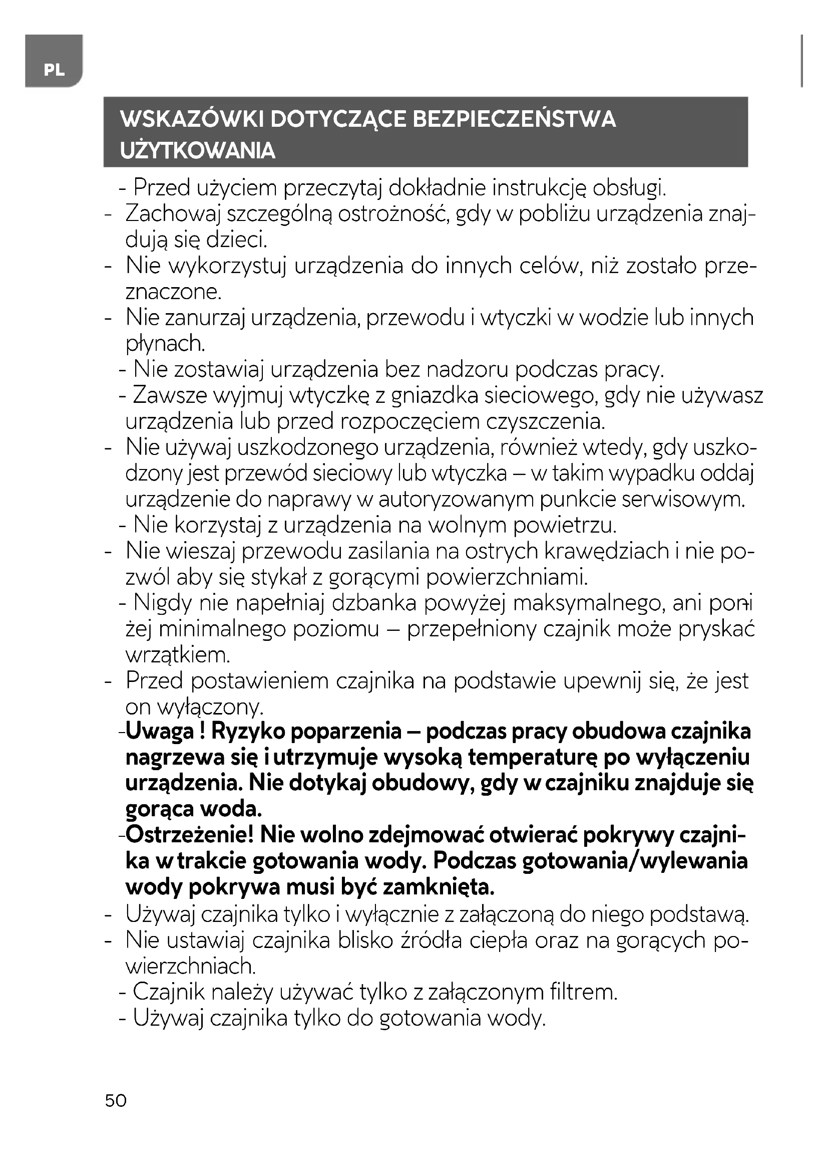 Uwaga ! Ryzyko poparzenia – podczas pracy obudowa czajnika nagrzewa się iutrzymuje wysoką temperaturę po wyłączeniu urządzenia. Nie dotykaj obudowy, gdy wczajniku znajduje się gorąca woda.