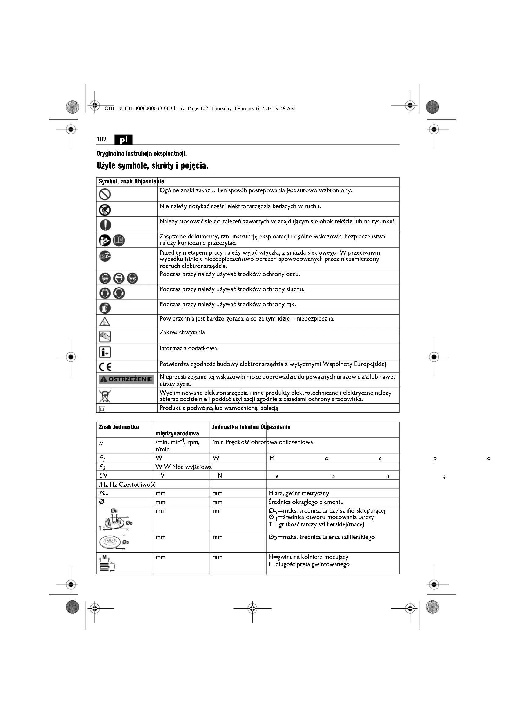 Oryginalna instrukcja eksploatacji. Użyte symbole, skróty i pojęcia. Symbol, znak Objaśnienie Ogólne znaki zakazu. Ten sposób postępowania jest surowo wzbroniony. Nie należy dotykać części elektronarzędzia będących w ruchu. Należy stosować się do zaleceń zawartych w znajdującym się obok tekście lub na rysunku! Załączone dokumenty, tzn. instrukcję eksploatacji i ogólne wskazówki bezpieczeństwa należy koniecznie przeczytać. Przed tym etapem pracy należy wyjąć wtyczkę z gniazda sieciowego. W przeciwnym wypadku istnieje niebezpieczeństwo obrażeń spowodowanych przez niezamierzony rozruch elektronarzędzia. Podczas pracy należy używać środków ochrony oczu. Podczas pracy należy używać środków ochrony słuchu. Podczas pracy należy używać środków ochrony rąk. Powierzchnia jest bardzo gorąca. a co za tym idzie – niebezpieczna. Zakres chwytania Informacja dodatkowa. Potwierdza zgodność budowy elektronarzędzia z wytycznymi Wspólnoty Europejskiej. Nieprzestrzeganie tej wskazówki może doprowadzić do poważnych urazów ciała lub nawet utraty życia. Wyeliminowane elektronarzędzia i inne produkty elektrotechniczne i elektryczne należy zbierać oddzielnie i poddać utylizacji zgodnie z zasadami ochrony środowiska. Produkt z podwójną lub wzmocnioną izolacją Znak Jednostka międzynarodowa Jednostka lokalna Objaśnienie