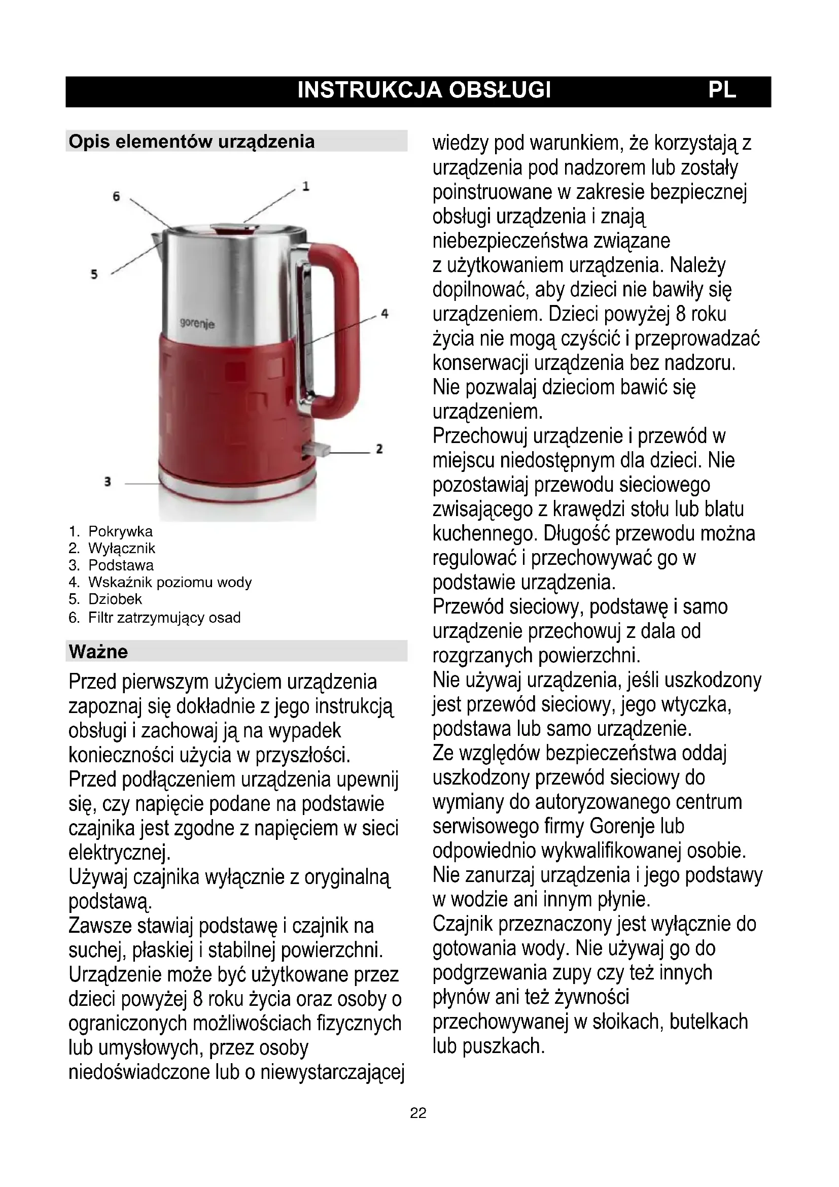 Ważne Przed pierwszym użyciem urządzenia zapoznaj się dokładnie z jego instrukcją obsługi i zachowaj ją na wypadek konieczności użycia w przyszłości. Przed podłączeniem urządzenia upewnij się, czy napięcie podane na podstawie czajnika jest zgodne z napięciem w sieci elektrycznej. Używaj czajnika wyłącznie z oryginalną podstawą. Zawsze stawiaj podstawę i czajnik na suchej, płaskiej i stabilnej powierzchni. Urządzenie może być użytkowane przez dzieci powyżej 8 roku życia oraz osoby o ograniczonych możliwościach fizycznych lub umysłowych, przez osoby niedoświadczone lub o niewystarczającej wiedzy pod warunkiem, że korzystają z urządzenia pod nadzorem lub zostały poinstruowane w zakresie bezpiecznej obsługi urządzenia i znają niebezpieczeństwa związane z użytkowaniem urządzenia. Należy dopilnować, aby dzieci nie bawiły się urządzeniem. Dzieci powyżej 8 roku życia nie mogą czyścić i przeprowadzać konserwacji urządzenia bez nadzoru. Nie pozwalaj dzieciom bawić się urządzeniem. Przechowuj urządzenie i przewód w miejscu niedostępnym dla dzieci. Nie pozostawiaj przewodu sieciowego zwisającego z krawędzi stołu lub blatu kuchennego. Długość przewodu można regulować i przechowywać go w podstawie urządzenia. Przewód sieciowy, podstawę i samo urządzenie przechowuj z dala od rozgrzanych powierzchni. Nie używaj urządzenia, jeśli uszkodzony jest przewód sieciowy, jego wtyczka, podstawa lub samo urządzenie. Ze względów bezpieczeństwa oddaj uszkodzony przewód sieciowy do wymiany do autoryzowanego centrum serwisowego firmy Gorenje lub odpowiednio wykwalifikowanej osobie. Nie zanurzaj urządzenia i jego podstawy w wodzie ani innym płynie. Czajnik przeznaczony jest wyłącznie do gotowania wody. Nie używaj go do podgrzewania zupy czy też innych płynów ani też żywności przechowywanej w słoikach, butelkach lub puszkach.23 Gorąca woda może spowodować poważne oparzenia. Zachowaj ostrożność, gdy w czajniku znajduje się gorąca woda. Nigdy nie napełniaj czajnika powyżej wskazania maksymalnego poziomu. W przypadku nadmiernego napełnienia czajnika wrząca woda może wydostać się przez dziobek i spowodować oparzenia. Nie podnoś pokrywki czajnika podczas gotowania wody. Przy unoszeniu pokrywki tuż po zagotowaniu wody zachowaj ostrożność, gdyż wydostająca się z czajnika para jest bardzo gorąca. Nie dotykaj obudowy czajnika, ponieważ nagrzewa się ona do wysokiej temperatury. Czajnik podnoś, trzymając go za rączkę. Zawsze upewnij się, że woda w czajniku zakrywa całe dno czajnika, aby zapobiec wyparowaniu całej wody z urządzenia. Na dnie czajnika może zbierać się skroplona para wodna. Jest to zupełnie normalne zjawisko, które nie świadczy o jakimkolwiek uszkodzeniu urządzenia. Zależnie od stopnia twardości wody w okolicy po pewnym czasie na elemencie grzejnym czajnika mogą pojawić się małe plamy. Jest to wynik stopniowego osadzania się kamienia wapiennego na elemencie grzejnym i wewnątrz czajnika. Im twardsza woda, tym szybciej osadza się kamień, który może być różnego koloru. Mimo że jest on nieszkodliwy, zbyt duża jego ilość może negatywnie wpływać na funkcjonowanie czajnika. Regularnie usuwaj kamień, postępując zgodnie ze wskazówkami zamieszczonymi w rozdziale „Usuwanie kamienia”. Urządzenie to oznaczono zgodnie z europejską wytyczną 2012/19/EU o zużytych urządzeniach elektrycznych i elektronicznych (waste electrical and electronic equipment - WEEE). Wytyczna ta określa ramy obowiązującego w całej Unii Europejskiej odbioru i wtórnego wykorzystania starych urządzeń. Pola elektromagnetyczne (EMF) Niniejsze urządzenie firmy Gorenje spełnia wszystkie normy dotyczące pól elektromagnetycznych. W przypadku prawidłowej obsługi zgodnie z zaleceniami zawartymi w instrukcji urządzenie jest bezpieczne w użytkowaniu, co potwierdzają badania naukowe dostępne na dzień dzisiejszy. Zabezpieczenie przed włączeniem pustego czajnika Czajnik jest wyposażony w zabezpieczenie przed włączeniem pustego czajnika. Mechanizm ten samoczynnie wyłącza czajnik, jeżeli został on przypadkowo włączony bez wody lub ze zbyt małą ilością wody. Wyłącznik pozostaje włączony, ale wskaźnik zasilania zgaśnie. Wyłącz wyłącznik i zaczekaj 10 minut, aż czajnik ostygnie. Następnie zdejmij czajnik z podstawy, aby wyłączyć zabezpieczenie. Czajnik jest teraz ponownie gotowy do użycia. Uwaga! Zawsze stawiaj urządzenie na płaskiej i stabilnej powierzchni. Nie używaj wyciskarki dłużej niż 10 minut bez przerwy. Urządzenie to jest przeznaczone wyłącznie do użytku domowego. Nigdy nie używaj akcesoriów ani części zamiennych innych producentów ani takich, które nie są zalecane przez firmę Gorenje. W przypadku użycia takich akcesoriów lub części, gwarancja traci ważność. Przygotowanie do użycia
