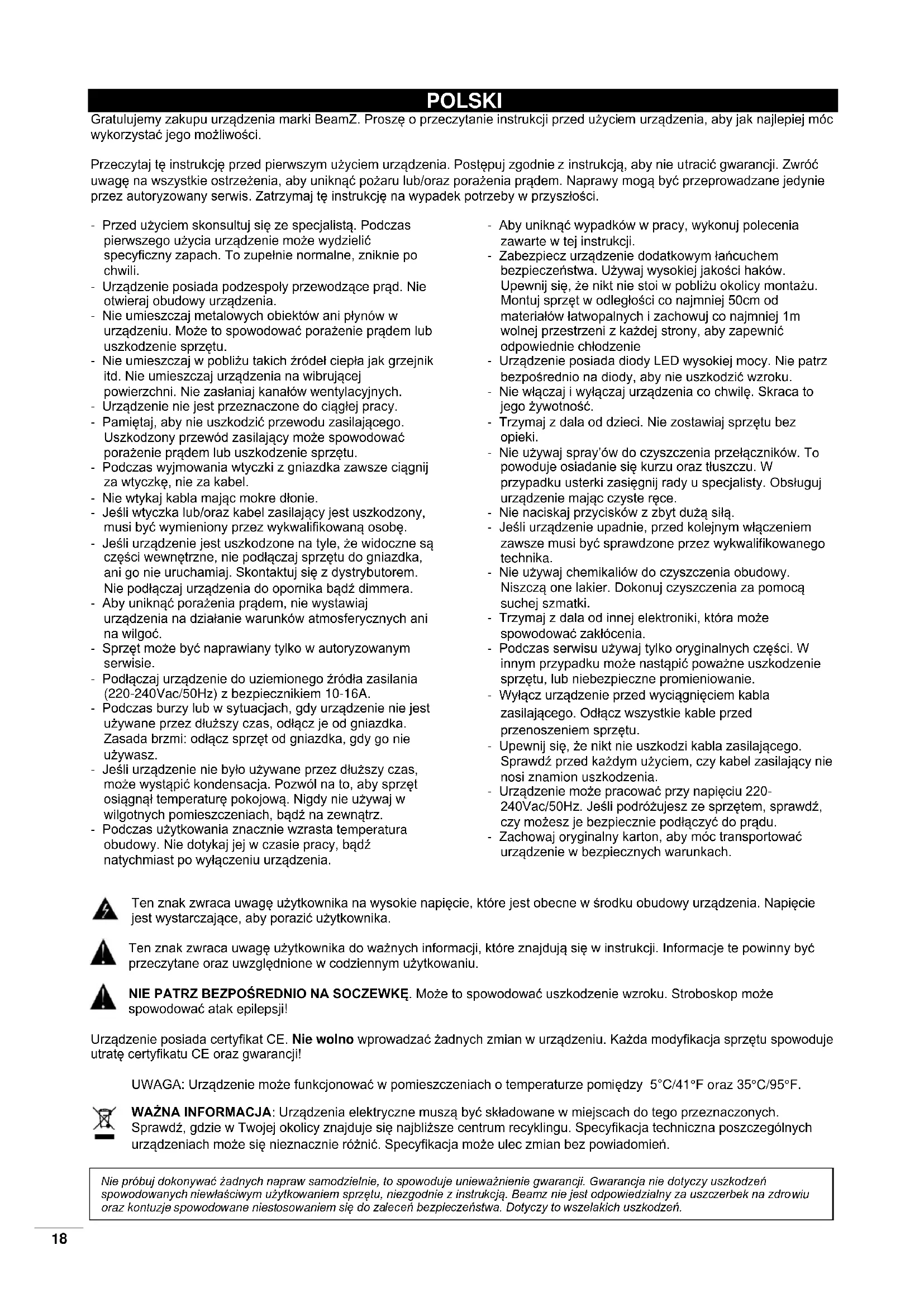 Nettoyez uniquement dans un endroit très bien ventilé.18 POLSKI Gratulujemy zakupu urządzenia marki BeamZ. Proszę o przeczytanie instrukcji przed użyciem urządzenia, aby jak najlepiej móc wykorzystać jego możliwości. Przeczytaj tę instrukcję przed pierwszym użyciem urządzenia. Postępuj zgodnie z instrukcją, aby nie utracić gwarancji. Zwróć uwagę na wszystkie ostrzeżenia, aby uniknąć pożaru lub/oraz porażenia prądem. Naprawy mogą być przeprowadzane jedynie przez autoryzowany serwis. Zatrzymaj tę instrukcję na wypadek potrzeby w przyszłości. - Przed użyciem skonsultuj się ze specjalistą. Podczas pierwszego użycia urządzenie może wydzielić specyficzny zapach. To zupełnie normalne, zniknie po chwili. - Urządzenie posiada podzespoły przewodzące prąd. Nie otwieraj obudowy urządzenia. - Nie umieszczaj metalowych obiektów ani płynów w urządzeniu. Może to spowodować porażenie prądem lub uszkodzenie sprzętu. - Nie umieszczaj w pobliżu takich źródeł ciepła jak grzejnik itd. Nie umieszczaj urządzenia na wibrującej powierzchni. Nie zasłaniaj kanałów wentylacyjnych. - Urządzenie nie jest przeznaczone do ciągłej pracy. - Pamiętaj, aby nie uszkodzić przewodu zasilającego. Uszkodzony przewód zasilający może spowodować porażenie prądem lub uszkodzenie sprzętu. - Podczas wyjmowania wtyczki z gniazdka zawsze ciągnij za wtyczkę, nie za kabel. - Nie wtykaj kabla mając mokre dłonie. - Jeśli wtyczka lub/oraz kabel zasilający jest uszkodzony, musi być wymieniony przez wykwalifikowaną osobę. - Jeśli urządzenie jest uszkodzone na tyle, że widoczne są części wewnętrzne, nie podłączaj sprzętu do gniazdka, ani go nie uruchamiaj. Skontaktuj się z dystrybutorem. Nie podłączaj urządzenia do opornika bądź dimmera. - Aby uniknąć porażenia prądem, nie wystawiaj urządzenia na działanie warunków atmosferycznych ani na wilgoć. - Sprzęt może być naprawiany tylko w autoryzowanym serwisie. - Podłączaj urządzenie do uziemionego źródła zasilania (220-240Vac/50Hz) z bezpiecznikiem 10-16A. - Podczas burzy lub w sytuacjach, gdy urządzenie nie jest używane przez dłuższy czas, odłącz je od gniazdka. Zasada brzmi: odłącz sprzęt od gniazdka, gdy go nie używasz. - Jeśli urządzenie nie było używane przez dłuższy czas, może wystąpić kondensacja. Pozwól na to, aby sprzęt osiągnął temperaturę pokojową. Nigdy nie używaj w wilgotnych pomieszczeniach, bądź na zewnątrz. - Podczas użytkowania znacznie wzrasta temperatura obudowy. Nie dotykaj jej w czasie pracy, bądź natychmiast po wyłączeniu urządzenia. - Aby uniknąć wypadków w pracy, wykonuj polecenia zawarte w tej instrukcji. - Zabezpiecz urządzenie dodatkowym łańcuchem bezpieczeństwa. Używaj wysokiej jakości haków. Upewnij się, że nikt nie stoi w pobliżu okolicy montażu. Montuj sprzęt w odległości co najmniej 50cm od materiałów łatwopalnych i zachowuj co najmniej 1m wolnej przestrzeni z każdej strony, aby zapewnić odpowiednie chłodzenie - Urządzenie posiada diody LED wysokiej mocy. Nie patrz bezpośrednio na diody, aby nie uszkodzić wzroku. - Nie włączaj i wyłączaj urządzenia co chwilę. Skraca to jego żywotność. - Trzymaj z dala od dzieci. Nie zostawiaj sprzętu bez opieki. - Nie używaj spray’ów do czyszczenia przełączników. To powoduje osiadanie się kurzu oraz tłuszczu. W przypadku usterki zasięgnij rady u specjalisty. Obsługuj urządzenie mając czyste ręce. - Nie naciskaj przycisków z zbyt dużą siłą. - Jeśli urządzenie upadnie, przed kolejnym włączeniem zawsze musi być sprawdzone przez wykwalifikowanego technika. - Nie używaj chemikaliów do czyszczenia obudowy. Niszczą one lakier. Dokonuj czyszczenia za pomocą suchej szmatki. - Trzymaj z dala od innej elektroniki, która może spowodować zakłócenia. - Podczas serwisu używaj tylko oryginalnych części. W innym przypadku może nastąpić poważne uszkodzenie sprzętu, lub niebezpieczne promieniowanie. - Wyłącz urządzenie przed wyciągnięciem kabla zasilającego. Odłącz wszystkie kable przed przenoszeniem sprzętu. - Upewnij się, że nikt nie uszkodzi kabla zasilającego. Sprawdź przed każdym użyciem, czy kabel zasilający nie nosi znamion uszkodzenia. - Urządzenie może pracować przy napięciu 220- 240Vac/50Hz. Jeśli podróżujesz ze sprzętem, sprawdź, czy możesz je bezpiecznie podłączyć do prądu. - Zachowaj oryginalny karton, aby móc transportować urządzenie w bezpiecznych warunkach. Ten znak zwraca uwagę użytkownika na wysokie napięcie, które jest obecne w środku obudowy urządzenia. Napięcie jest wystarczające, aby porazić użytkownika. Ten znak zwraca uwagę użytkownika do ważnych informacji, które znajdują się w instrukcji. Informacje te powinny być przeczytane oraz uwzględnione w codziennym użytkowaniu. NIE PATRZ BEZPOŚREDNIO NA SOCZEWKĘ. Może to spowodować uszkodzenie wzroku. Stroboskop może spowodować atak epilepsji! Urządzenie posiada certyfikat CE. Nie wolno wprowadzać żadnych zmian w urządzeniu. Każda modyfikacja sprzętu spowoduje utratę certyfikatu CE oraz gwarancji! UWAGA: Urządzenie może funkcjonować w pomieszczeniach o temperaturze pomiędzy 5°C/41°F oraz 35°C/95°F. WAŻNA INFORMACJA: Urządzenia elektryczne muszą być składowane w miejscach do tego przeznaczonych. Sprawdź, gdzie w Twojej okolicy znajduje się najbliższe centrum recyklingu. Specyfikacja techniczna poszczególnych urządzeniach może się nieznacznie różnić. Specyfikacja może ulec zmian bez powiadomień. Nie próbuj dokonywać żadnych napraw samodzielnie, to spowoduje unieważnienie gwarancji. Gwarancja nie dotyczy uszkodzeń spowodowanych niewłaściwym użytkowaniem sprzętu, niezgodnie z instrukcją. Beamz nie jest odpowiedzialny za uszczerbek na zdrowiu oraz kontuzje spowodowane niestosowaniem się do zaleceń bezpieczeństwa. Dotyczy to wszelakich uszkodzeń.19 INSTRUKCJA ROZ