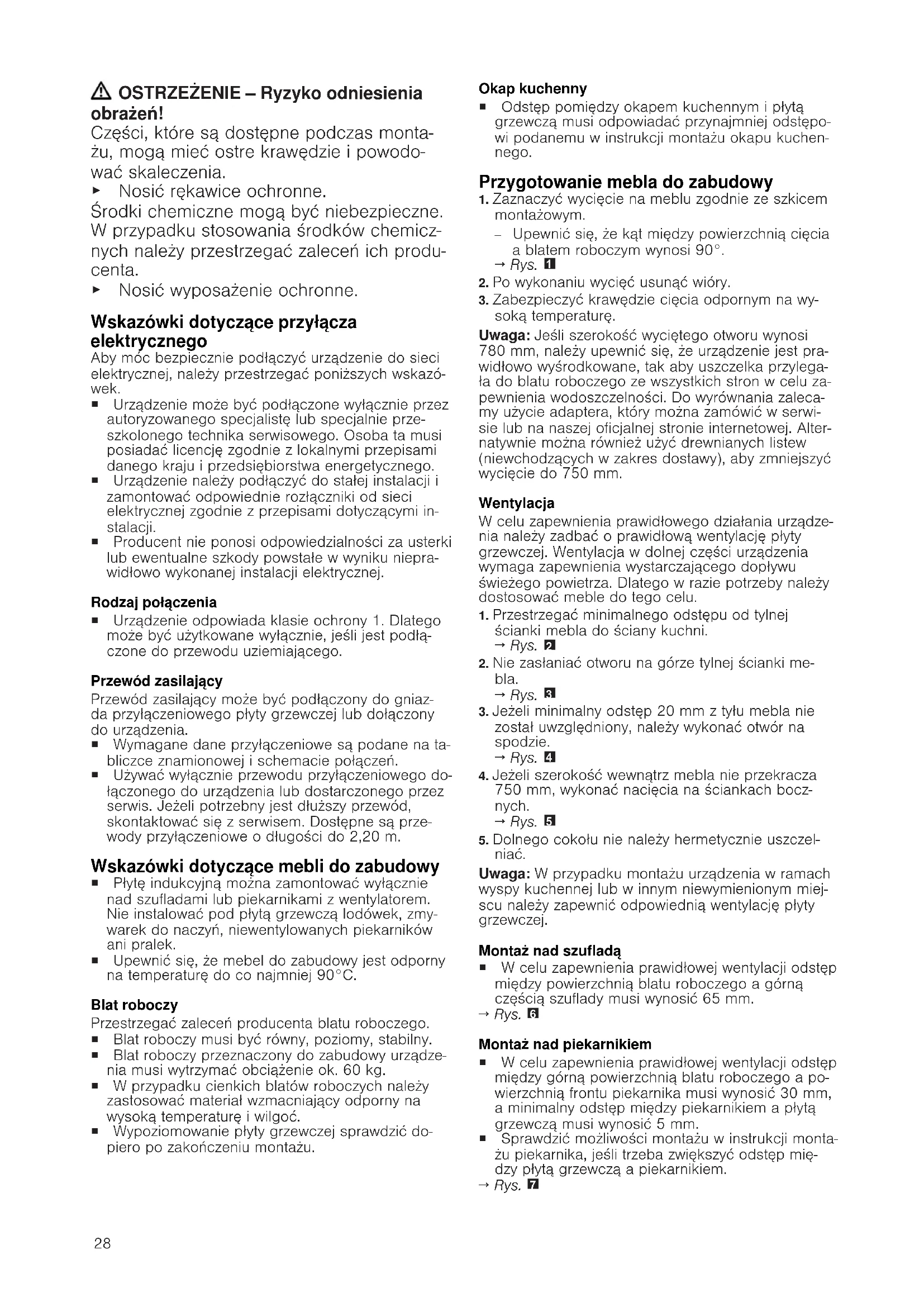 Wskazówki ogólne ¡ Należy dokładnie przeczytać niniejszą in- strukcję. ¡ Tylko certyfikowany fachowiec może pod- łączyć urządzenie. ¡ Nieprawidłowa instalacja, otwarcie urzą- dzenia, podłączenie lub montaż powodują unieważnienie gwarancji na produkt. ¡ Przed przystąpieniem do jakichkolwiek prac odłączyć zasilanie. ¡ Po ukończeniu instalacji należy upewnić się, że użytkownik nie ma dostępu do elektrycznych elementów. ¡ Nigdy nie używać tego urządzenia na ło- dziach lub pojazdach. Bezpieczny montaż Podczas montażu urządzenia należy prze- strzegać zasad bezpieczeństwa. Bezpieczeństwo podczas użytkowania za- pewnione jest tylko po prawidłowym zamon- towaniu zgodnie z instrukcją montażu. Mon- ter jest odpowiedzialny za prawidłowe dzia- łanie urządzenia w miejscu instalacji. OSTRZEŻENIE‒Niebezpieczeństwo: oddziaływanie magnetyczne! Urządzenie zawiera magnesy trwałe. Mogą one mieć wpływ na działanie implantów elektronicznych, np. rozruszników serca lub pomp insulinowych. ▶ Osoby posiadające implanty elektroniczne powinny zachowywać odstęp co najmniej 10cm od urządzenia.28 OSTRZEŻENIE‒Ryzyko odniesienia obrażeń! Części, które są dostępne podczas monta- żu, mogą mieć ostre krawędzie i powodo- wać skaleczenia. ▶ Nosić rękawice ochronne. Środki chemiczne mogą być niebezpieczne. W przypadku stosowania środków chemicz- nych należy przestrzegać zaleceń ich produ- centa. ▶ Nosić wyposażenie ochronne. Wskazówki dotyczące przyłącza elektrycznego Aby móc bezpiecznie podłączyć urządzenie do sieci elektrycznej, należy przestrzegać poniższych wskazó- wek. ¡ Urządzenie może być podłączone wyłącznie przez autoryzowanego specjalistę lub specjalnie prze- szkolonego technika serwisowego. Osoba ta musi posiadać licencję zgodnie z lokalnymi przepisami danego kraju i przedsiębiorstwa energetycznego. ¡ Urządzenie należy podłączyć do stałej instalacji i zamontować odpowiednie rozłączniki od sieci elektrycznej zgodnie z przepisami dotyczącymi in- stalacji. ¡ Producent nie ponosi odpowiedzialności za usterki lub ewentualne szkody powstałe w wyniku niepra- widłowo wykonanej instalacji elektrycznej. Rodzaj połączenia ¡ Urządzenie odpowiada klasie ochrony 1. Dlatego może być użytkowane wyłącznie, jeśli jest podłą- czone do przewodu uziemiającego. Przewód zasilający Przewód zasilający może być podłączony do gniaz- da przyłączeniowego płyty grzewczej lub dołączony do urządzenia. ¡ Wymagane dane przyłączeniowe są podane na ta- bliczce znamionowej i schemacie połączeń. ¡ Używać wyłącznie przewodu przyłączeniowego do- łączonego do urządzenia lub dostarczonego przez serwis. Jeżeli potrzebny jest dłuższy przewód, skontaktować się z serwisem. Dostępne są prze- wody przyłączeniowe o długości do 2,20m. Wskazówki dotyczące mebli do zabudowy ¡ Płytę indukcyjną można zamontować wyłącznie nad szufladami lub piekarnikami z wentylatorem. Nie instalować pod płytą grzewczą lodówek, zmy- warek do naczyń, niewentylowanych piekarników ani pralek. ¡ Upewnić się, że mebel do zabudowy jest odporny na temperaturę do co najmniej 90°C. Blat roboczy Przestrzegać zaleceń producenta blatu roboczego. ¡ Blat roboczy musi być równy, poziomy, stabilny. ¡ Blat roboczy przeznaczony do zabudowy urządze- nia musi wytrzymać obciążenie ok. 60kg. ¡ W przypadku cienkich blatów roboczych należy zastosować materiał wzmacniający odporny na wysoką temperaturę i wilgoć. ¡ Wypoziomowanie płyty grzewczej sprawdzić do- piero po zakończeniu montażu. Okap kuchenny ¡ Odstęp pomiędzy okapem kuchennym i płytą grzewczą musi odpowiadać przynajmniej odstępo- wi podanemu w instrukcji montażu okapu kuchen- nego. Przygotowanie mebla do zabudowy