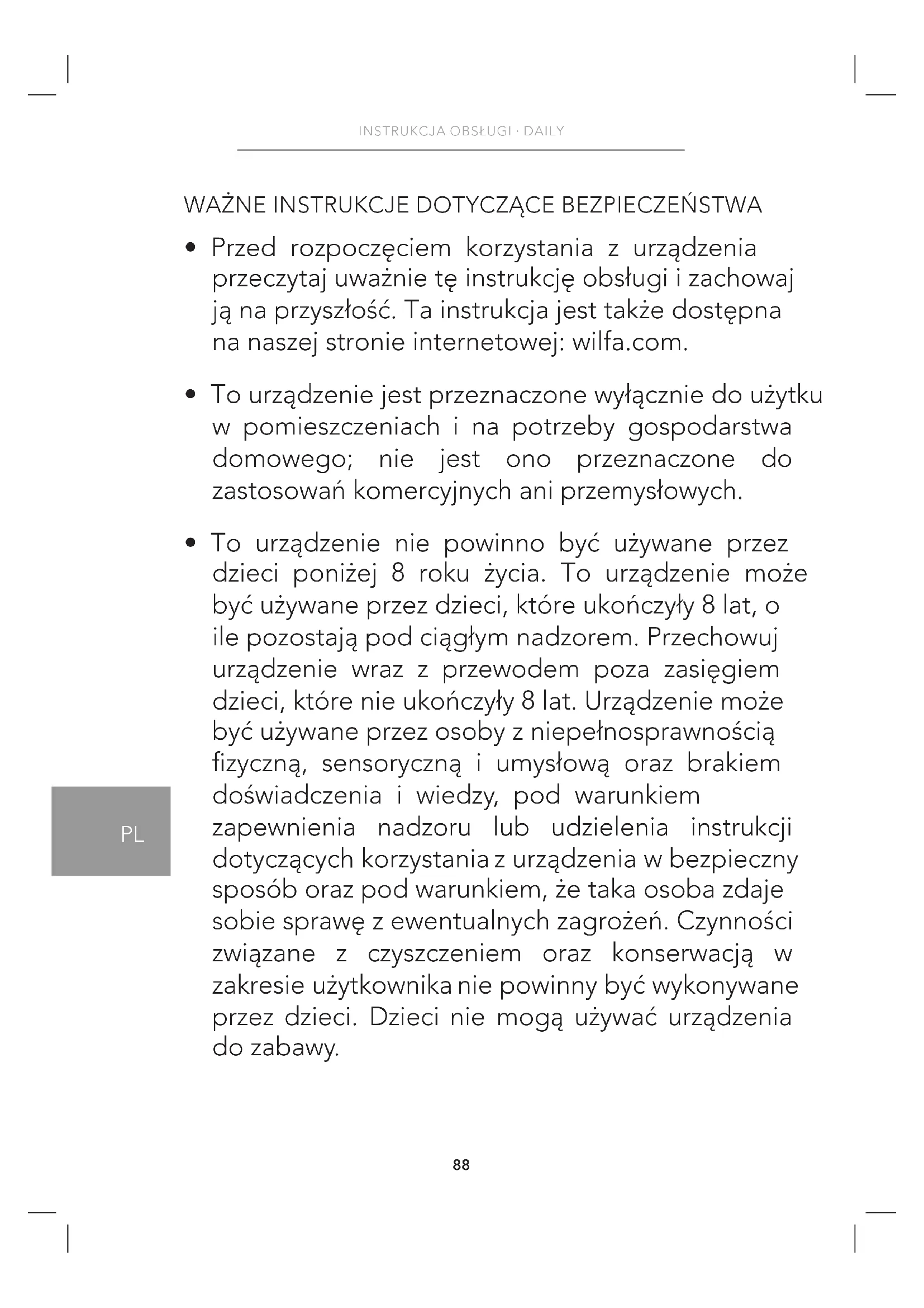 - Przed rozpoczęciem korzystania z urządzenia przeczytaj uważnie tę instrukcję obsługi i zachowaj ją na przyszłość. Ta instrukcja jest także dostępna na naszej stronie internetowej: wilfa.com.