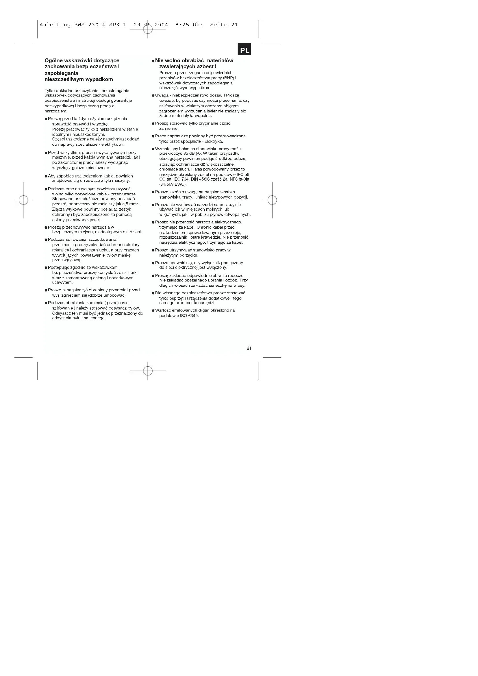 Spændeflange Flangemøtrik Placering af flangen ved brug af lige slibeskive Anleitung BWS 230-4 SPK 1 29.09.2004 8:25 Uhr Seite 2021 Ogólne wskazówki dotyczące zachowania bezpieczeństwa i zapobiegania nieszczęśliwym wypadkom Tylko dokładne przeczytanie i przestrzeganie wskazówek dotyczących zachowania bezpieczeństwa i instrukcji obsługi gwarantuje bezwypadkową i bezpieczną pracę z narzędziem. Proszę przed każdym użyciem urządzenia sprawdzić przewód i wtyczkę. Proszę pracować tylko z narzędziem w stanie idealnym i nieuszkodzonym. Części uszkodzone należy natychmiast oddać do naprawy specjaliście - elektrykowi. Przed wszystkimi pracami wykonywanymi przy maszynie, przed każdą wymianą narzędzi, jak i po zakończonej pracy należy wyciągnąć wtyczkę z gniazda sieciowego. Aby zapobiec uszkodzeniom kabla, powinien znajdować się on zawsze z tyłu maszyny. Podczas prac na wolnym powietrzu używać wolno tylko dozwolone kable - przedłużacze. Stosowane przedłużacze powinny posiadać przekrój poprzeczny nie mniejszy jak ą,5 mm