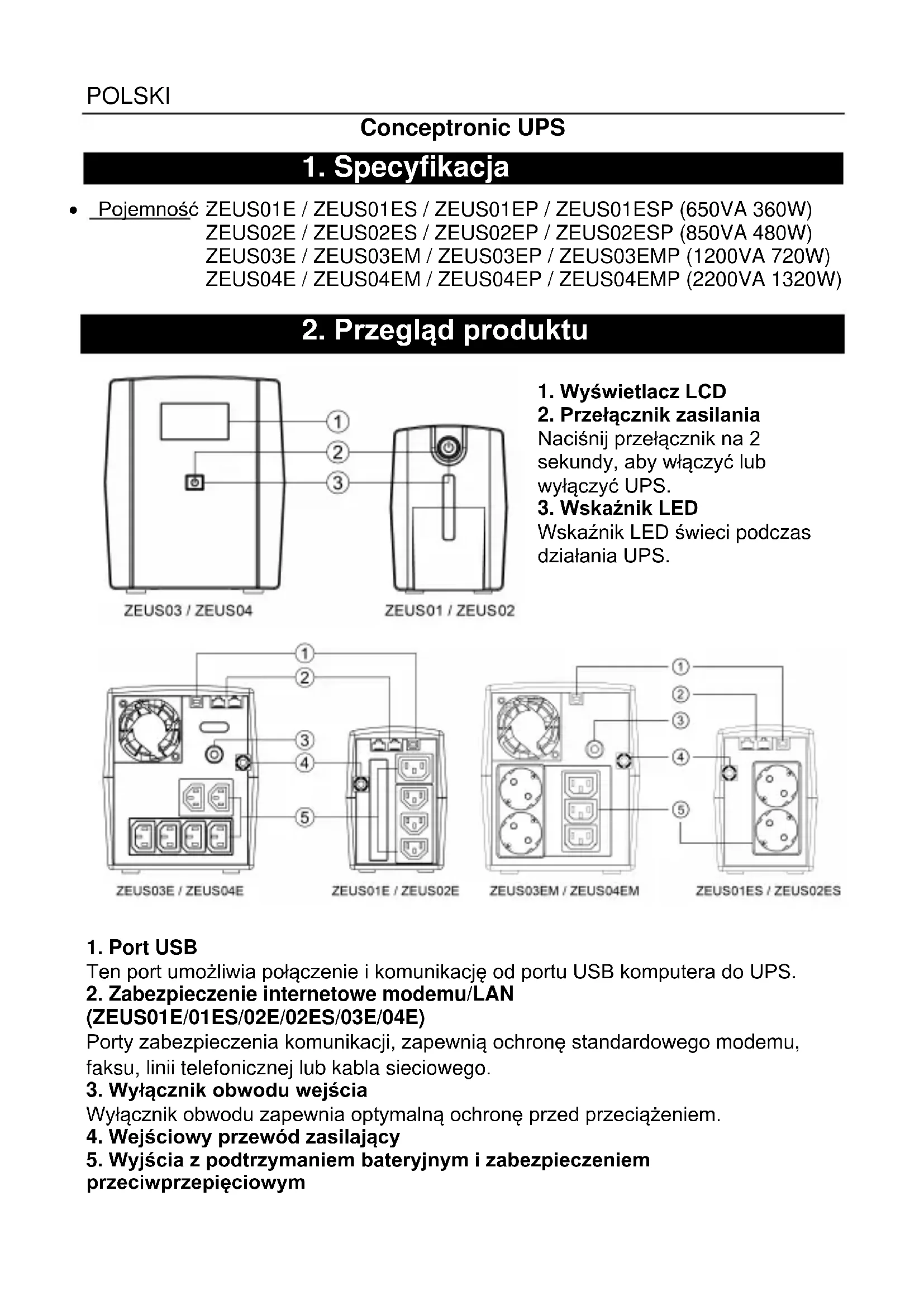przeciwprzepięciowym ZEUS01E / ZEUS01ES / ZEUS01EP / ZEUS01ESP (650VA 360W) ZEUS02E / ZEUS02ES / ZEUS02EP / ZEUS02ESP (850VA 480W) ZEUS03E / ZEUS03EM / ZEUS03EP / ZEUS03EMP (1200VA 720W) ZEUS04E / ZEUS04EM / ZEUS04EP / ZEUS04EMP (2200VA 1320W)POLSKI Zapewniają podtrzymanie bateryjne i ochronę przeciwprzepięciową. Zapewniają zasilanie przez pewien czas podłączonych urządzeń, podczas awarii zasilania. ZEUS01 / ZEUS02 Opisy alarmów Stan diody LED Alarm Normalny Światło LED wyłączone Rozładowanie baterii Miganie co 30 sek. Sygnał dźwiękowy co 30 sek. Niski poziom baterii Miganie co 2 sek. Sygnał dźwiękowy co 2 sek. Przeciążenie Miganie co 0.5 sek. Sygnał dźwiękowy co 0,5 sek. Tryb ładowania przy wyłączeniu Wskaźnik LED wyłączony wyłączenie Awaria Wskaźnik LED wyłączony Alarm ciągły Ustawienie wyciszenia: Alarm dźwiękowy można wyłączyć lub włączyć, poprzez szybkie, dwukrotne naciśnięcie przycisku zasilania. Ustawienie domyślne to alarm włączony. Po wyłączeniu alarmu, wygenerowane zostaną dwa krótkie sygnały dźwiękowe. ZEUS03 / ZEUS04 Opis podświetlonych wskaźników na wyświetlaczu LCD Pozycja ustawienia Tryb zasilania sieciowego Tryb PV Tryb zasilania bateryjnego Awaria Wyłączenie dźwięku Tryb zasilania bateryjnego: pojemność baterii Tryb zasilania sieciowego: