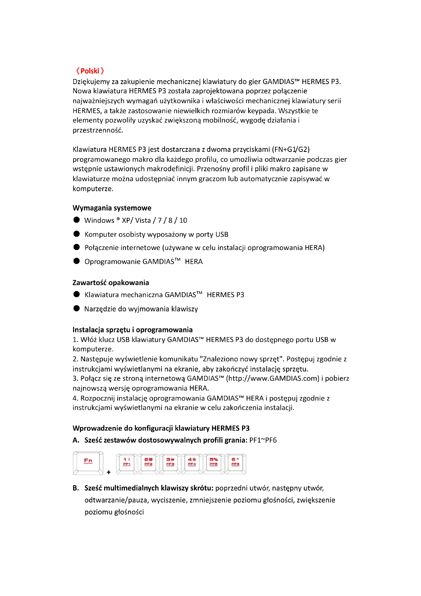 instrukcjami wyświetlanymi na ekranie w celu zakończenia instalacji. Wprowadzenie do konfiguracji klawiatury HERMES P3 A. Sześć zestawów dostosowywalnych profili grania: PF1~PF6
