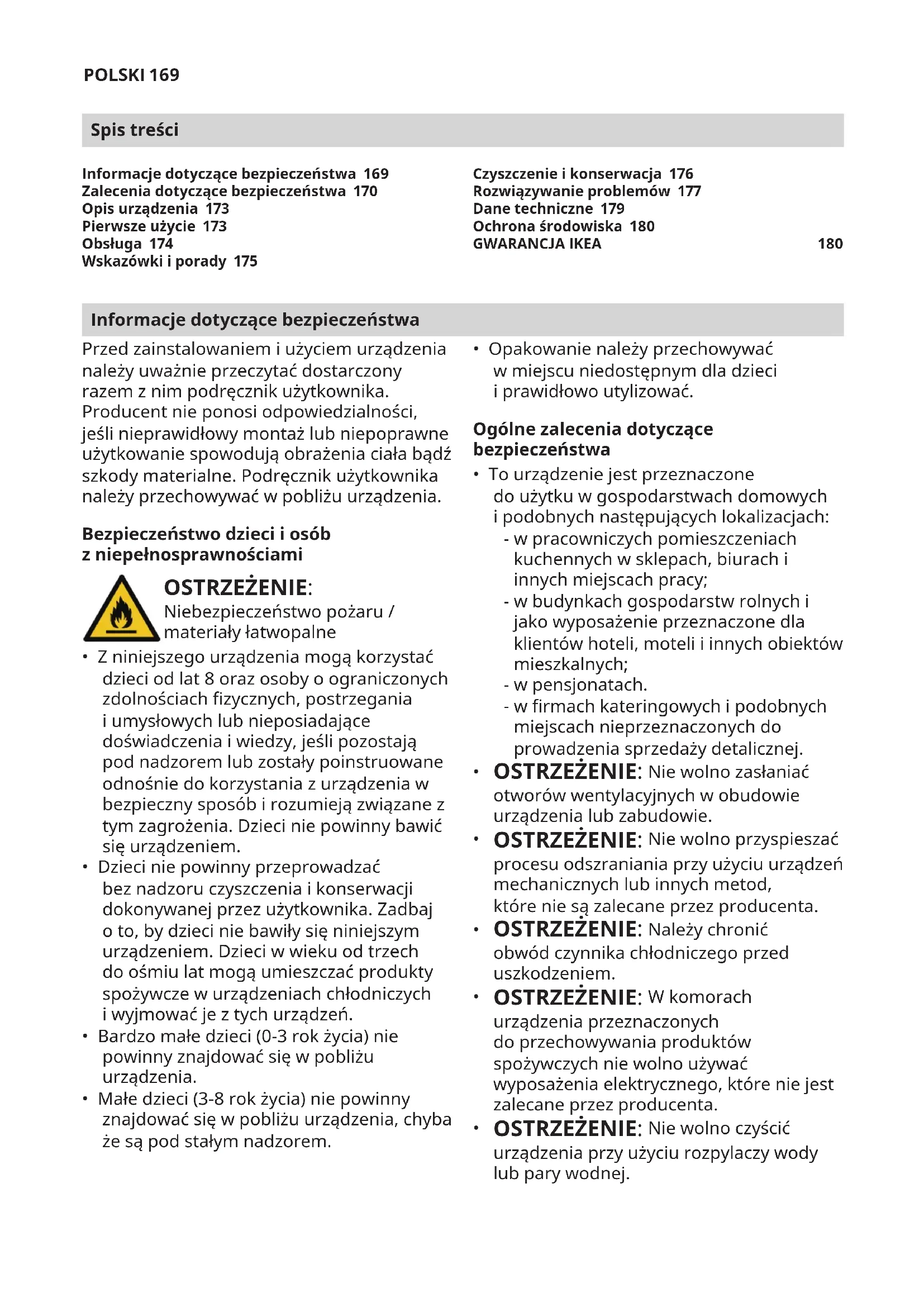 OSTRZEŻENIE: Niewolno czyścić urządzenia przy użyciu rozpylaczy wody lubparywodnej. Informacje dotyczące bezpieczeństwa 169 Zalecenia dotyczące bezpieczeństwa 170 Opis urządzenia 173 Pierwsze użycie 173 Obsługa 174 Wskazówki iporady 175 Czyszczenie i konserwacja 176 Rozwiązywanie problemów 177 Dane techniczne 179 Ochrona środowiska 180