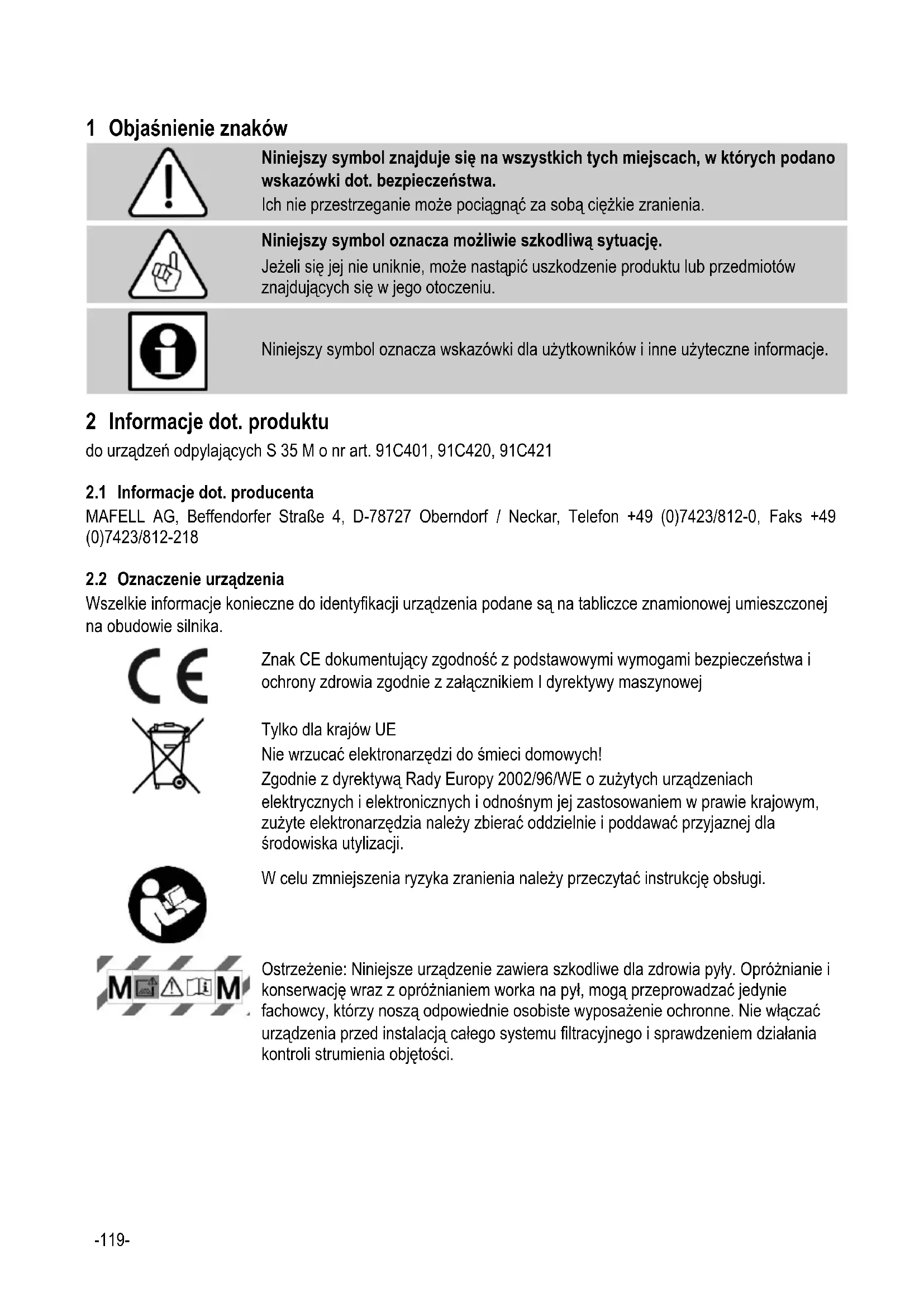 2 Informacje dot. produktu do urządzeń odpylających S 35 M o nr art. 91C401, 91C420, 91C421