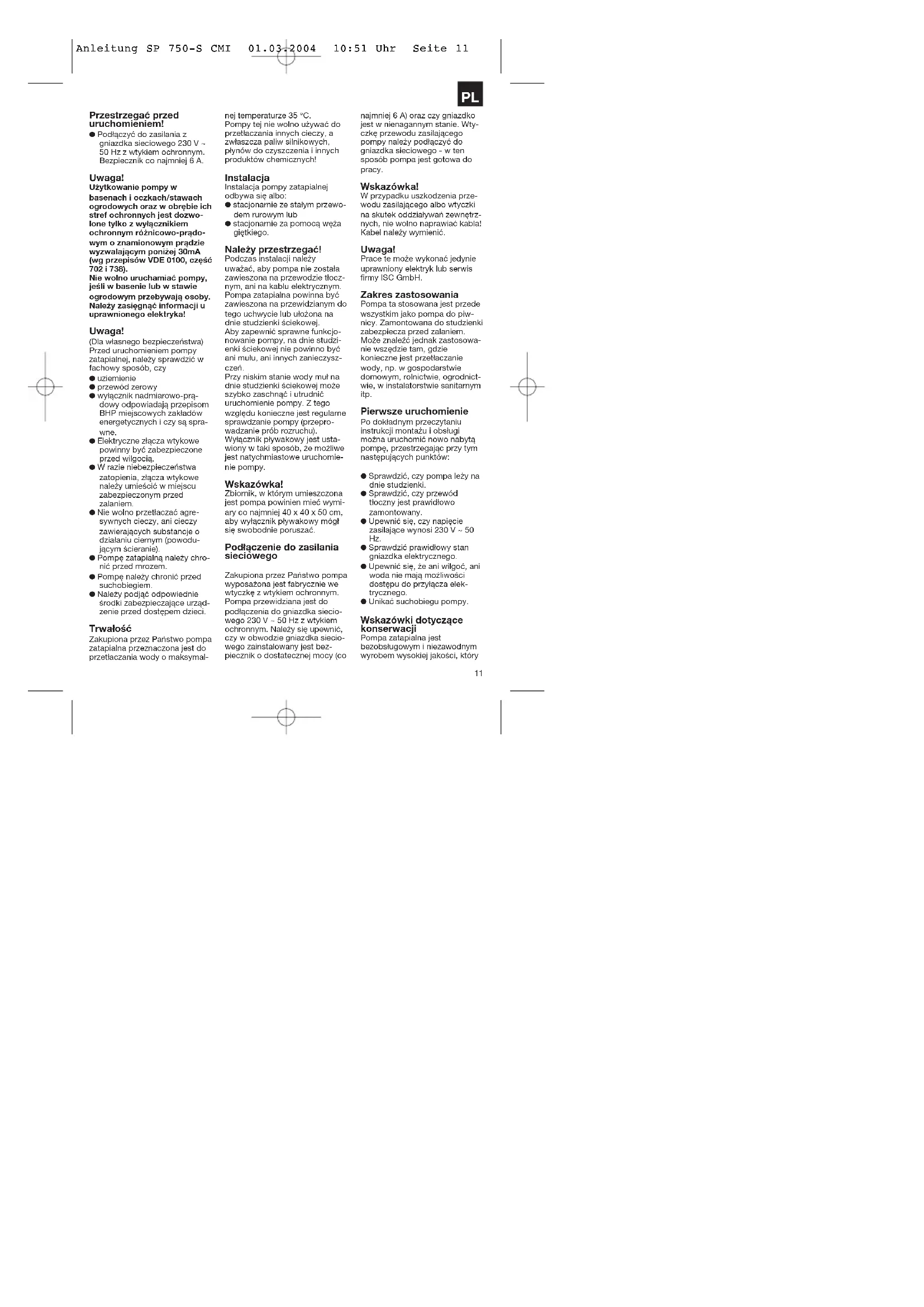 Przestrzegać przed uruchomieniem! ● Podłączyć do zasilania z gniazdka sieciowego 230 V ~ 50 Hz z wtykiem ochronnym. Bezpiecznik co najmniej 6 A. Uwaga! Użytkowanie pompy w basenach i oczkach/stawach ogrodowych oraz w obrębie ich stref ochronnych jest dozwo- lone tylko z wyłącznikiem ochronnym różnicowo-prądo- wym o znamionowym prądzie wyzwalającym poniżej 30mA (wg przepisów VDE 0100, część 702 i 738). Nie wolno uruchamiać pompy, jeśli w basenie lub w stawie ogrodowym przebywają osoby. Należy zasięgnąć informacji u uprawnionego elektryka! Uwaga! (Dla własnego bezpieczeństwa) Przed uruchomieniem pompy zatapialnej, należy sprawdzić w fachowy sposób, czy ● uziemienie ● przewód zerowy ● wyłącznik nadmiarowo-prą- dowy odpowiadają przepisom BHP miejscowych zakładów energetycznych i czy są spra- wne. ● Elektryczne złącza wtykowe powinny być zabezpieczone przed wilgocią. ● W razie niebezpieczeństwa zatopienia, złącza wtykowe należy umieścić w miejscu zabezpieczonym przed zalaniem. ● Nie wolno przetłaczać agre- sywnych cieczy, ani cieczy zawierających substancje o działaniu ciernym (powodu- jącym ścieranie). ● Pompę zatapialną należy chro- nić przed mrozem. ● Pompę należy chronić przed suchobiegiem. ● Należy podjąć odpowiednie środki zabezpieczające urząd- zenie przed dostępem dzieci. Trwałość Zakupiona przez Państwo pompa zatapialna przeznaczona jest do przetłaczania wody o maksymal- nej temperaturze 35 °C. Pompy tej nie wolno używać do przetłaczania innych cieczy, a zwłaszcza paliw silnikowych, płynów do czyszczenia i innych produktów chemicznych! Instalacja Instalacja pompy zatapialnej odbywa się albo: ● stacjonarnie ze stałym przewo- dem rurowym lub ● stacjonarnie za pomocą węża giętkiego. Należy przestrzegać! Podczas instalacji należy uważać, aby pompa nie została zawieszona na przewodzie tłocz- nym, ani na kablu elektrycznym. Pompa zatapialna powinna być zawieszona na przewidzianym do tego uchwycie lub ułożona na dnie studzienki ściekowej. Aby zapewnić sprawne funkcjo- nowanie pompy, na dnie studzi- enki ściekowej nie powinno być ani mułu, ani innych zanieczysz- czeń. Przy niskim stanie wody muł na dnie studzienki ściekowej może szybko zaschnąć i utrudnić uruchomienie pompy. Z tego względu konieczne jest regularne sprawdzanie pompy (przepro- wadzanie prób rozruchu). Wyłącznik pływakowy jest usta- wiony w taki sposób, że możliwe jest natychmiastowe uruchomie- nie pompy. Wskazówka! Zbiornik, w którym umieszczona jest pompa powinien mieć wymi- ary co najmniej 40 x 40 x 50 cm, aby wyłącznik pływakowy mógł się swobodnie poruszać. Podłączenie do zasilania sieciowego Zakupiona przez Państwo pompa wyposażona jest fabrycznie we wtyczkę z wtykiem ochronnym. Pompa przewidziana jest do podłączenia do gniazdka siecio- wego 230 V ~ 50 Hz z wtykiem ochronnym. Należy się upewnić, czy w obwodzie gniazdka siecio- wego zainstalowany jest bez- piecznik o dostatecznej mocy (co najmniej 6 A) oraz czy gniazdko jest w nienagannym stanie. Wty- czkę przewodu zasilającego pompy należy podłączyć do gniazdka sieciowego - w ten sposób pompa jest gotowa do pracy. Wskazówka! W przypadku uszkodzenia prze- wodu zasilającego albo wtyczki na skutek oddziaływań zewnętrz- nych, nie wolno naprawiać kabla! Kabel należy wymienić. Uwaga! Prace te może wykonać jedynie uprawniony elektryk lub serwis firmy ISC GmbH. Zakres zastosowania Pompa ta stosowana jest przede wszystkim jako pompa do piw- nicy. Zamontowana do studzienki zabezpiecza przed zalaniem. Może znaleźć jednak zastosowa- nie wszędzie tam, gdzie konieczne jest przetłaczanie wody, np. w gospodarstwie domowym, rolnictwie, ogrodnict- wie, w instalatorstwie sanitarnym itp. Pierwsze uruchomienie Po dokładnym przeczytaniu instrukcji montażu i obsługi można uruchomić nowo nabytą pompę, przestrzegając przy tym następujących punktów: ● Sprawdzić, czy pompa leży na dnie studzienki. ● Sprawdzić, czy przewód tłoczny jest prawidłowo zamontowany. ● Upewnić się, czy napięcie zasilające wynosi 230 V ~ 50 Hz. ● Sprawdzić prawidłowy stan gniazdka elektrycznego. ● Upewnić się, że ani wilgoć, ani woda nie mają możliwości dostępu do przyłącza elek- trycznego. ● Unikać suchobiegu pompy. Wskazówki dotyczące konserwacji Pompa zatapialna jest bezobsługowym i niezawodnym wyrobem wysokiej jakości, który Anleitung SP 750-S CMI 01.03.2004 10:51 Uhr Seite 1112