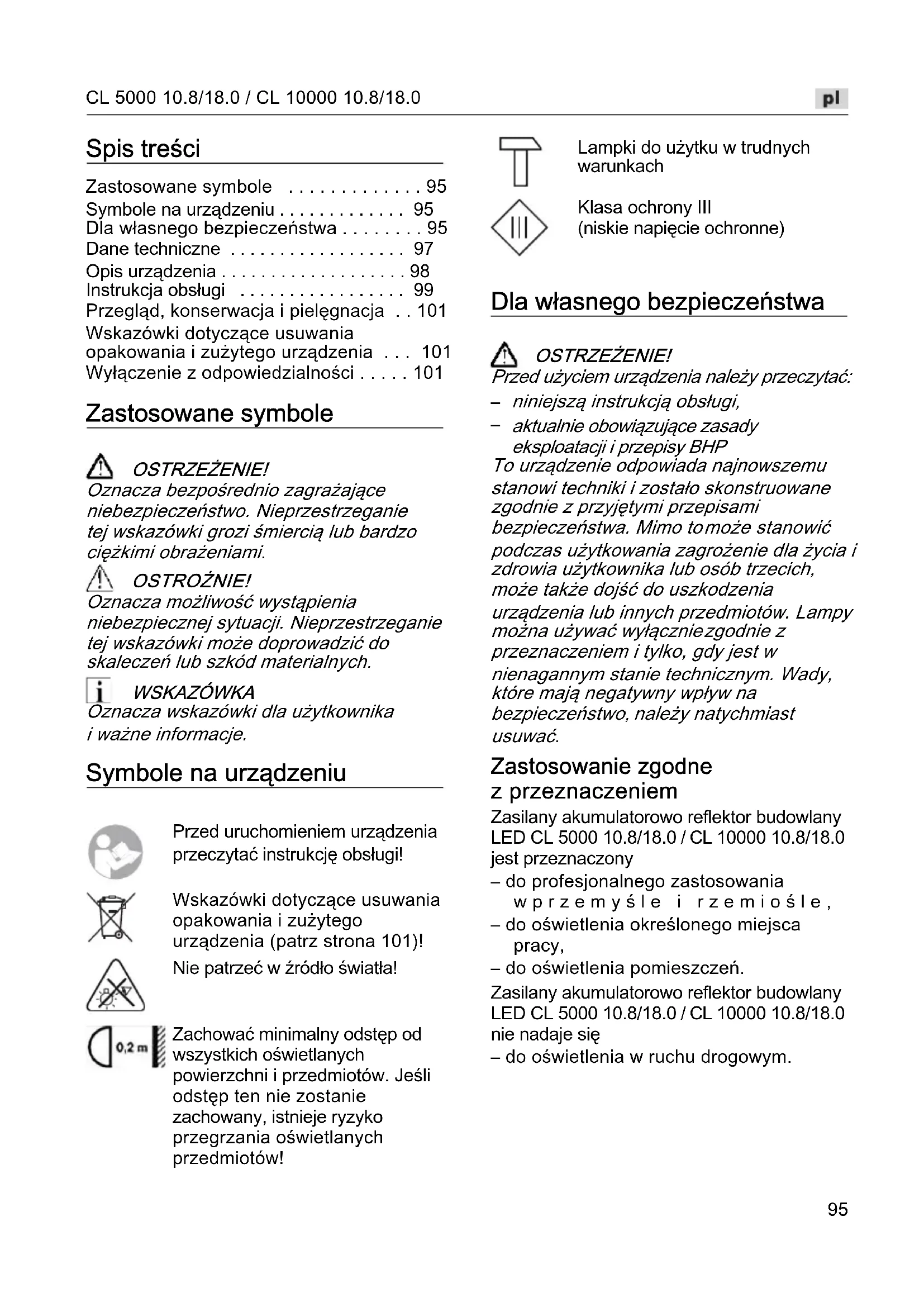 nie nadaje się – do oświetlenia w ruchu drogowym. Przed uruchomieniem urządzenia przeczytać instrukcję obsługi! Wskazówki dotyczące usuwania opakowania i zużytego urządzenia (patrz strona 101)! Nie patrzeć w źródło światła! Zachować minimalny odstęp od wszystkich oświetlanych powierzchni i przedmiotów. Jeśli odstęp ten nie zostanie zachowany, istnieje ryzyko przegrzania oświetlanych przedmiotów! Lampki do użytku w trudnych warunkach Klasa ochrony III (niskie napięcie ochronne)CL 5000 10.8/18.0 / CL 10000 10.8/18.0