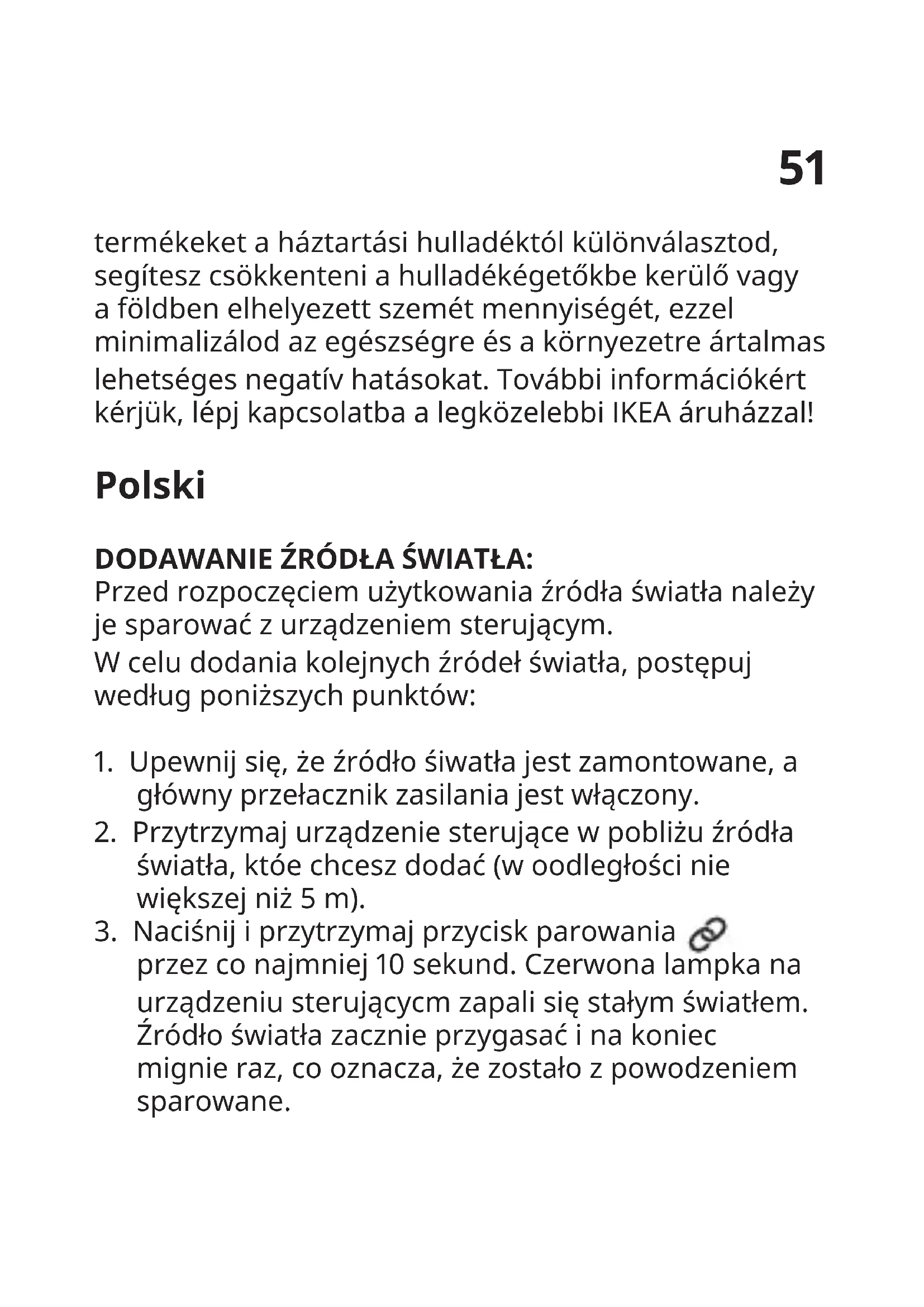 przez co najmniej 10 sekund. Czerwona lampka na urządzeniu sterującycm zapali się stałym światłem. Źródło światła zacznie przygasać i na koniec mignie raz, co oznacza, że zostało z powodzeniem sparowane.52 Z urządzeniem sterującym można sparować do 10 źródeł światła. Pamiętaj, aby parować je po kolei. Jeżeli źródła światła znajdują się zbyt blisko siebie, odłącz od zasilania to, które zostało już sparowane. UWAGA NIE UŻYWAJ STANDARDOWYCH ŚCIEMNIACZY. Do sterowania żarówką stosować wyłącznie dołączonego pilota lub wskazanego w niniejszej instrukcji. Żarówka nie będzie działać prawidłowo po podłączeniu do standardowego (żarowego) ściemniacza lub pilota ściemniacza. Sterowanie wyłącznie przez produkty IKEA Smart Lighting. Za pomocą pilota zdalnego sterowania można wybrać jedną z 9 opcji światła kolorowego i białego: Światłobiałe Zimna biel - 4000 K Ciepła biel - 2700 K Ciepły blask - 2200 K Światło świecy - 1780 K Kolory Bursztyn, Ciemna brzoskwinia, Ciemny różowy, Jasnooletowy, Jasnoniebieski53 Po podłączeniu sterownika i aplikacji uzyskasz łącznie 20 opcji kolorów i światła białego. Odcienie bieli: Zimne niebo - 6000 K. Zimne światło dzienne - 5000 K Zimna biel - 4000 K. Świt - 3000 K Ciepła biel - 2700 K. Ciepły blask - 2200 K. Światło świecy - 1780 K Kolory: Bursztyn, Brzoskwinia, Ciemna brzoskwinia, Ciemny czerwony, Różowy, Jasnoróżowy, Ciemny różowy, Jasnooletowy, Ciemny oletowy, Niebieski, Jasnoniebieski, Limonka, Żółty RESETOWANIEURZĄDZENIA Przełącz główny przełącznik 6 razy. DANE TECHNICZNE: Częstotliwośćrobocza:2405 – 2480 MHz Mocwyjściowa:10 dBm54 Producent: IKEA of Sweden AB Adres: Box 702, SE-343 81 Älmhult, SZWECJA Przekreślony symbol kosza na odpady oznacza, że oznaczony produkt nie może być wyrzucany wraz ze zmieszanymi odpadami komunalnymi z gospodarstwa domowego. Zużyty sprzęt elektryczny i elektroniczny należy przekazać do przetwarzania i recyklingu zgodnie z obowiązującymi w danym kraju przepisami ochrony środowiska dotyczącymi gospodarowania odpadami. Selektywna zbiórka odpadów m.in. z gospodarstw domowych przyczynia się do zmniejszenia ilość odpadów przekazanych na składowiska lub do spalarni oraz ograniczenia ich potencjalnego negatywnego wpływu na zdrowie ludzi i środowisko. Aby uzyskać więcej informacji, skontaktuj się z najbliższym sklepem IKEA.55 Eesti LISAGE JUHTIMISSEADMELE VALGUSTEID: Enne valgusti kasutamist, peate selle ühildama juhtimisseadmega. Enamate valgustite lisamiseks toimige järgnevalt: