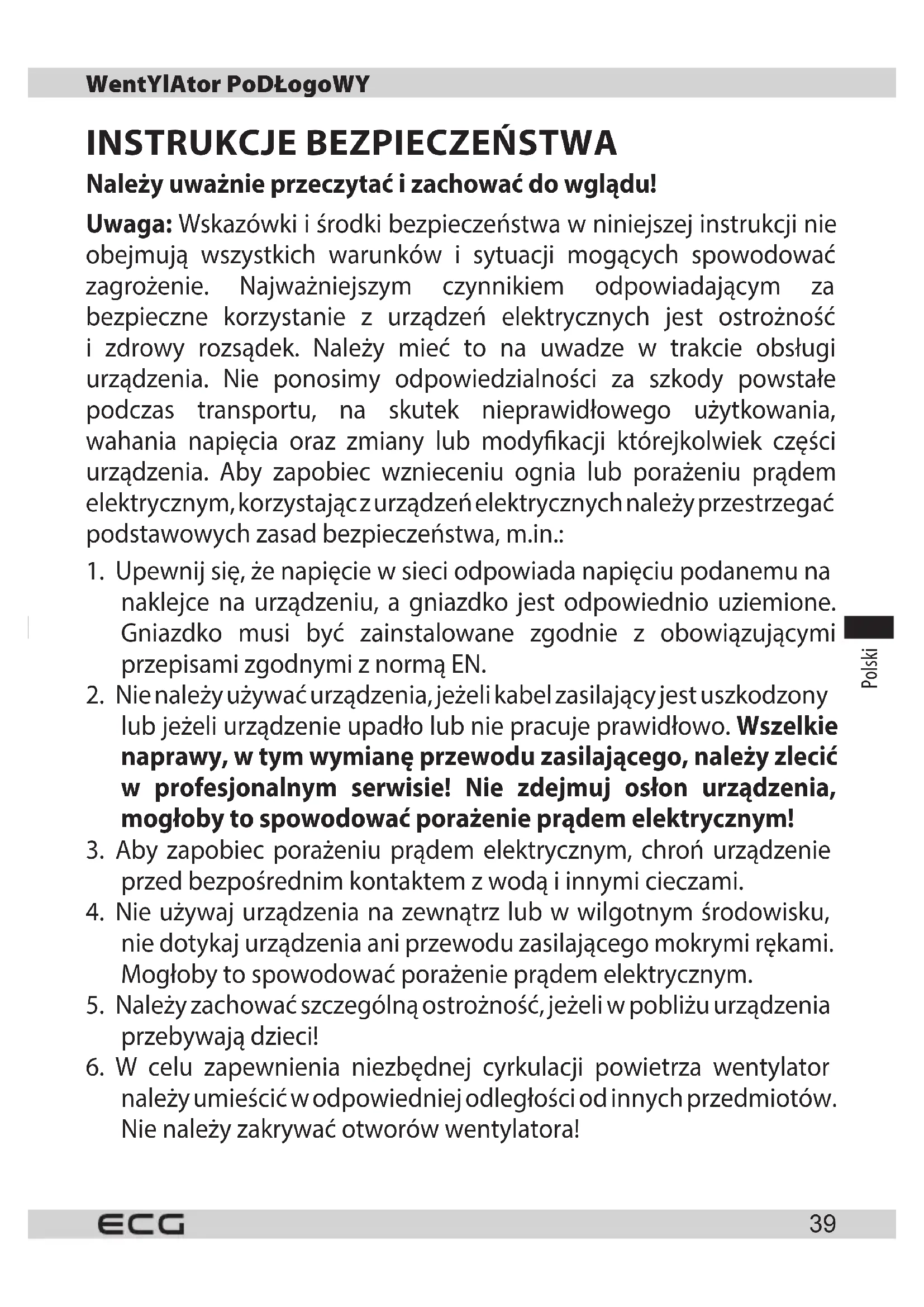 należy umieścić w odpowiedniej odległości od innych przedmiotów. Nie należy zakrywać otworów wentylatora! Wentylator podłogowy PolskiPolski Polski
