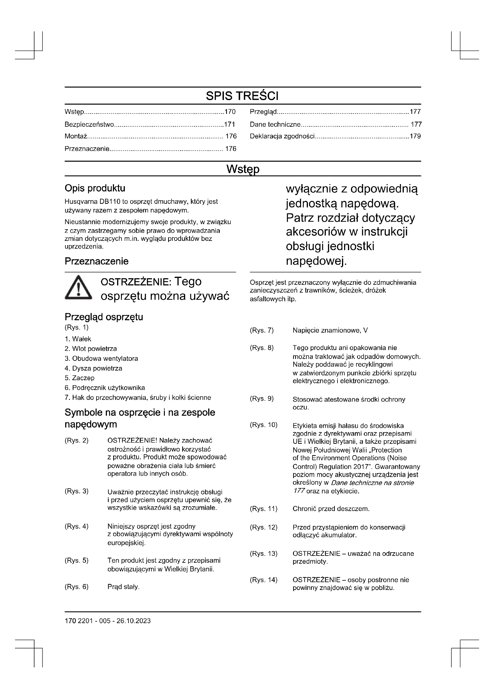 - Deklaracja zgodności Wstęp Opis produktu Husqvarna DB110 to osprzęt dmuchawy, który jest używany razem z zespołem napędowym. Nieustannie modernizujemy swoje produkty, w związku z czym zastrzegamy sobie prawo do wprowadzania zmian dotyczących m.in. wyglądu produktów bez uprzedzenia. Przeznaczenie OSTRZEŻENIE: Tego osprzętu można używać wyłącznie z odpowiednią jednostką napędową. Patrz rozdział dotyczący akcesoriów w instrukcji obsługi jednostki napędowej. Osprzęt jest przeznaczony wyłącznie do zdmuchiwania zanieczyszczeń z trawników, ścieżek, dróżek asfaltowych itp. Przegląd osprzętu (Rys. 1) p. 179