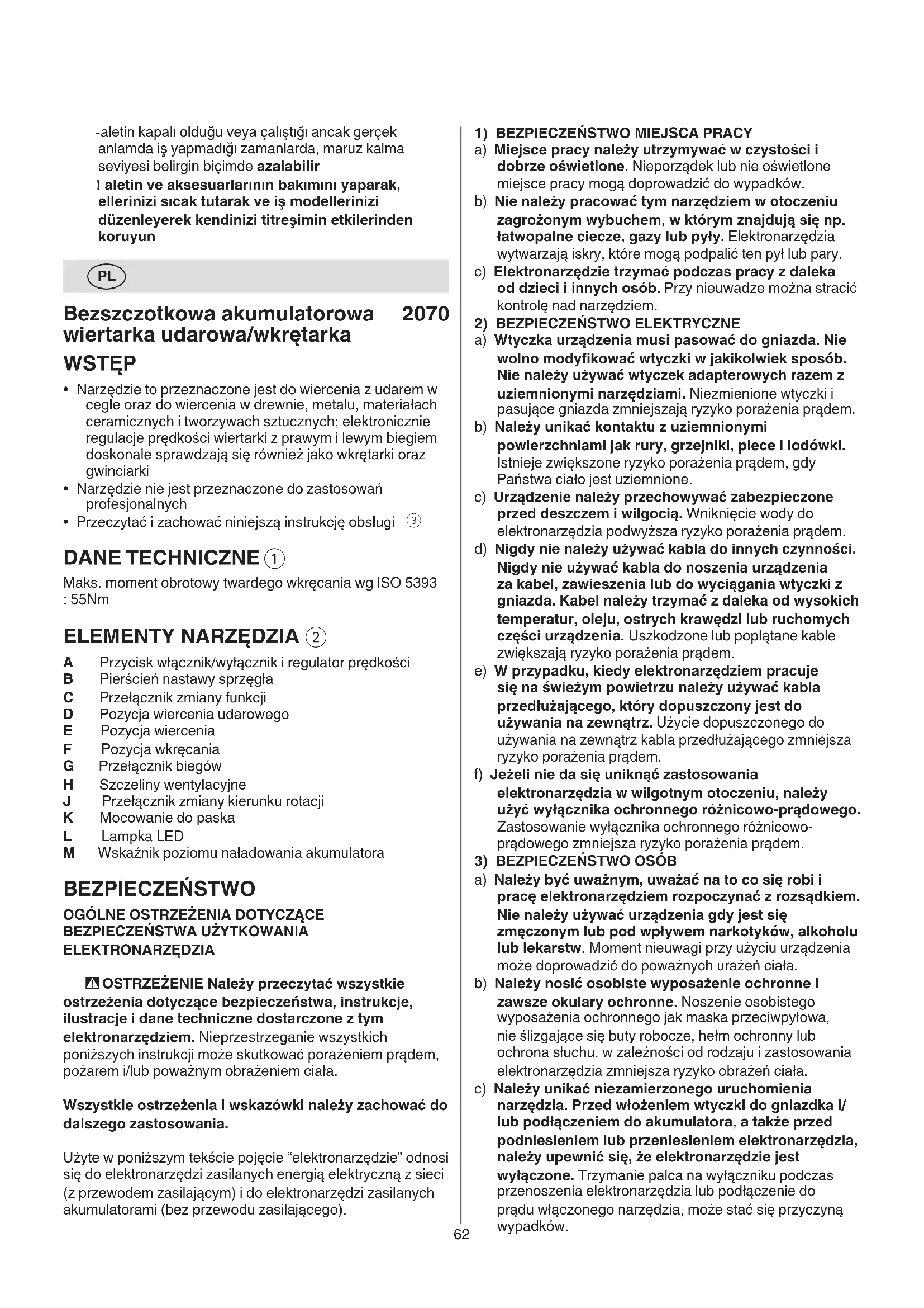 A Przycisk włącznik/wyłącznik i regulator prędkości B Pierścień nastawy sprzęgła C Przełącznik zmiany funkcji D Pozycja wiercenia udarowego E Pozycja wiercenia F Pozycja wkręcania G Przełącznik biegów H Szczeliny wentylacyjne J Przełącznik zmiany kierunku rotacji K Mocowanie do paska L Lampka LED M Wskaźnik poziomu naładowania akumulatora BEZPIECZEŃSTWO