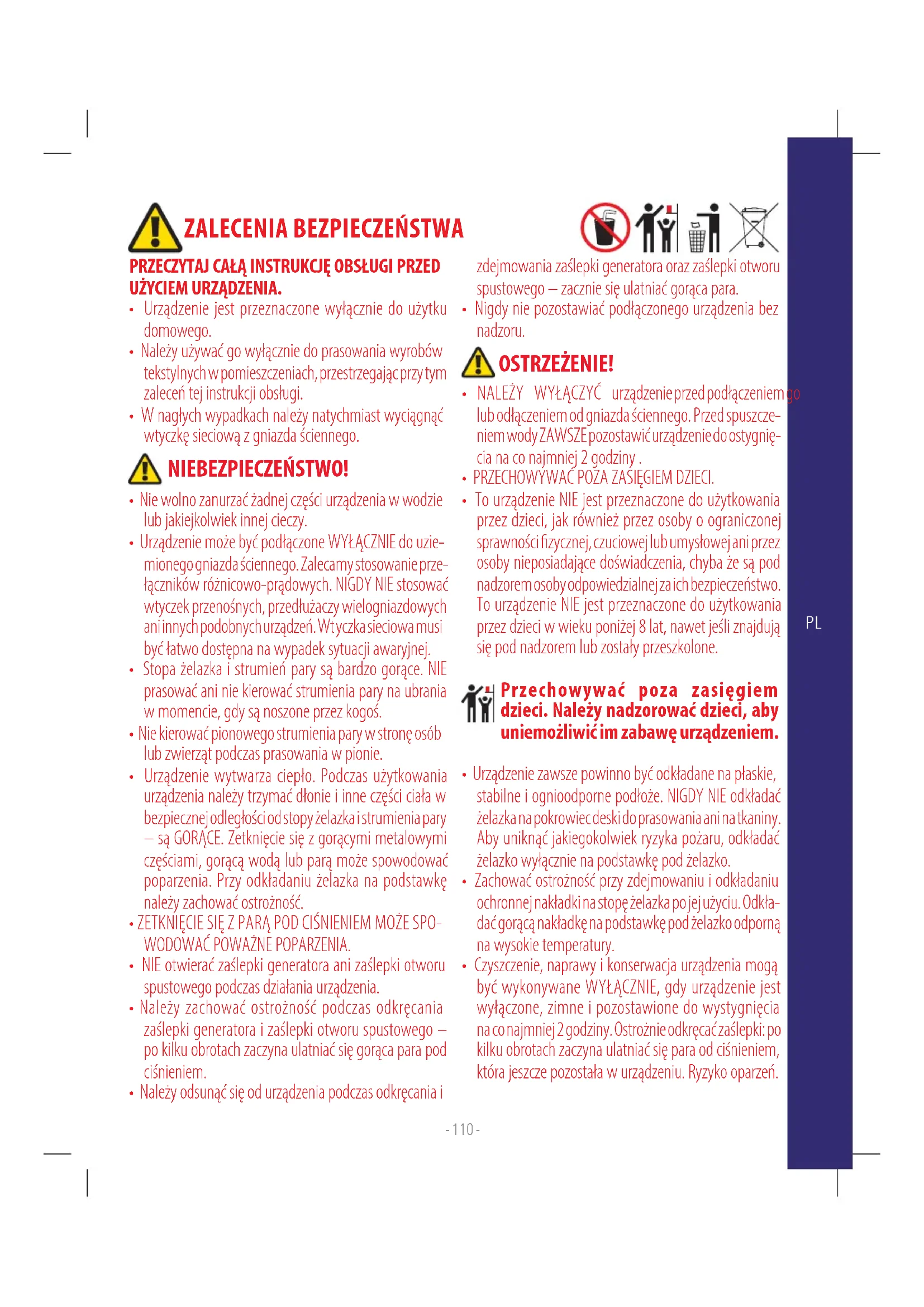 - Czyszczenie, naprawy i konserwacja urządzenia mogą być wykonywane WYŁĄCZNIE, gdy urządzenie jest wyłączone, zimne i pozostawione do wystygnięcia na co najmniej 2 godziny. Ostrożnie odkręcać zaślepki: po kilku obrotach zaczyna ulatniać się para od ciśnieniem, która jeszcze pozostała w urządzeniu. Ryzyko oparzeń. Przechowywać poza zasięgiem dzieci. Należy nadzorować dzieci, aby uniemożliwić im zabawę urządzeniem. OSTRZEŻENIE! NIEBEZPIECZEŃSTWO! PL- 111 -