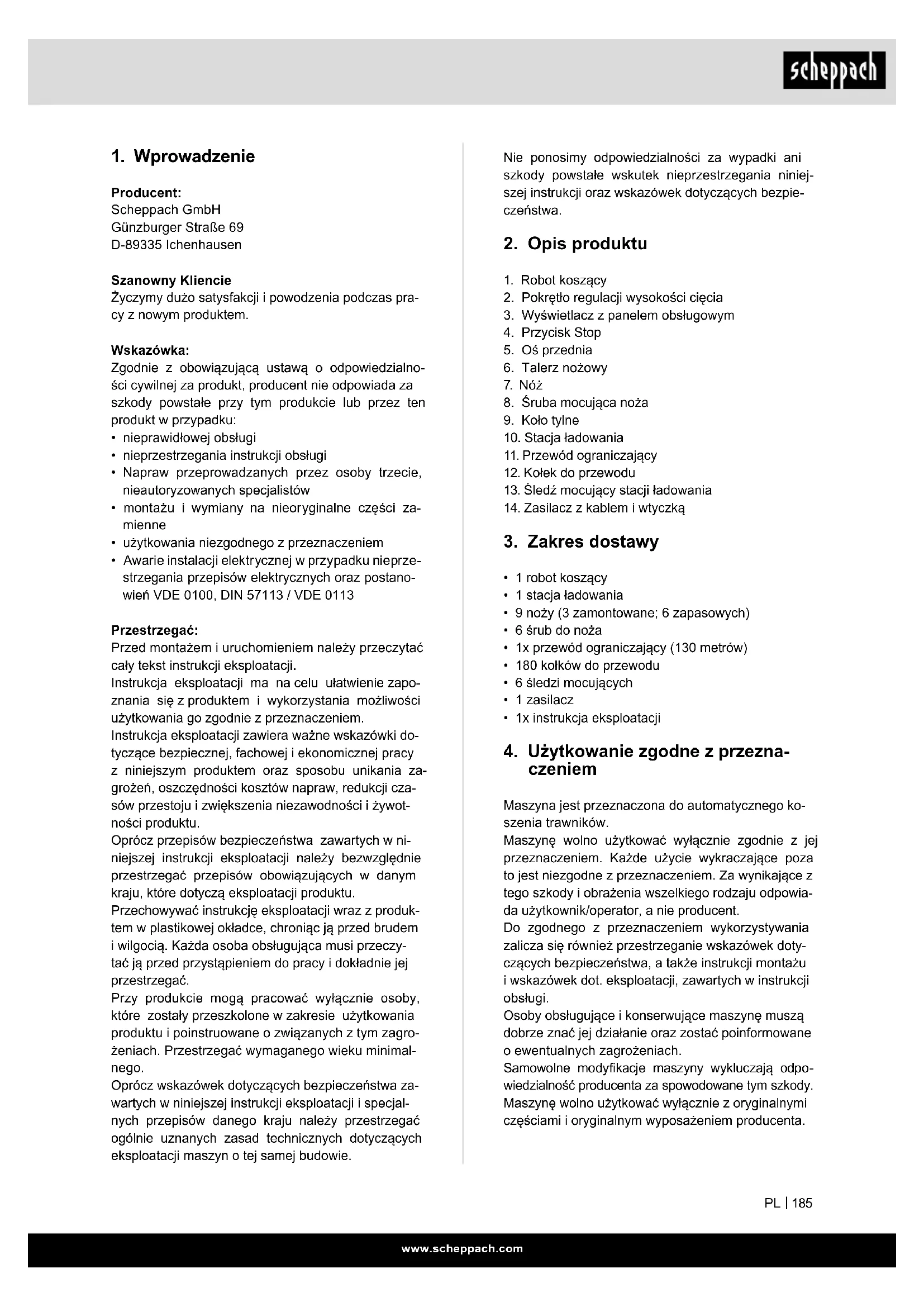 Producent: Scheppach GmbH Günzburger Straße 69 D-89335 Ichenhausen Szanowny Kliencie Życzymy dużo satysfakcji i powodzenia podczas pra- cy z nowym produktem. Wskazówka: Zgodnie z obowiązującą ustawą o odpowiedzialno- ści cywilnej za produkt, producent nie odpowiada za szkody powstałe przy tym produkcie lub przez ten produkt w przypadku: