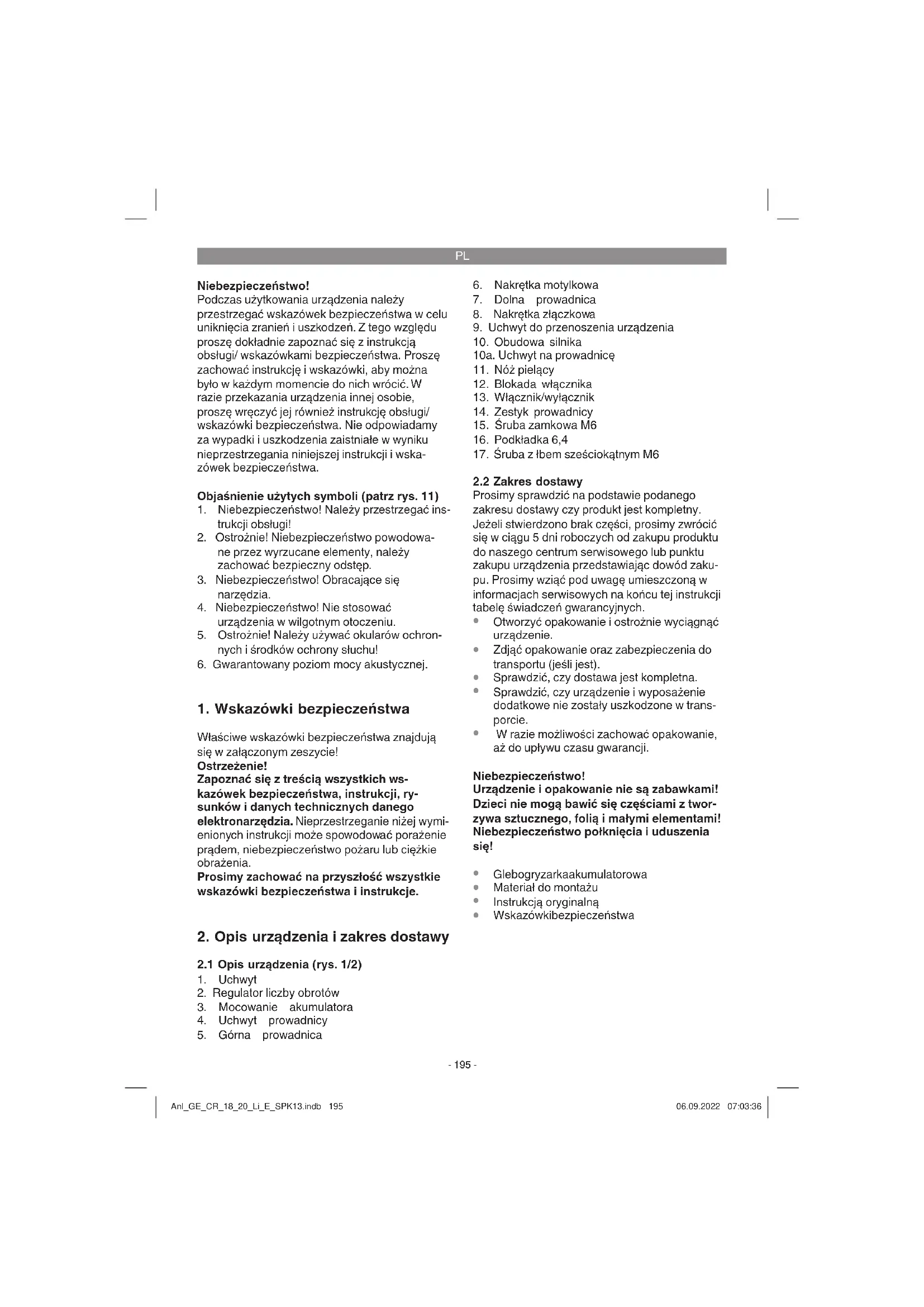 Obracając regulator liczby obrotów (poz. 2) można ustawić żądaną liczbę obrotów (1 = najniższa / 6 = najwyższa) noży pielący ch (rys. 1 / poz. 11). W ten sposób można wyregulować pracę urządzenia odpowiednio do obrabianej gle- by. Cyfry 2 - 5 umieszczone na regulatorze liczby obrotów mają charakter orientacyjny i mają na celu ułatwić wybór odpowiedniej liczby obrotów. Powtórzyć kilkukrotnie ten proces (6.1-6.3), aby upewnić się, że urządzenie działa prawidłowo. Anl_GE_CR_18_20_Li_E_SPK13.indb 198Anl_GE_CR_18_20_Li_E_SPK13.indb 198 06.09.2022 07:03:3706.09.2022 07:03:37PL