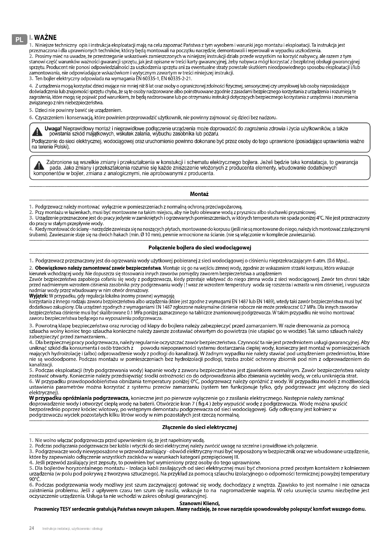 Izolacja kabli zasilających od sieci elektrycznej musi być chroniona przed prostym kontaktem z kołnierzem urządzenia (w polu pod pokrywą z tworzywa sztucznego). Na przykład za pomocą szlauchu izolacyjnego o odporności termicznej powyżej temperatury 90°C. 6. Podczas podgrzewania wody możliwy jest szum zaczynającej gotować się wody, dochodzący z wnętrza. Zjawisko to jest normalne i nie oznacza zaistnienia problemu. Jeśli z upływem czasu ten szum się nasila, wskazuje to na nagromadzenie wapnia. W celu usunięcia szumu niezbędne jest oczyszczenie urządzenia. Usługa ta nie wchodzi w zakres obsługi gwarancyjnej. Szanowni Klienci, Pracownicy TESY serdecznie gratulują Państwa nowym zakupem. Mamy nadzieję, że nowe narzędzie spowodowałoby polepszyć komfort waszego domu.Polski Instrukcja instalacji, użytkowania i obsługi 25