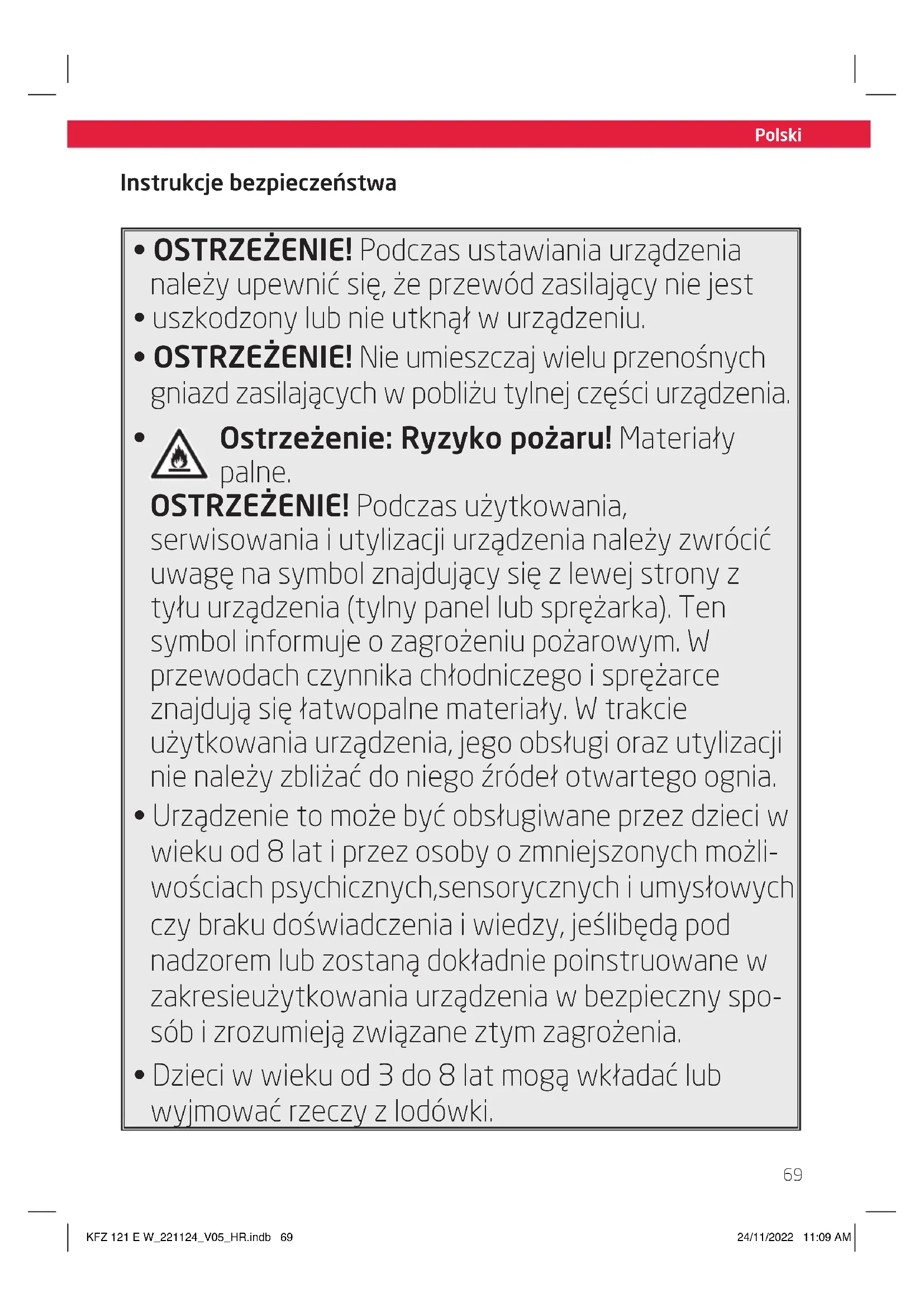 - Dzieci w wieku od 3 do 8 lat mogą wkładać lub wyjmować rzeczy z lodówki. KFZ 121 E W_221124_V05_HR.indb 69KFZ 121 E W_221124_V05_HR.indb 69 24/11/2022 11:09 AM24/11/2022 11:09 AMPolski