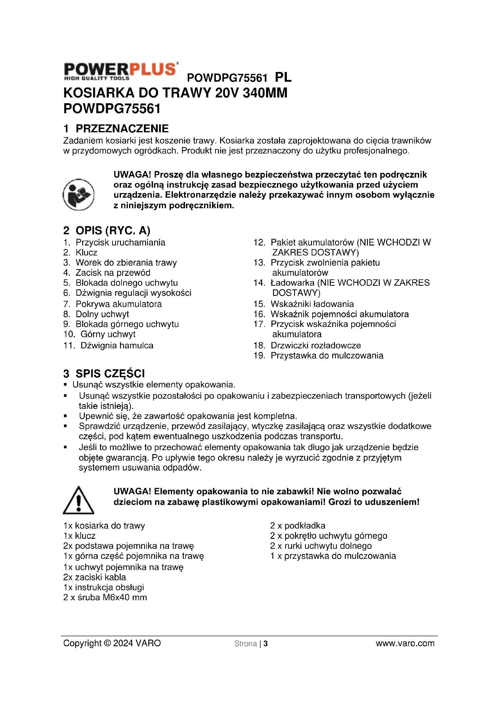 - Jeśli to możliwe to przechować elementy opakowania tak długo jak urządzenie będzie objęte gwarancją. Po upływie tego okresu należy je wyrzucić zgodnie z przyjętym systemem usuwania odpadów. UWAGA! Elementy opakowania to nie zabawki! Nie wolno pozwalać dzieciom na zabawę plastikowymi opakowaniami! Grozi to uduszeniem! 1x kosiarka do trawy 1x klucz 2x podstawa pojemnika na trawę 1x górna część pojemnika na trawę 1x uchwyt pojemnika na trawę 2x zaciski kabla 1x instrukcja obsługi 2 x śruba M6x40 mm 2 x podkładka 2 x pokrętło uchwytu górnego 2 x rurki uchwytu dolnego 1 x przystawka do mulczowaniaPOWDPG75561 PL Copyright © 2024 VARO Strona | 4 www.varo.com W razie braku lub uszkodzenia części, prosimy skontaktować się ze sprzedawcą. 4 OZNACZENIA W niniejszej instrukcji i/lub na urządzeniu użyto następujących symboli: