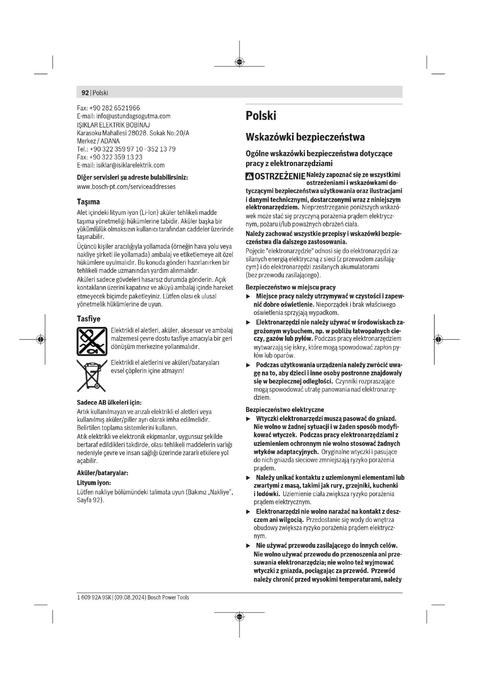 Karasoku Mahallesi 28028. Sokak No:20/A Merkez / ADANA Tel.: +903223599710 -3521379 Fax: +903223591323 E-mail: isiklar@isiklarelektrik.com Diğer servisleri şu adreste bulabilirsiniz: www.bosch-pt.com/serviceaddresses Taşıma Alet içindeki lityum iyon (Li-Ion) aküler tehlikeli madde taşıma yönetmeliği hükümlerine tabidir. Akuler başka bir yukumluluk olmaksızın kullanıcı tarafından caddeler uzerinde taşınabilir. Üçüncü kişiler aracılığıyla yollamada (örneğin hava yolu veya nakliye şirketi ile yollamada) ambalaj ve etiketlemeye ait özel hükümlere uyulmalıdır. Bu konuda gönderi hazırlanırken bir tehlikeli madde uzmanından yardım alınmalıdır. Aküleri sadece gövdeleri hasarsız durumda gönderin. Açık kontakların üzerini kapatınız ve aküyü ambalaj içinde hareket etmeyecek biçimde paketleyiniz. Lutfen olası ek ulusal yönetmelik hukumlerine de uyun. Tasfiye Elektrikli el aletleri, aküler, aksesuar ve ambalaj malzemesi çevre dostu tasfiye amacıyla bir geri dönüşüm merkezine yollanmalıdır. Elektrikli el aletlerini ve aküleri/bataryaları evsel çöplerin içine atmayın! Sadece AB ülkeleri için: Artık kullanılmayan ve arızalı elektrikli el aletleri veya kullanılmış aküler/piller ayrı olarak imha edilmelidir. Belirtilen toplama sistemlerini kullanın. Atık elektrikli ve elektronik ekipmanlar, uygunsuz şekilde bertaraf edildikleri takdirde, olası tehlikeli maddelerin varlığı nedeniyle çevre ve insan sağlığı üzerinde zararlı etkilere yol açabilir. Aküler/bataryalar: Lityum iyon: Lütfen nakliye bölümündeki talimata uyun (Bakınız „Nakliye“, Sayfa92). Polski Wskazówki bezpieczeństwa Ogólne wskazówki bezpieczeństwa dotyczące pracy z elektronarzędziami OSTRZEŻENIE Należy zapoznać się ze wszystkimi ostrzeżeniami i wskazówkami do- tyczącymi bezpieczeństwa użytkowania oraz ilustracjami i danymi technicznymi, dostarczonymi wraz z niniejszym elektronarzędziem. Nieprzestrzeganie poniższych wskazó- wek może stać się przyczyną porażenia prądem elektrycz- nym, pożaru i/lub poważnych obrażeń ciała. Należy zachować wszystkie przepisy i wskazówki bezpie- czeństwa dla dalszego zastosowania. Pojęcie "elektronarzędzie" odnosi się do elektronarzędzi za- silanych energią elektryczną z sieci (z przewodem zasilają- cym) i do elektronarzędzi zasilanych akumulatorami (bezprzewodu zasilającego). Bezpieczeństwo w miejscu pracy u Miejsce pracy należy utrzymywać w czystości i zapew- nić dobre oświetlenie. Nieporządek i brak właściwego oświetlenia sprzyjają wypadkom. u Elektronarzędzi nie należy używać w środowiskach za- grożonym wybuchem, np. w pobliżu łatwopalnych cie- czy, gazów lub pyłów. Podczas pracy elektronarzędziem wytwarzają się iskry, które mogą spowodować zapłon py- łów lub oparów. u Podczas użytkowania urządzenia należy zwrócić uwa- gę na to, aby dzieci i inne osoby postronne znajdowały się w bezpiecznej odległości. Czynniki rozpraszające mogą spowodować utratę panowania nad elektronarzę- dziem. Bezpieczeństwo elektryczne u Wtyczki elektronarzędzi muszą pasować do gniazd. Nie wolno w żadnej sytuacji i w żaden sposób modyfi- kować wtyczek. Podczas pracy elektronarzędziami z uziemieniem ochronnym nie wolno stosować żadnych wtyków adaptacyjnych. Oryginalne wtyczki i pasujące do nich gniazda sieciowe zmniejszają ryzyko porażenia prądem. u Należy unikać kontaktu z uziemionymi elementami lub zwartymi z masą, takimi jak rury, grzejniki, kuchenki ilodówki. Uziemienie ciała zwiększa ryzyko porażenia prądem elektrycznym. u Elektronarzędzi nie wolno narażać na kontakt z desz- czem ani wilgocią. Przedostanie się wody do wnętrza obudowy zwiększa ryzyko porażenia prądem elektrycz- nym. u Nie używać przewodu zasilającego do innych celów. Nie wolno używać przewodu do przenoszenia ani prze- suwania elektronarzędzia; nie wolno też wyjmować wtyczki z gniazda, pociągając za przewód. Przewód należy chronić przed wysokimi temperaturami, należy 1 609 92A 9SK | (09.08.2024) Bosch Power ToolsPolski | 93 go trzymać zdala od oleju, ostrych krawędzi i rucho- mych części urządzenia. Uszkodzone lub splątane prze- wody zwiększają ryzyko porażenia prądem elektrycznym. u Używając elektronarzędzia na świeżym powietrzu, na- leży upewnić się, że przedłużacz jest przeznaczony do pracy na zewnątrz. Użycie przedłużacza przeznaczone- go do pracy na zewnątrz zmniejsza ryzyko porażenia prą- dem elektrycznym. u Jeżeli nie ma innej możliwości, niż użycie elektrona- rzędzia w wilgotnym otoczeniu, należy podłączyć je do źródła zasilania wyposażonego w wyłącznik ochronny różnicowoprądowy. Zastosowanie wyłącznika ochron- nego różnicowoprądowego zmniejsza ryzyko porażenia prądem elektrycznym. Bezpieczeństwo osób u Podczas pracy z elektronarzędziem należy zachować czujność, każdą czynność wykonywać ostrożnie i z rozwagą. Nie przystępować do pracy elektronarzę- dziem w stanie zmęczenia lub będąc pod wpływem narkotyków, alkoholu lub leków. Chwila nieuwagi pod- czas pracy może grozić bardzo poważnymi obrażeniami ciała. u Stosować środki ochrony osobistej. Należy zawsze nosić okulary ochronne. Środki ochrony osobistej, np. maska przeciwpyłowa, antypoślizgowe obuwie, kask ochronny czy ochraniacze na uszy, w określonych warun- kach pracy obniżają ryzyko obrażeń ciała. u Należy unikać niezamierzonego uruchomienia narzę- dzia. Przed podłączeniem elektronarzędzia do źródła zasilania i/lub podłączeniem akumulatora, podniesie- niem albo transportem urządzenia, należy upewnić się, że włącznik elektronarzędzia znajduje się w pozy- cji wyłączonej. Przenoszenie elektronarzędzia z palcem opartym na włączniku/wyłączniku lub włożenie do gniaz- da sieciowego wtyczki włączonego narzędzia, może stać się przyczyną wypadk