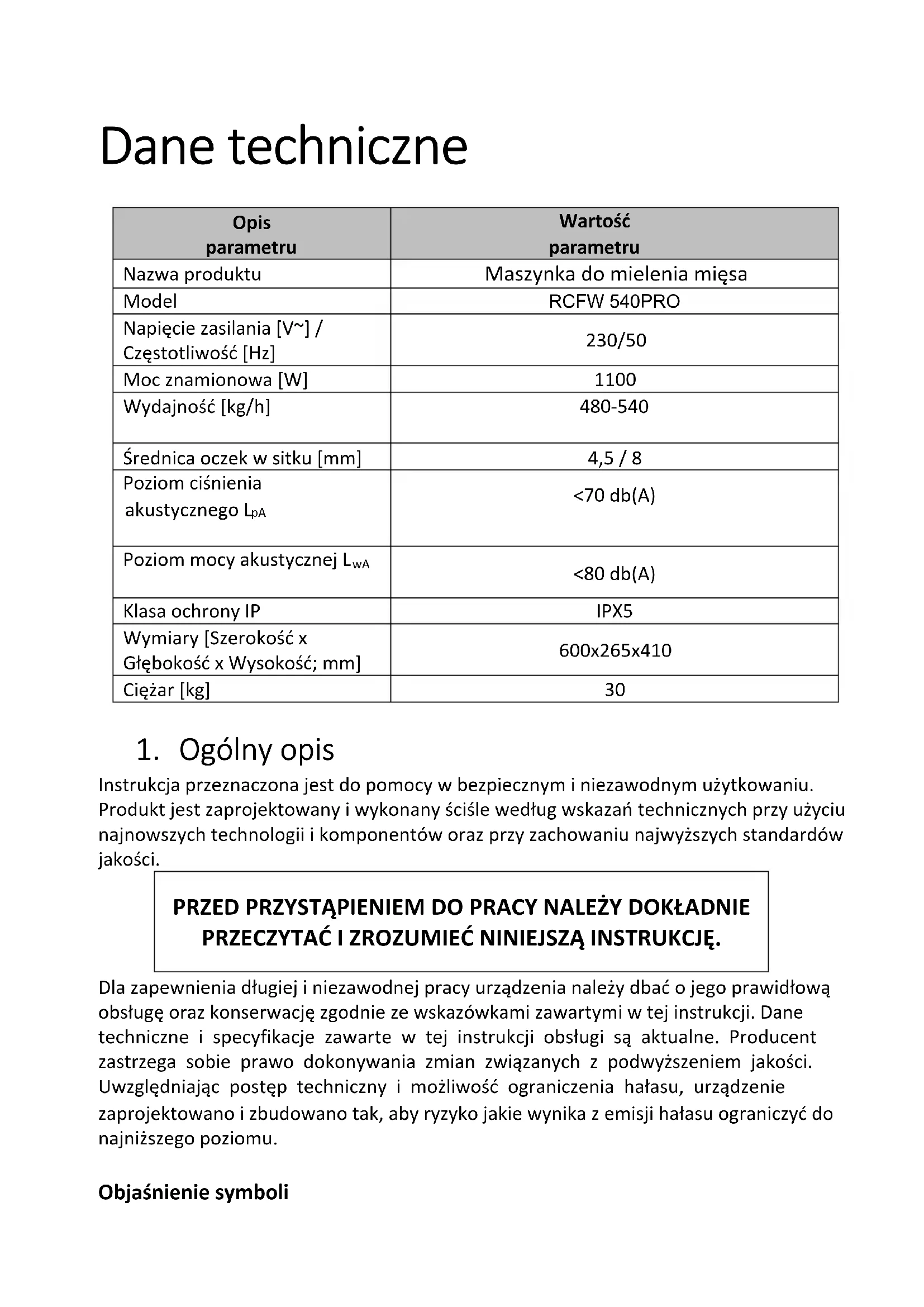 - Always turn off the power with the button and disconnect the machine from the power source before cleaning.Dane techniczne Opis parametru Wartość parametru Nazwa produktu Maszynka do mielenia mięsa Model RCFW 540PRO Napięcie zasilania [V~] / Częstotliwość [Hz] 230/50 Moc znamionowa [W]