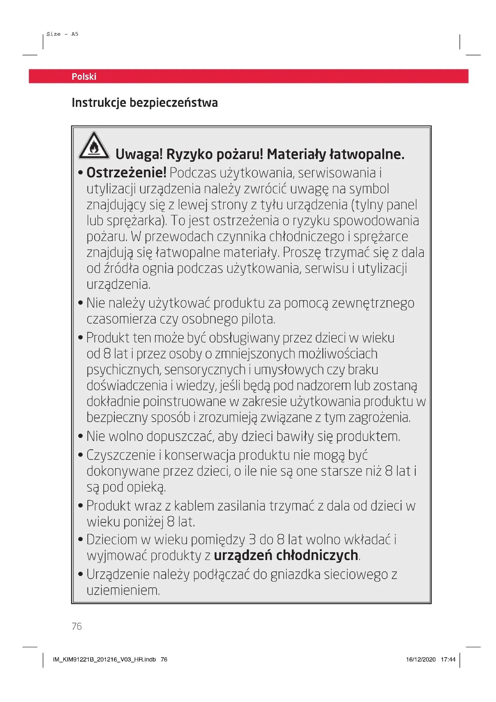 Size - A5 Instrukcje bezpieczeństwa Uwaga! Ryzyko pożaru! Materiały łatwopalne.