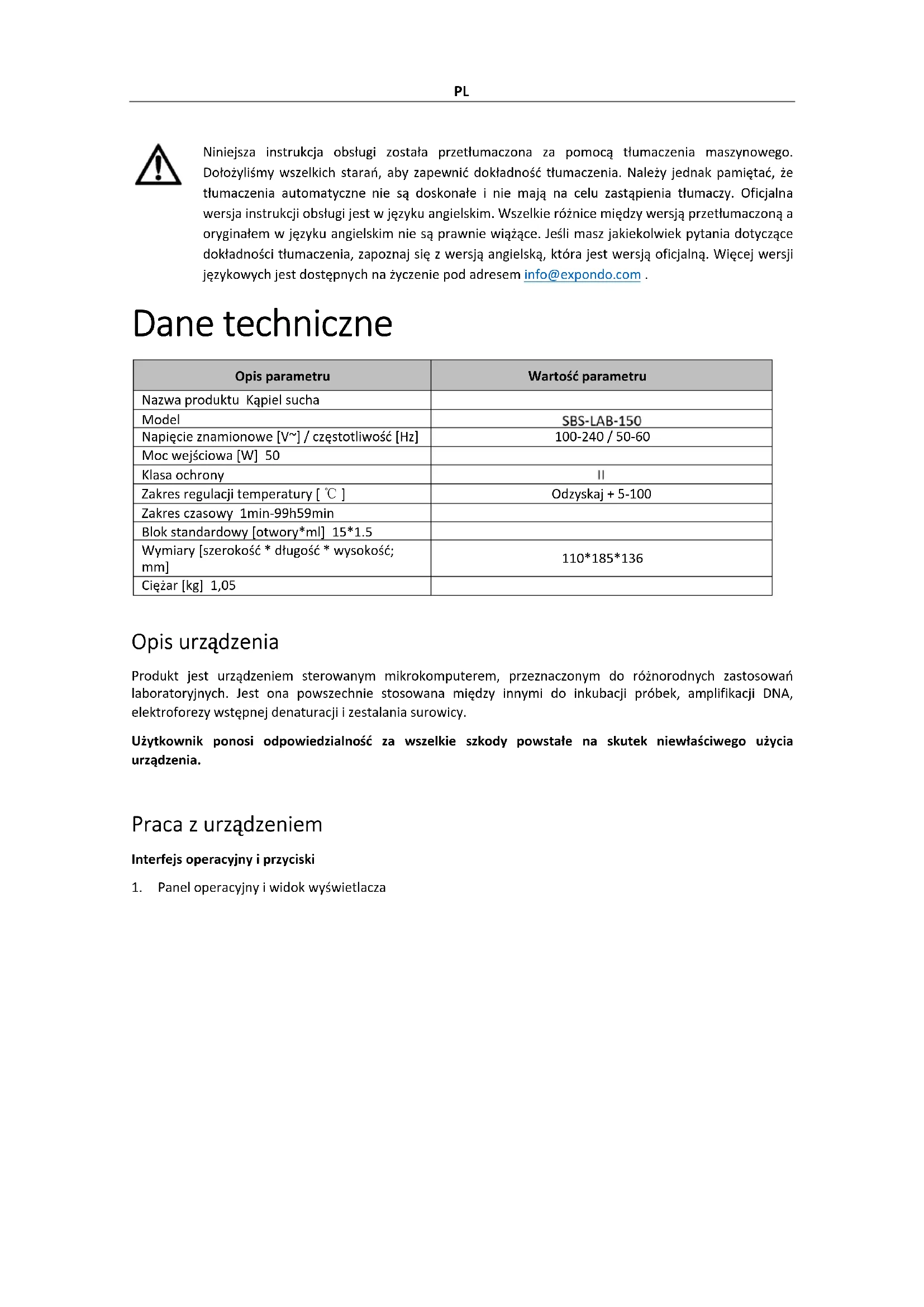 a) Naciśnij przycisk umożliwiający połączenie punktów temperaturowych S1, S2, S3, S4 i S5 w programy połączeń wielopunktowych, takie jak S1-S2, S1-S2-S3, S1-S2-S3-S4 lub S1-S2-S3-S4-S5. OGŁOSZENIE! Punkt temperatury programu wielopunktowego może zaczynać się tylko od S1. b) Np. aby ustawić program połączenia dla S1-S2-S3-S4, naciśnij przycisk. Na wyświetlaczu pojawi się aktualna konfiguracja, gdzie S1 jest węzłem początkowym (którego nie można zmienić), a S2 jest węzłem końcowym (który można modyfikować). Naciśnij przycisk do zmiany S2 na S4. Następnie naciśnij przycisk aby potwierdzić ustawienie. Konfiguracja węzła zostanie wyświetlona jako S1-4, a program będzie przebiegał w sekwencji S1-S2-S3-S4. c) Naciskać Naciśnij przycisk ponownie, aby uruchomić program połączenia czteropunktowego S1-S2-S3-S4.PL Obsługa programu wielopunktowego OGŁOSZENIE! Po wybraniu węzła końcowego możesz nacisnąć przycisk, aby bezpośrednio uruchomić program wielopunktowy. Czyszczenie i konserwacja Do czyszczenia otworów stożkowych w blokach instrumentu należy używać czystej, miękkiej ściereczki zwilżonej niewielką ilością bezwodnego alkoholu. Zapewnia to pełny kontakt i efektywne przewodzenie ciepła pomiędzy probówką a otworami stożkowymi, zapobiegając jednocześnie zanieczyszczeniu. Jeśli na powierzchni instrumentu pojawią się plamy, należy wyczyścić go miękką ściereczką i łagodną pastą czyszczącą. OSTROŻNOŚĆ Przed czyszczeniem urządzenia należy upewnić się, że zasilanie jest wyłączone. NIE WOLNO dopuścić do przedostania się środków czyszcz ących do otworów stożkowych podczas czyszczenia. Unikaj stosowania żrących środków czyszczących na powierzchni instrumentu. Utylizacja zużytych urządzeń Nie wyrzucaj tego urządzenia do miejskich systemów utylizacji odpadów. Oddaj go do punktu zbiórki i recyklingu urządzeń elektrycznych i elektronicznych. Sprawdź symbol na produkcie, instrukcję obsługi i opakowanie. Plastik użyty do budowy urządzenia można poddać recyklingowi zgodnie z jego oznaczeniami. Wybierając recykling, wnosisz znaczący wkład w ochronę naszego środowiska. Aby uzyskać informacje na temat najbliższego zakładu recyklingu, skontaktuj się z lokalnymi władzami.CZ Tato uživatelská příručka byla přeložena pomocí strojového překladu. Vynaložili jsme maximální úsilí, aby byl překlad přesný, ale uvědomte si, že automatické překlady nejsou dokonalé a nejsou určeny k tomu, aby nahradily lidské překladatele. Oficiální verze uživatelské příručky je v angličtině. Jakékoli rozdíly mezi přeloženou verzí a původní angličtinou nejsou právně závazné. Máte-li jakékoli dotazy ohledně přesnosti překladu, podívejte se prosím na anglickou verzi, která je oficiálním odkazem. Další jazykové verze jsou k dispozici na vyžádání na adrese info@expondo.com . Technické údaje Popis parametru Hodnota parametru Stůl pro horní frézku Suchá lázeň Model Jmenovité napětí [V~] / frekvence [Hz] 100-240 / 50-60 Příkon [W] 50 Třída ochrany Rozsah regulace teploty [ ℃ ] RT + 5-100 Rozsah časování 1min-99h59min Standardní blok [otvory*ml] 15*1.5 Rozměry [šířka * délka * výška; mm] 110*185*136 Hmotnost [kg] 1,05 Popis zařízení Produkt je mikropočítačem řízené zařízení určené pro různé laboratorní aplikace. Je široce používán pro inkubaci vzorků, amplifikaci DNA, elektroforézní pre-denaturaci a solidifikaci séra, mimo jiné. Uživatel je odpovědný za jakékoli škody způsobené neúmyslným použitím zařízení. Činnost Operační rozhraní a tlačítka