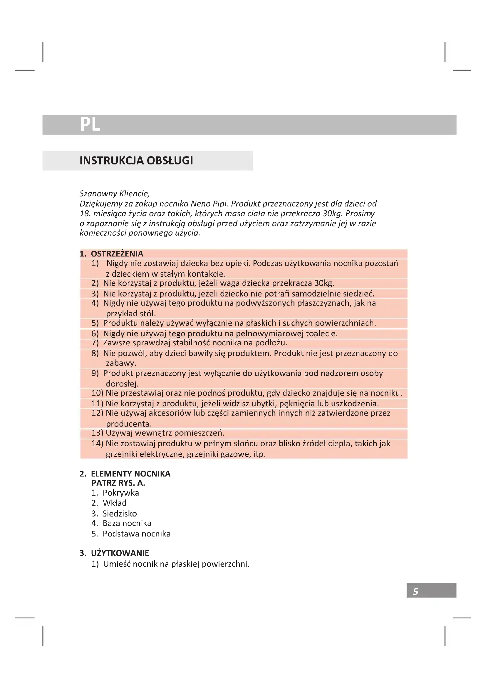 1) Nigdy nie zostawiaj dziecka bez opieki. Podczas użytkowania nocnika pozostań