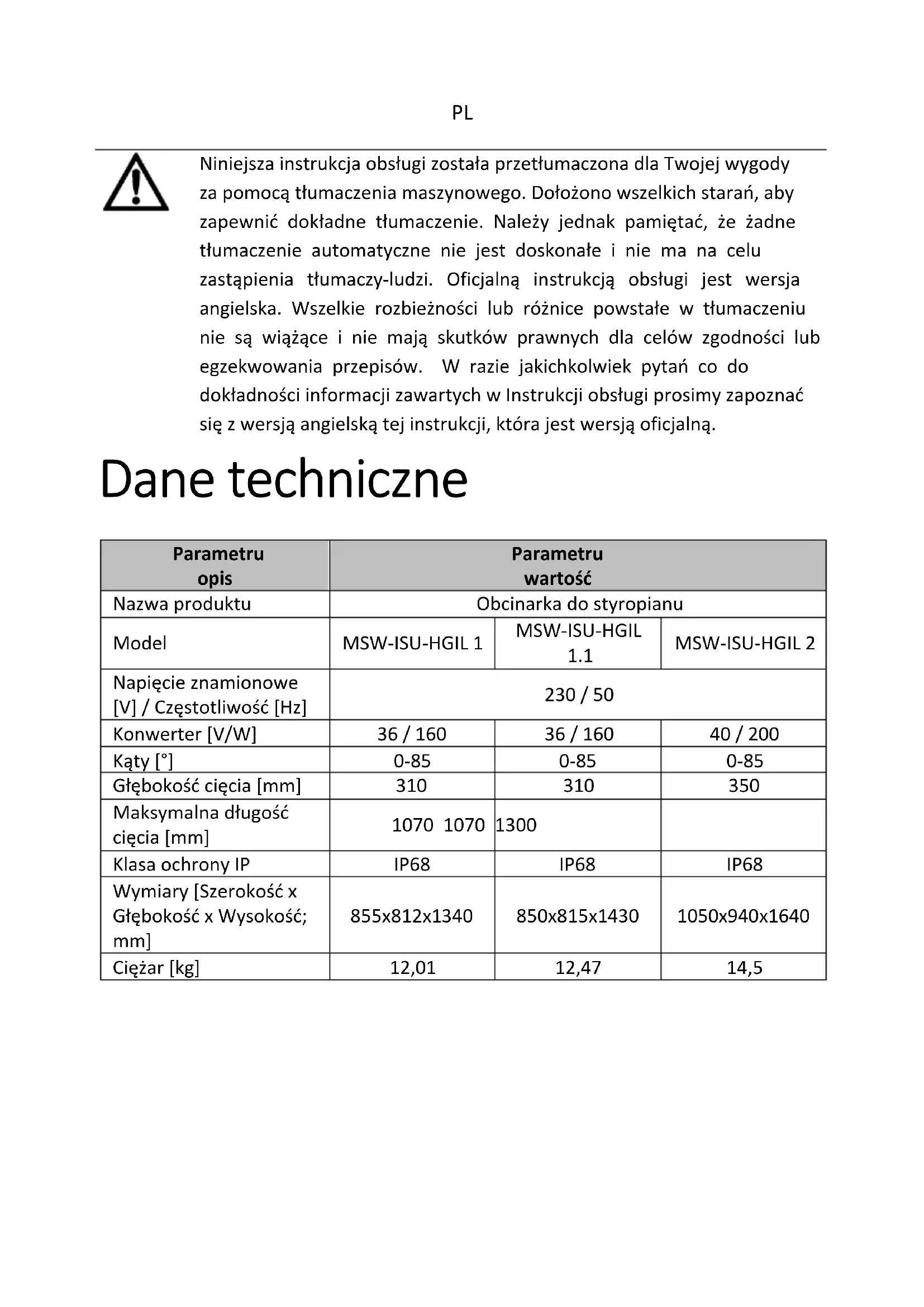Niniejsza instrukcja obsługi została przetłumaczona dla Twojej wygody za pomocą tłumaczenia maszynowego. Dołożono wszelkich starań, aby zapewnić dokładne tłumaczenie. Należy jednak pamiętać, że żadne tłumaczenie automatyczne nie jest doskonałe i nie ma na celu zastąpienia tłumaczy-ludzi. Oficjalną instrukcją obsługi jest wersja angielska. Wszelkie rozbieżności lub różnice powstałe w tłumaczeniu nie są wiążące i nie mają skutków prawnych dla celów zgodności lub egzekwowania przepisów. W razie jakichkolwiek pytań co do dokładności informacji zawartych w Instrukcji obsługi prosimy zapoznać się z wersją angielską tej instrukcji, która jest wersją oficjalną. Dane techniczne Parametru opis Parametru wartość Nazwa produktu Obcinarka do styropianu Model MSW-ISU-HGIL 1 MSW-ISU-HGIL