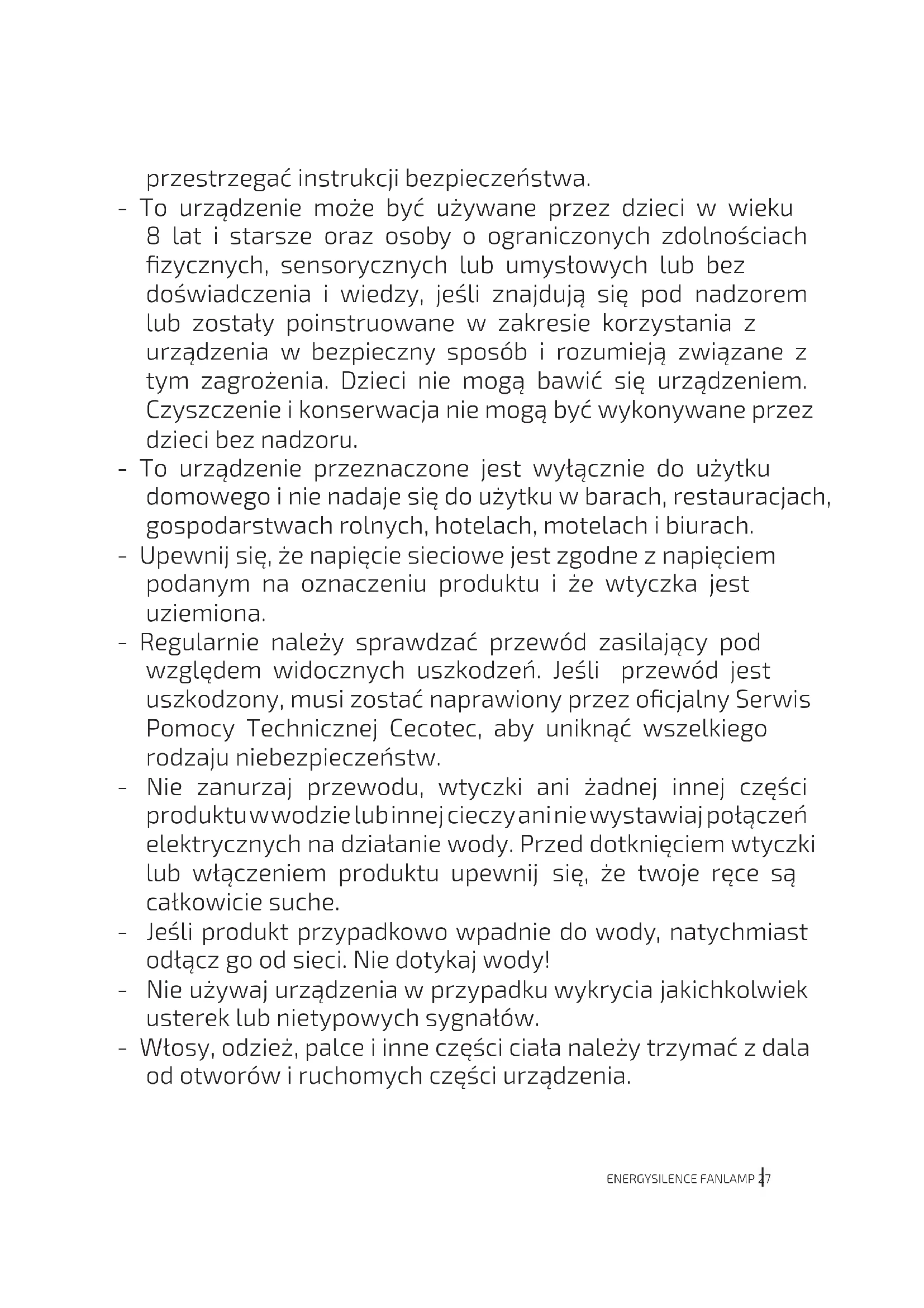 Przed użyciem produktu należy uważnie przeczytać poniższe instrukcje. Zachowaj tę instrukcję do wykorzystania w przyszłości lub dla nowych użytkowników. - Podczas korzystania z produktu należy dokładnieENERGYSILENCE FANLAMP 27 przestrzegać instrukcji bezpieczeństwa. - To urządzenie może być używane przez dzieci w wieku 8 lat i starsze oraz osoby o ograniczonych zdolnościach zycznych, sensorycznych lub umysłowych lub bez doświadczenia i wiedzy, jeśli znajdują się pod nadzorem lub zostały poinstruowane w zakresie korzystania z urządzenia w bezpieczny sposób i rozumieją związane z tym zagrożenia. Dzieci nie mogą bawić się urządzeniem. Czyszczenie i konserwacja nie mogą być wykonywane przez dzieci bez nadzoru. - To urządzenie przeznaczone jest wyłącznie do użytku domowego i nie nadaje się do użytku w barach, restauracjach, gospodarstwach rolnych, hotelach, motelach i biurach. - Upewnij się, że napięcie sieciowe jest zgodne z napięciem podanym na oznaczeniu produktu i że wtyczka jest uziemiona. - Regularnie należy sprawdzać przewód zasilający pod względem widocznych uszkodzeń. Jeśli przewód jest uszkodzony, musi zostać naprawiony przez ocjalny Serwis Pomocy Technicznej Cecotec, aby uniknąć wszelkiego rodzaju niebezpieczeństw. - Nie zanurzaj przewodu, wtyczki ani żadnej innej części produktu w wodzie lub innej cieczy ani nie wystawiaj połączeń elektrycznych na działanie wody. Przed dotknięciem wtyczki lub włączeniem produktu upewnij się, że twoje ręce są całkowicie suche. - Jeśli produkt przypadkowo wpadnie do wody, natychmiast odłącz go od sieci. Nie dotykaj wody! - Nie używaj urządzenia w przypadku wykrycia jakichkolwiek usterek lub nietypowych sygnałów. - Włosy, odzież, palce i inne części ciała należy trzymać z dala od otworów i ruchomych części urządzenia.ENERGYSILENCE FANLAMP28 - Upewnij się, że produkt jest umieszczony na płaskiej i stabilnej powierzchni podczas pracy. - Nie używaj urządzenia w pobliżu okien, ponieważ deszcz może spowodować porażenie prądem. - Nie używaj produktu pod zasłonami lub obok nich. - Nie zakrywaj kratek i nie umieszczaj przewodu produktu pod dywanem lub innymi przedmiotami podczas jego pracy. Zachowaj minimalną odległość 20 cm z każdej strony, z przodu i z tyłu urządzenia. - Wyłącz urządzenie i wyjmij wtyczkę z gniazdka elektrycznego, gdy nie jest używane i przed przeniesieniem go do nowego miejsca. Pociągnij za wtyczkę, aby ją odłączyć, nie ciągnij za przewód. - Nie pozostawiaj urządzenia bez nadzoru podczas użytkowania. - Nie zaleca się używania produktu z przedłużaczami. - Czyszczenie i konserwację produktu należy przeprowadzać zgodnie z niniejszą instrukcją, aby zapewnić prawidłowe działanie urządzenia. - Nadzoruj dzieci, aby nie bawiły się urządzeniem. Konieczny jest ścisły nadzór, jeśli produkt jest używany przez dzieci lub w ich pobliżu. Instrukcje dotyczące baterii: - Nie demontuj, nie otwieraj ani nie niszcz baterii. - Przechowuj baterie poza zasięgiem dzieci. - Przede wszystkim małe baterie należy przechowywać w miejscu niedostępnym dla dzieci. W przypadku połknięcia baterii należy szybko zwrócić się o pomoc medyczną. - Nie wystawiaj baterii na działanie ciepła lub ognia. Unikaj przechowywania baterii w bezpośrednim świetle słonecznym.ENERGYSILENCE FANLAMP 29 - Nie doprowadzać do zwarcia baterii. Nie przechowuj baterii w sposób nieuporządkowany w pudełku lub szuadzie, gdzie mogą się doprowadzić do zwarcia wzajemnie lub za pomocą innych metalowych przedmiotów. - Nie narażaj baterii na uderzenia mechaniczne. - Baterie mogą wyciec w ekstremalnych warunkach. Jeśli z baterii wycieka płyn, nie należy go dotykać. Jeśli płyn wejdzie w kontakt ze skórą, natychmiast przemyj ją mydłem i wodą. Jeśli płyn dostanie się do oczu, natychmiast przemyj je dużą ilością czystej wody przez co najmniej 10 minut i zwróć się o pomoc lekarską. Podczas obchodzenia się z baterią należy nosić rękawiczki i natychmiast zutylizować ją zgodnie z lokalnymi przepisami. - Zwróć uwagę na oznaczenia dodatnie (+) i ujemne (-) na bateriach i pilocie, i upewnij się, że są one używane prawidłowo. - Nie używaj żadnych baterii, które nie są przeznaczone do użytku z tym sprzętem. - Nie używaj baterii różnych marek, pojemności, rozmiarów lub typów w jednym urządzeniu. - Obsługa baterii przez dzieci musi odbywać się pod nadzorem. - W przypadku połknięcia baterii należy natychmiast zwrócić się o pomoc lekarską. - Zawsze kupuj baterie zalecane przez producenta urządzenia. - Baterie należy utrzymywać zawsze czyste i suche. - Oczyść styki baterii czystą, suchą szmatką, jeśli się zabrudzą. - Zachowaj oryginalną dokumentację produktu do wykorzystania w przyszłości. - Używaj baterii tylko zgodnie z ich przeznaczeniem. - W miarę możliwości należy wyjmować baterie z pilota zdalnego sterowania, gdy nie jest on używany. - Prawidłowo zutylizuj baterię.ENERGYSILENCE FANLAMP30