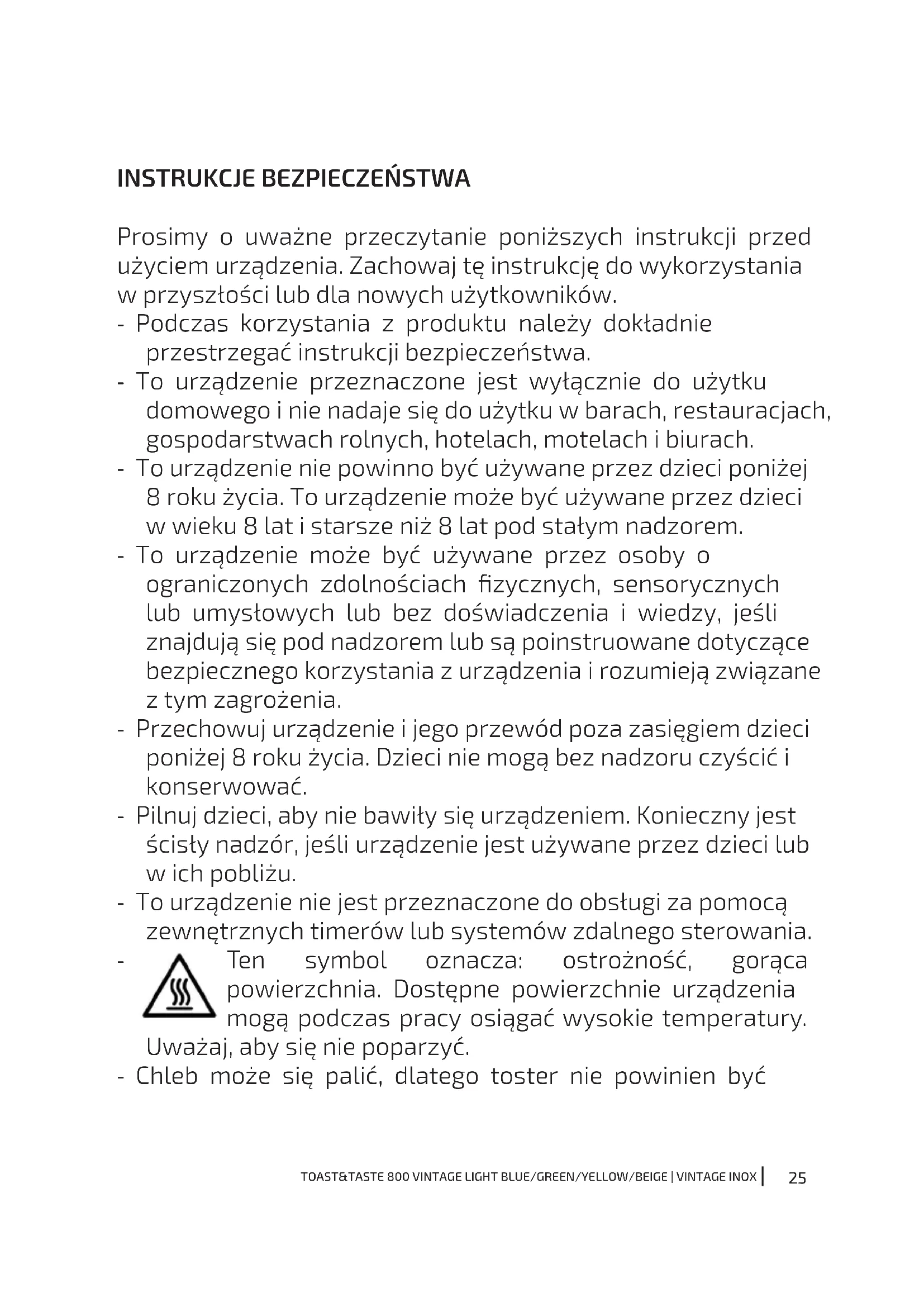 Prosimy o uważne przeczytanie poniższych instrukcji przed użyciem urządzenia. Zachowaj tę instrukcję do wykorzystania w przyszłości lub dla nowych użytkowników. - Podczas korzystania z produktu należy dokładnie przestrzegać instrukcji bezpieczeństwa. - To urządzenie przeznaczone jest wyłącznie do użytku domowego i nie nadaje się do użytku w barach, restauracjach, gospodarstwach rolnych, hotelach, motelach i biurach. - To urządzenie nie powinno być używane przez dzieci poniżej 8 roku życia. To urządzenie może być używane przez dzieci w wieku 8 lat i starsze niż 8 lat pod stałym nadzorem. - To urządzenie może być używane przez osoby o ograniczonych zdolnościach zycznych, sensorycznych lub umysłowych lub bez doświadczenia i wiedzy, jeśli znajdują się pod nadzorem lub są poinstruowane dotyczące bezpiecznego korzystania z urządzenia i rozumieją związane z tym zagrożenia. - Przechowuj urządzenie i jego przewód poza zasięgiem dzieci poniżej 8 roku życia. Dzieci nie mogą bez nadzoru czyścić i konserwować. - Pilnuj dzieci, aby nie bawiły się urządzeniem. Konieczny jest ścisły nadzór, jeśli urządzenie jest używane przez dzieci lub w ich pobliżu. - To urządzenie nie jest przeznaczone do obsługi za pomocą zewnętrznych timerów lub systemów zdalnego sterowania. - Ten symbol oznacza: ostrożność, gorąca powierzchnia. Dostępne powierzchnie urządzenia mogą podczas pracy osiągać wysokie temperatury. Uważaj, aby się nie poparzyć. - Chleb może się palić, dlatego toster nie powinien być26 TOAST&TASTE 800 VINTAGE LIGHT BLUE/GREEN/YELLOW/BEIGE | VINTAGE INOX używany w pobliżu lub pod materiałami palnymi, takimi jak zasłony. - Regularnie należy sprawdzać kabel zsilający pod względem widocznych uszkodzeń. Jeśli kabel jest uszkodzony, musi zostać wymieniony przez ocjalny Serwis Pomocy Technicznej Cecotec, aby uniknąć wszelkiego rodzaju niebezpieczeństw. - Umieść urządzenie na płaskiej, żaroodpornej powierzchni. Nie umieszczaj urządzenia w pobliżu źródeł ciepła, miejsc o dużej wilgotności lub w pobliżu materiałów łatwopalnych. - Nie zanurzaj przewodu, wtyczki ani żadnej części produktu w wodzie lub innych płynach. Nie wystawiać połączeń elektrycznych na działanie wody. Przed dotknięciem wtyczki lub włączeniem urządzenia upewnij się, że Twoje ręce są całkowicie suche. - Upewnij się, że napięcie sieciowe jest zgodne z napięciem podanym na oznaczeniu urządzenia i że wtyczka jest uziemiona. - Nie używaj urządzenia, jeśli przewód, wtyczka lub obudowa są uszkodzone lub jeśli nie działają prawidłowo, zostały upuszczone lub uszkodzone. - Nie nakręcaj, nie zginaj, nie rozciągaj ani nie uszkadzaj kabla zasilającego. Chroń go przed ostrymi krawędziami i źródłami ciepła. Nie pozwól, aby przewód dotykał gorących powierzchni. Nie pozwól aby kabel zbliżył się do krawędzi powierzchni roboczej lub blatu. - Nie pozostawiaj urządzenia bez nadzoru podczas pracy. Odłącz urządzenie od gniazdka elektrycznego po zakończeniu korzystania z niego, po wyjściu z pomieszczenia, w którym znajduje się urządzenie, gdy nie jest używane i przed czyszczeniem. Pociągnij za wtyczkę, aby ją odłączyć, nie ciągnij za kabel.27 TOAST&TASTE 800 VINTAGE LIGHT BLUE/GREEN/YELLOW/BEIGE | VINTAGE INOX - To urządzenie jest przeznaczone wyłącznie do opiekania nie przyprawionego chleba. Nie używaj go do wykonywania innych funkcji i postępuj zgodnie z instrukcjami opisanymi w tej instrukcji. Nie opiekaj w tosterze wilgotnych potraw ani chleba posmarowanego masłem, dżemem, lukrem lub innymi dodatkami, ponieważ może to spowodować pożar lub dym. - Upewnij się, że nad urządzeniem i po obu stronach jest wystarczająco dużo miejsca, aby zapewnić odpowiednią cyrkulację powietrza. - Nie przykrywaj tostera folią aluminiową ani podobnymi materiałami. - Nie wkładaj żadnych przedmiotów (naczyń, palców ani żadnych innych ciał obcych) do urządzenia, ponieważ może to spowodować pożar, porażenie prądem lub obrażenia. - Jeśli urządzenie nie działa prawidłowo lub jeśli zauważysz pożar lub dym, natychmiast wyłącz zasilanie i odłącz urządzenie od gniazdka elektrycznego. - Nie próbuj samodzielnie naprawiać urządzenia. W razie jakichkolwiek pytań skontaktuj się z ocjalną pomocą techniczną Cecotec. - Nie ponosimy odpowiedzialności za ewentualne lub osobiste szkody, które mogą wynikać z niewłaściwego użytkowania urządzenia lub nieprzestrzegania niniejszej instrukcji obsługi.28 TOAST&TASTE 800 VINTAGE LIGHT BLUE/GREEN/YELLOW/BEIGE | VINTAGE INOX