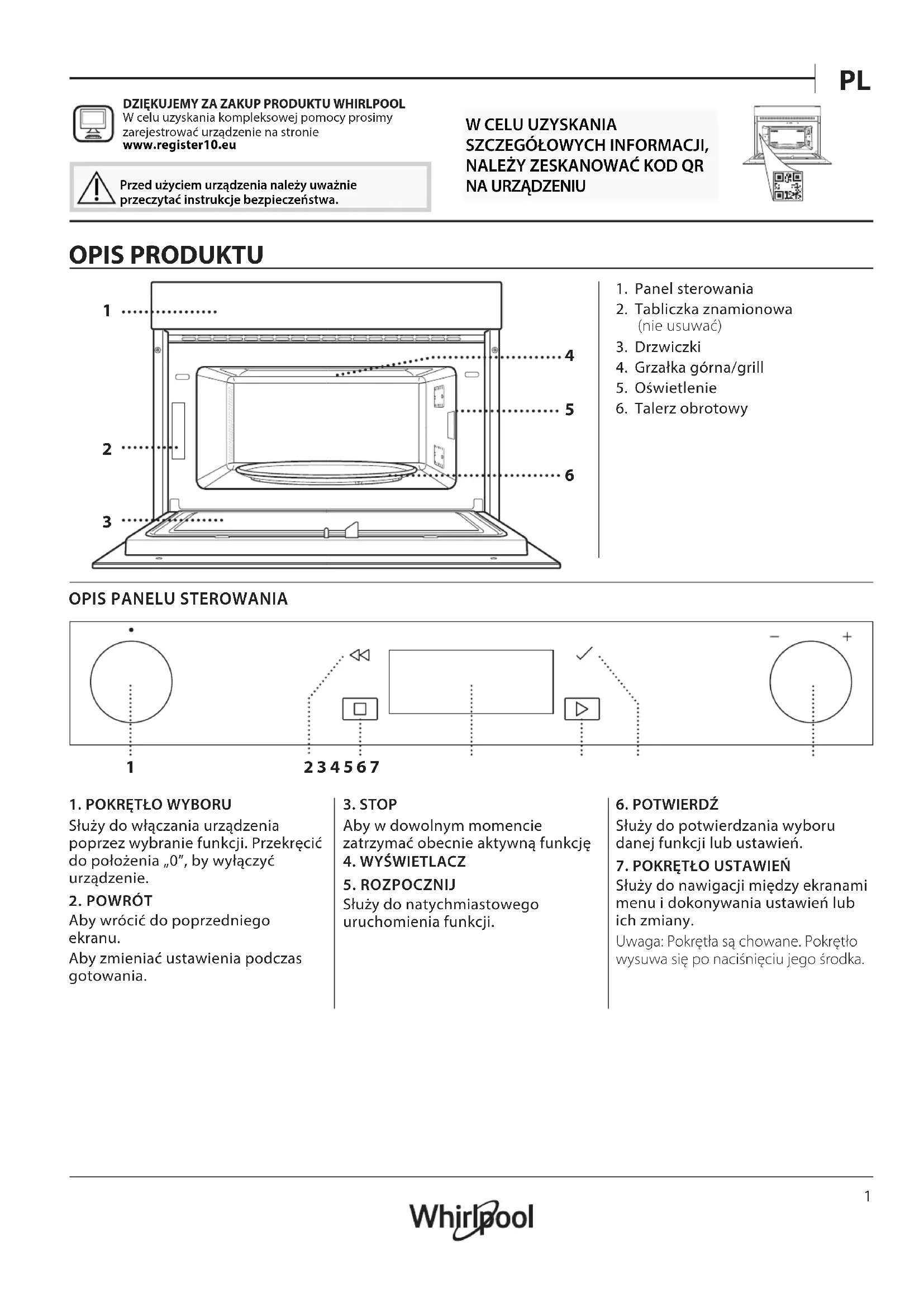 WMD7O4TSG - Kuchenka mikrofalowa WHIRLPOOL - Bezpłatna instrukcja obsługi