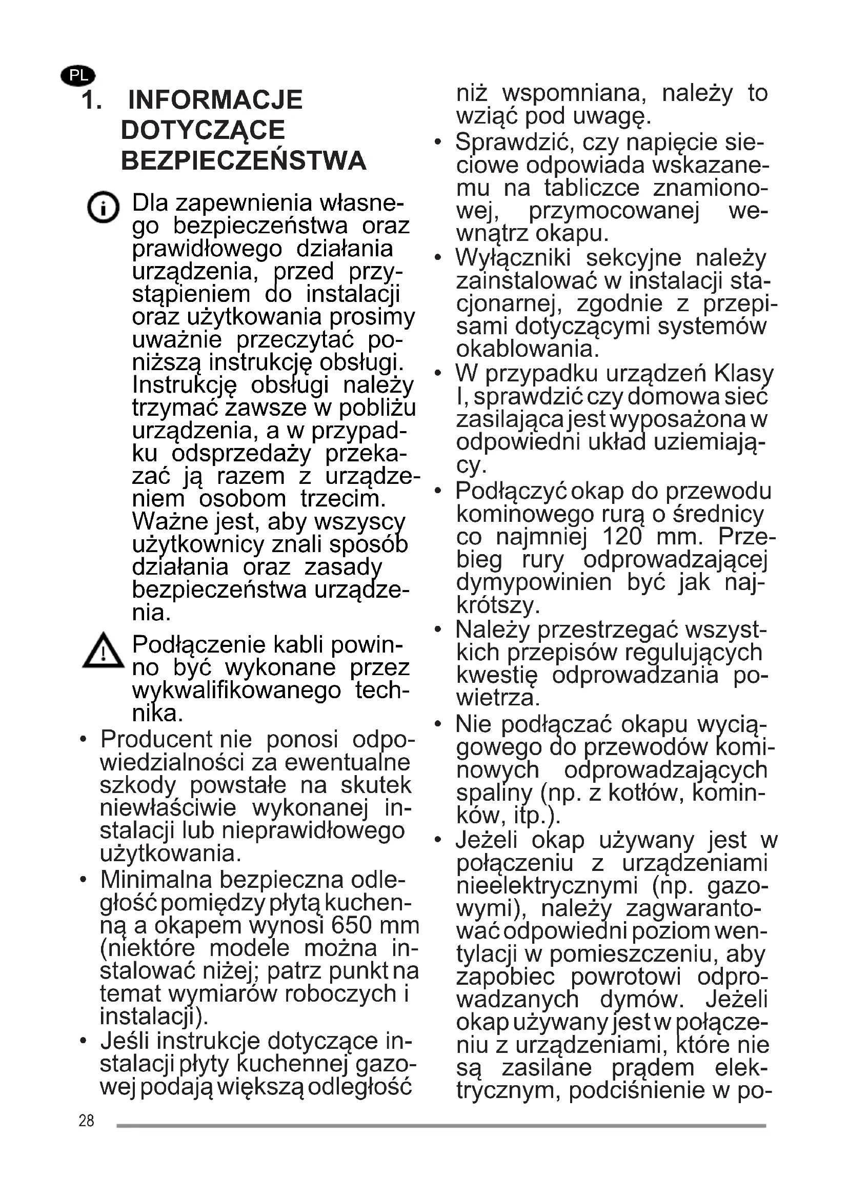 - Jeżeli okap używany jest w połączeniu z urządzeniami nieelektrycznymi (np. gazo- wymi), należy zagwaranto- wać odpowiedni poziom wen- tylacji w pomieszczeniu, aby zapobiec powrotowi odpro- wadzanych dymów. Jeżeli okap używany jest w połącze- niu z urządzeniami, które nie są zasilane prądem elek- trycznym, podciśnienie w po- 28mieszczeniu nie może prze- kraczać 0,04 mbar, aby unik- nąć powrotu dymów z okapu do wnętrza pomieszczenia.