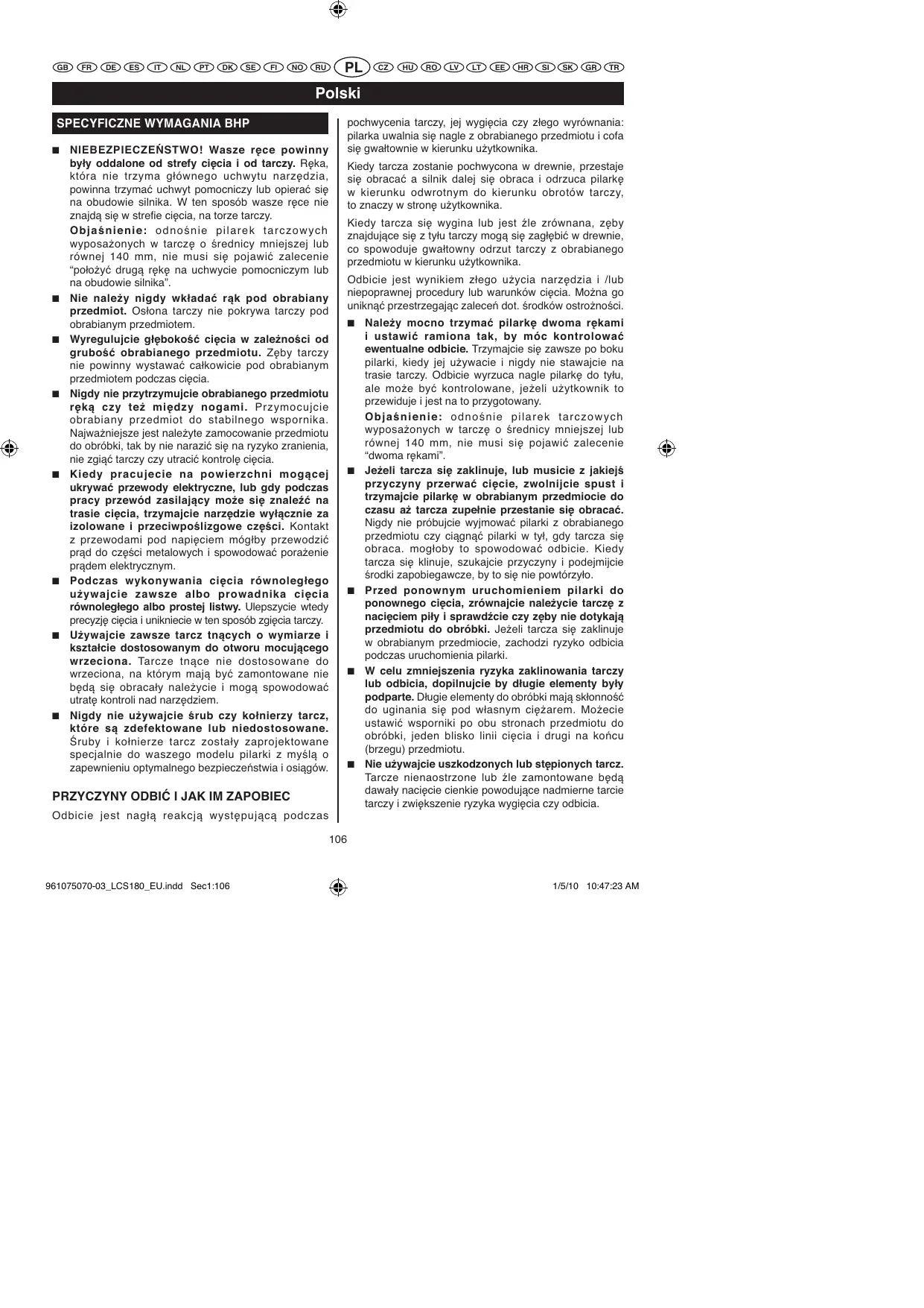 Objasnienie: odnosnie pilarek tarczowych wyposzańych w tarcze o srednicy mnejciej lub rònnej 140 mm, nie musi sie pajawić zalecenie "poloźć druga rękne u ichwycie pomocniczym lub na obudowej silnka".